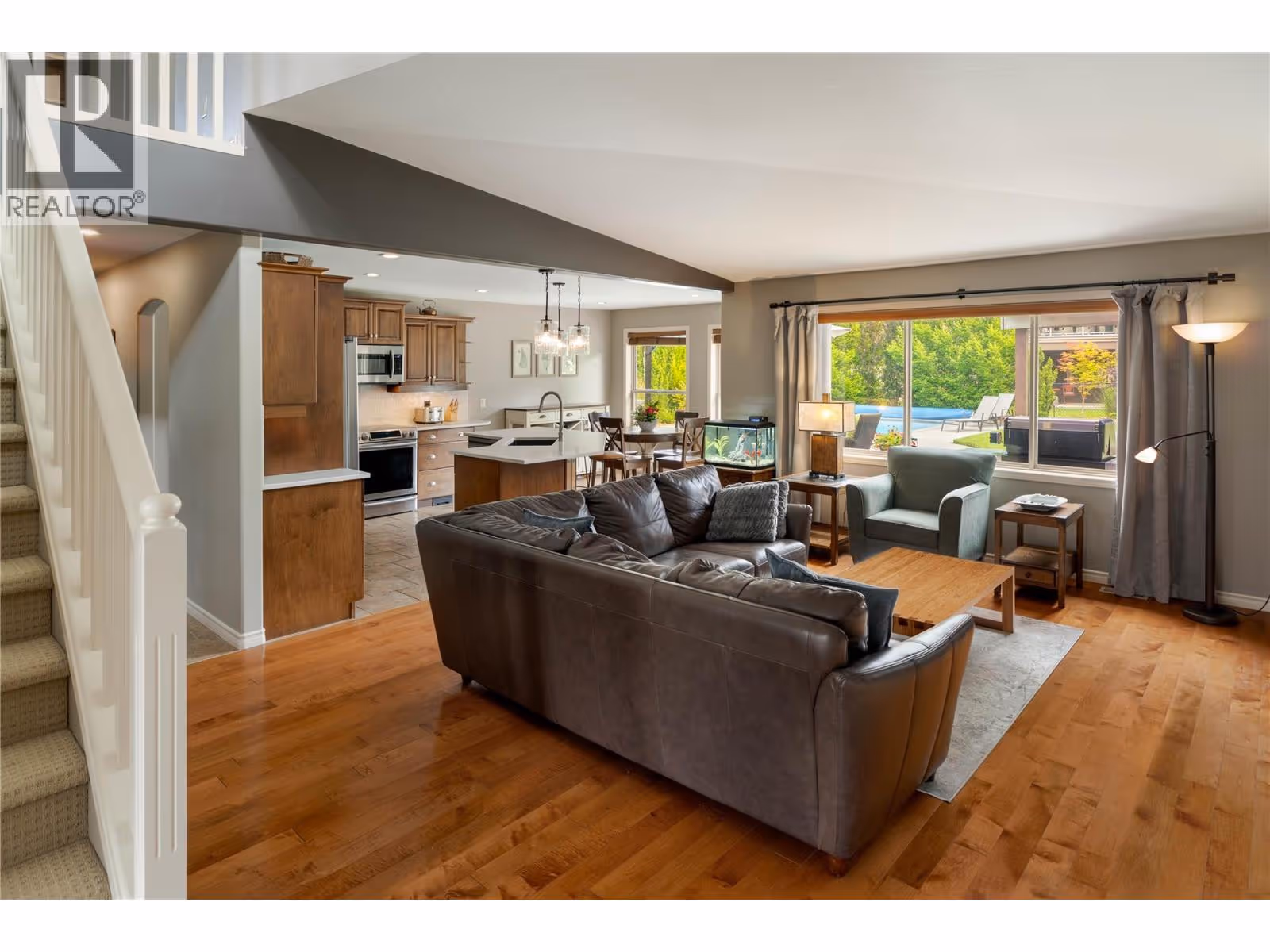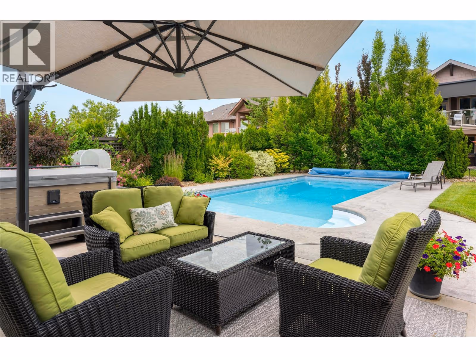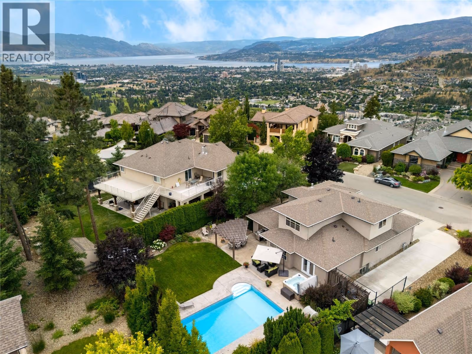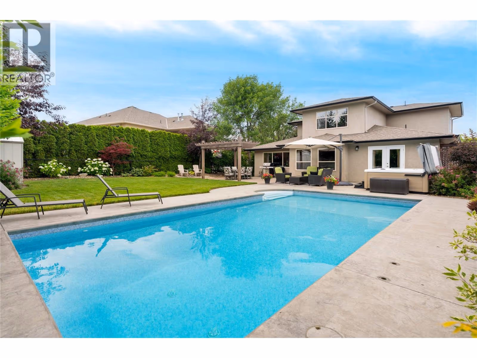 A truly exceptional family retreat in Dilworth Mountain! Positioned on a private 0.24-acre lot, this 3-storey home offers the ultimate Okanagan lifestyle with a seamless blend of indoor comfort & outdoor living. The open-concept main level is ideal for gathering with family & friends, featuring a chef-inspired kitchen with rich wood cabinetry, quartz counters & pantry — all oriented to overlook the sparkling saltwater pool. The bright living room is anchored by a cozy fireplace, while the dining area connects effortlessly to the expansive patio & private backyard oasis. The main floor primary suite is a peaceful retreat with a walk-in closet & spa-inspired ensuite, plus direct access to the hot tub for ultimate relaxation. Upstairs, you'll find two bedrooms, a full bathroom & a versatile den/flex room with charming arched doorways — perfect as a media room, playroom or office. The lower level offers two more bedrooms, a full bath, large family room, gym area & generous storage, providing exceptional flexibility for a growing family or guests. Outside, enjoy an entertainer’s dream backyard with lush lawn, pergola-covered dining space, hot tub & pool — perfect for summer days. Additional highlights include a double garage, RV & boat parking & a thoughtful main-level primary layout. Located minutes to schools, parks, shops, hiking & the lake — this Dilworth Mountain home offers a rare blend of elevated living & daily convenience in one of Kelowna’s most desirable neighbourhoods. (id:58842)