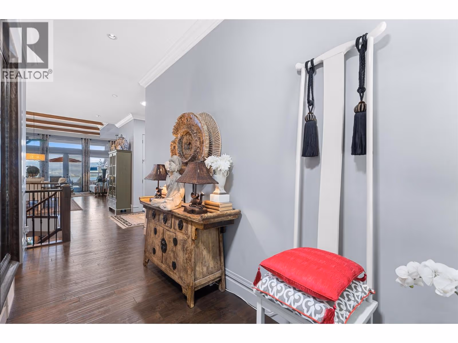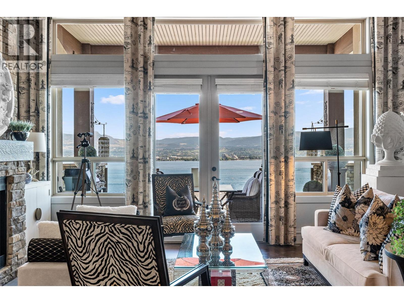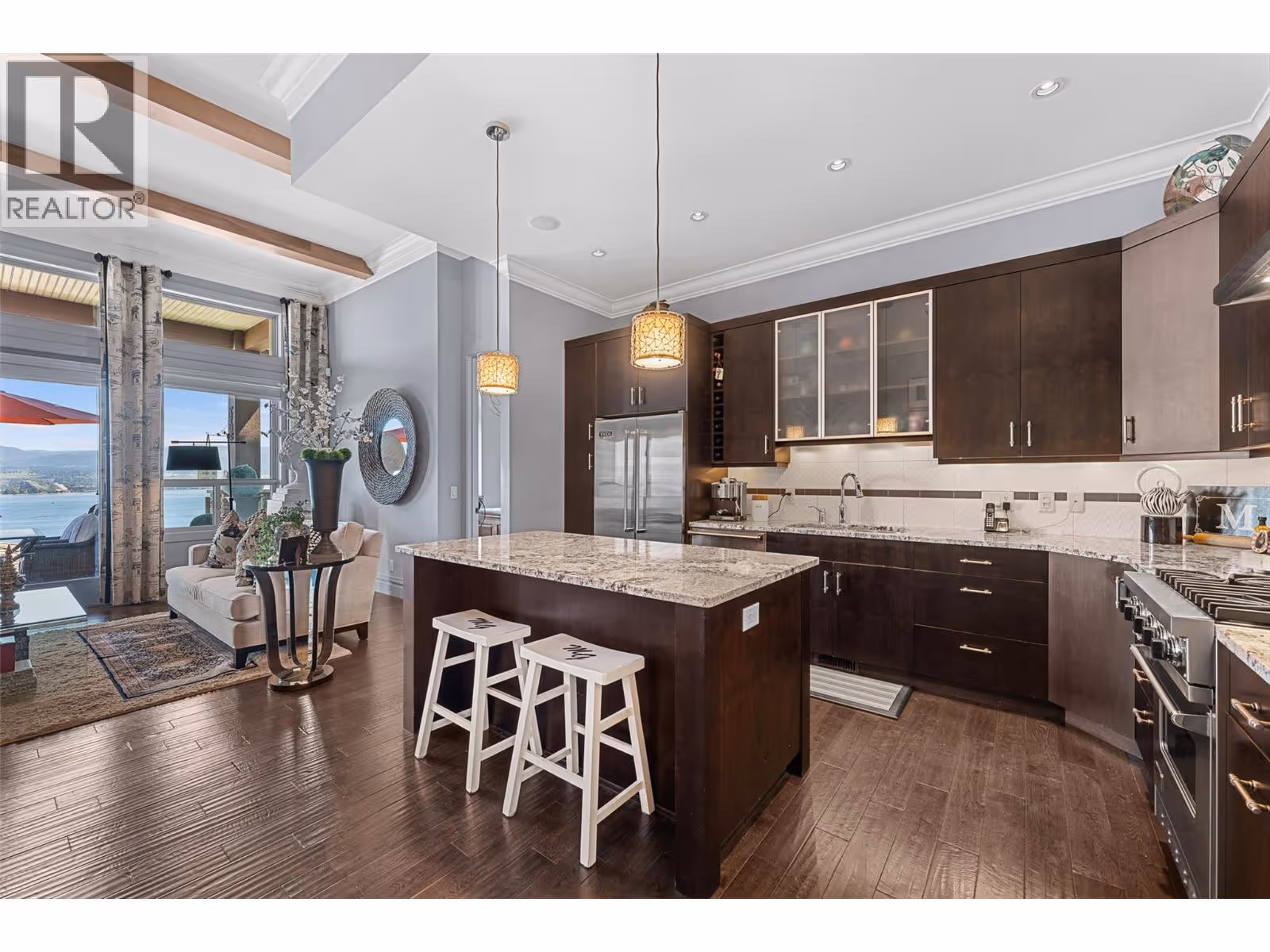 Experience refined Okanagan living in this executive walk-out rancher, showcasing some of the most breathtaking lake and city views in Kelowna. Designed with a wide, open floor plan and soaring ceilings, this residence pairs timeless craftsmanship with modern luxury. Fine finishes on the main floor include engineered hardwood, granite countertops, custom Carolyn Walsh cabinetry, and designer lighting. Great room features exposed beam and a stone-clad gas fireplace and flows seamlessly to the lakeview balcony with unobstructed glass railing and gas BBQ hookup. Tray ceiling with crown moulding in the kitchen. The chef’s kitchen boasts a centre island, professional-grade appliances, and abundant storage. The primary suite offers stunning lake views and a spa-inspired 5-piece ensuite with heated floors, a soaker tub, dual vanities, and glass shower. Library/den with custom shelving. Roughed in for laundry in main level pantry closet. Featuring front double attached garage. An open staircase leads to the lower-level entertaining area with wet bar, and stone fireplace. A spacious second bedroom and full bath. Large laundry room with sink, generous storage, and a private covered patio with grassy area complete the lower level walk-out. With unobstructed views of the bridge, downtown skyline, and Okanagan Lake, this home blends sophistication with the ease of lock-and-leave living. (id:58842)