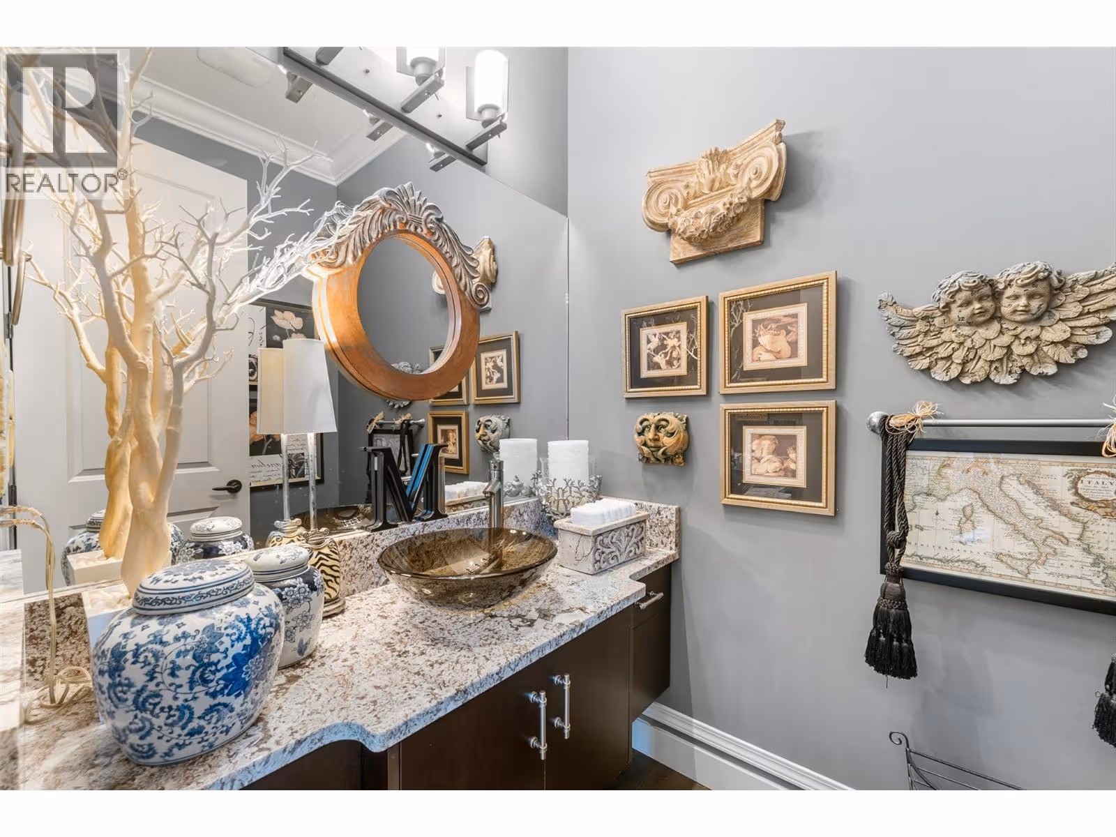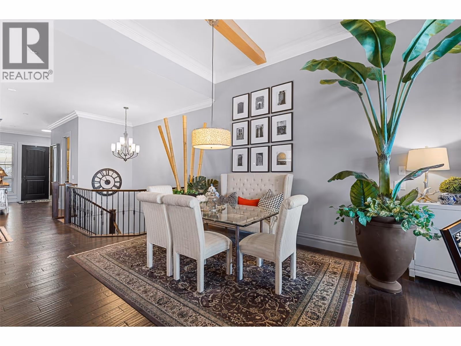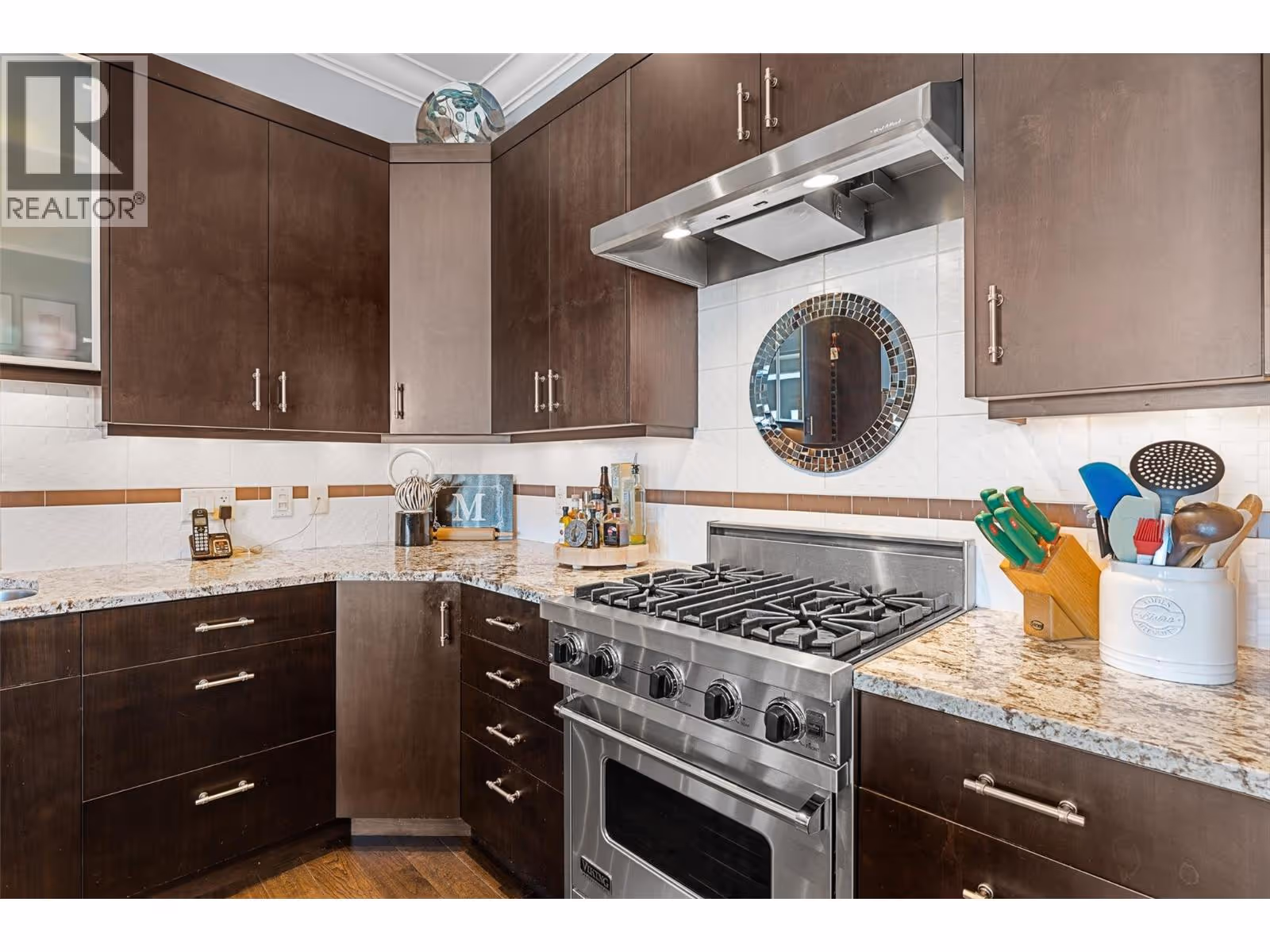 Experience refined Okanagan living in this executive walk-out rancher, showcasing some of the most breathtaking lake and city views in Kelowna. Designed with a wide, open floor plan and soaring ceilings, this residence pairs timeless craftsmanship with modern luxury. Fine finishes on the main floor include engineered hardwood, granite countertops, custom Carolyn Walsh cabinetry, and designer lighting. Great room features exposed beam and a stone-clad gas fireplace and flows seamlessly to the lakeview balcony with unobstructed glass railing and gas BBQ hookup. Tray ceiling with crown moulding in the kitchen. The chef’s kitchen boasts a centre island, professional-grade appliances, and abundant storage. The primary suite offers stunning lake views and a spa-inspired 5-piece ensuite with heated floors, a soaker tub, dual vanities, and glass shower. Library/den with custom shelving. Roughed in for laundry in main level pantry closet. Featuring front double attached garage. An open staircase leads to the lower-level entertaining area with wet bar, and stone fireplace. A spacious second bedroom and full bath. Large laundry room with sink, generous storage, and a private covered patio with grassy area complete the lower level walk-out. With unobstructed views of the bridge, downtown skyline, and Okanagan Lake, this home blends sophistication with the ease of lock-and-leave living. (id:58842)