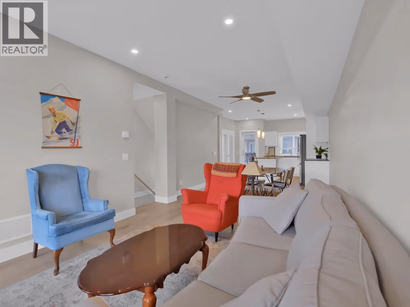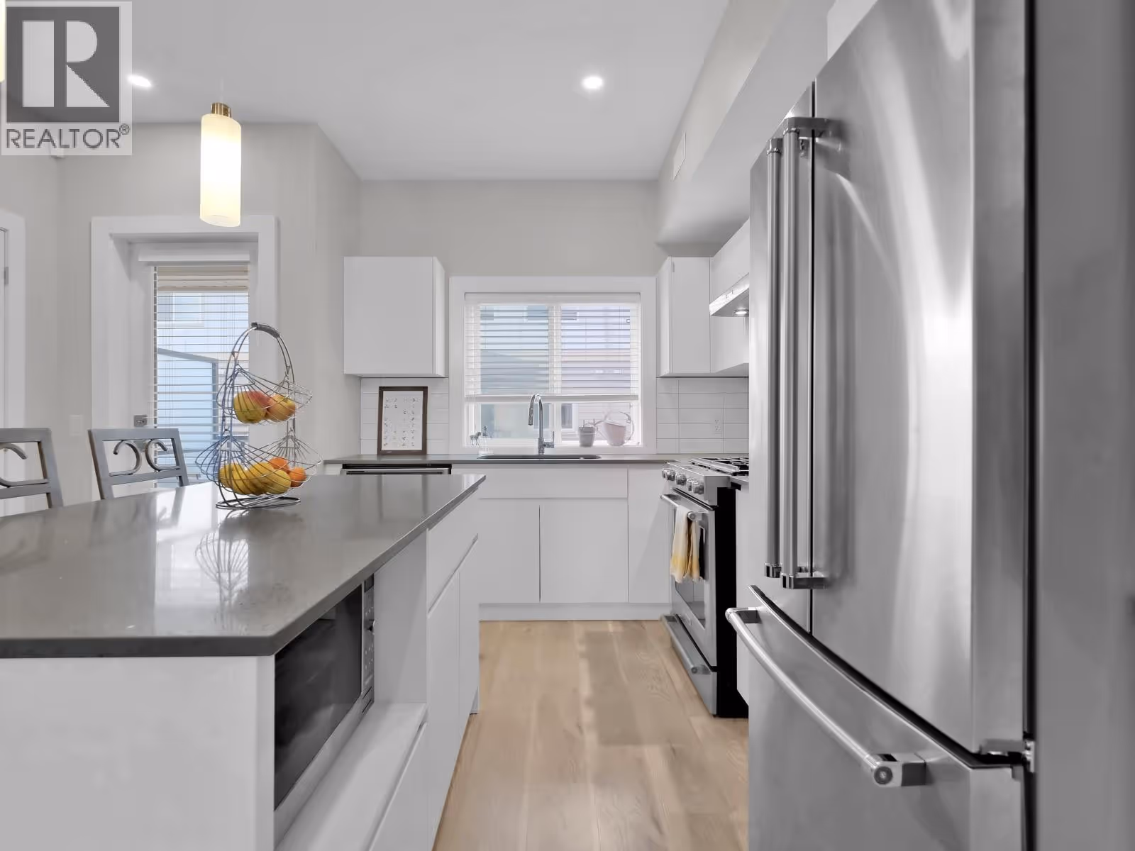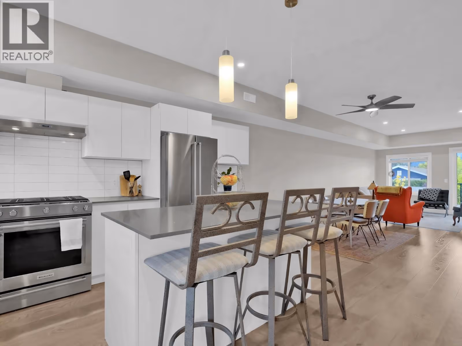 Experience the best of modern living and the Okanagan lifestyle in this bright 3-bedroom, 2.5-bath townhome built in 2019. The open-concept main floor features 9-foot ceilings, abundant natural light, and a designer kitchen with quartz counters, soft-close cabinetry, a gas range, and a large island ideal for gatherings. The oversized primary suite offers a relaxing escape with a walk-in closet and a spa-like ensuite with tile flooring and dual undermount sinks. Three distinct outdoor spaces—two covered decks and a private lower patio—provide perfect spots for morning coffee, BBQs, or winding down after a day outdoors. Upgrades include ceiling fans, an extended patio, and a garage finished with laminate flooring, perfect for a home gym or hobby space. Situated minutes from Mission Creek Park’s hiking and biking trails, yet close to schools, shopping, and amenities, this home offers a seamless balance of convenience and recreation. Whether you’re exploring local trails, enjoying nearby cafes, or entertaining at home, this property puts the Okanagan lifestyle at your doorstep. (id:58842)