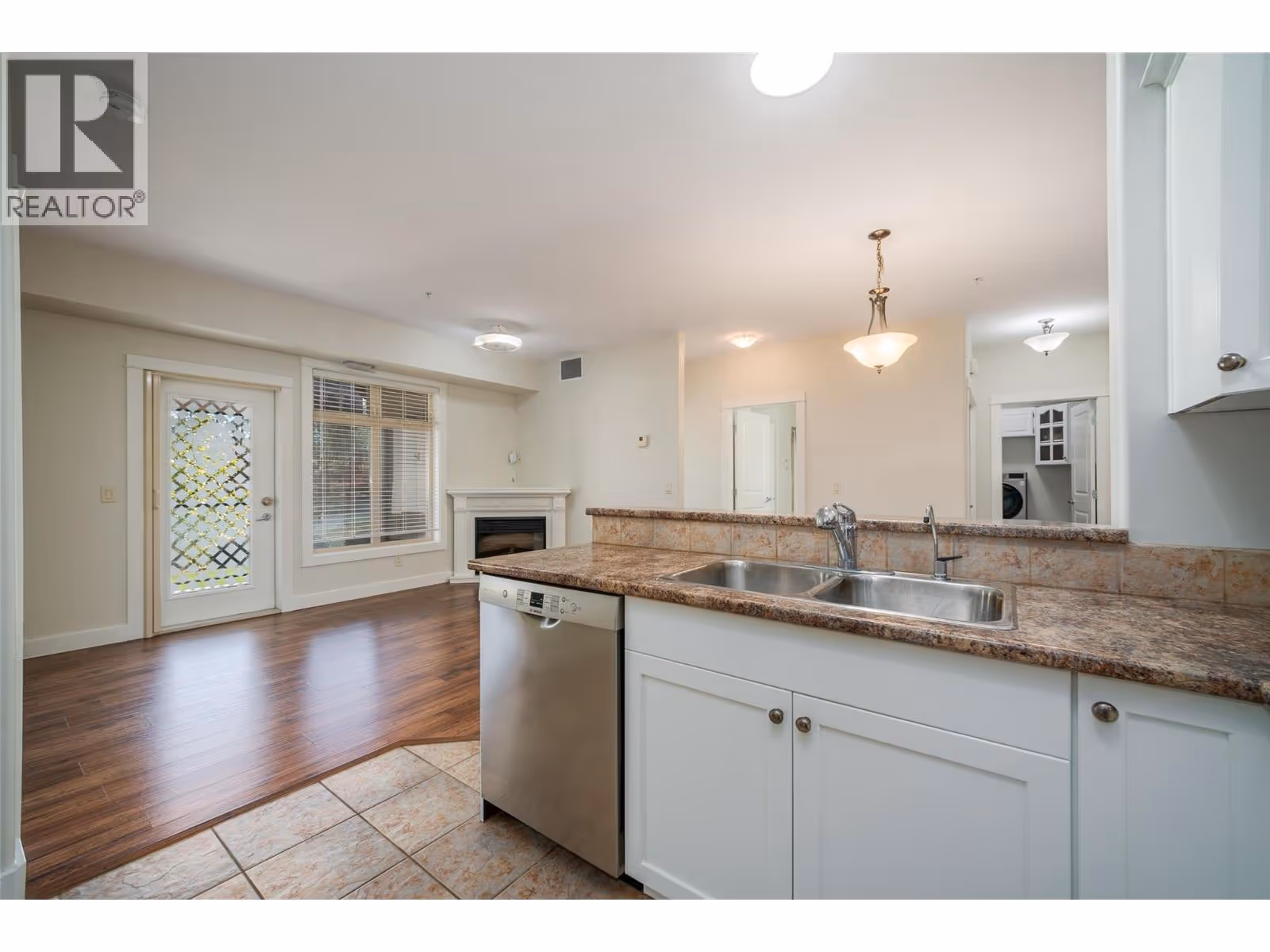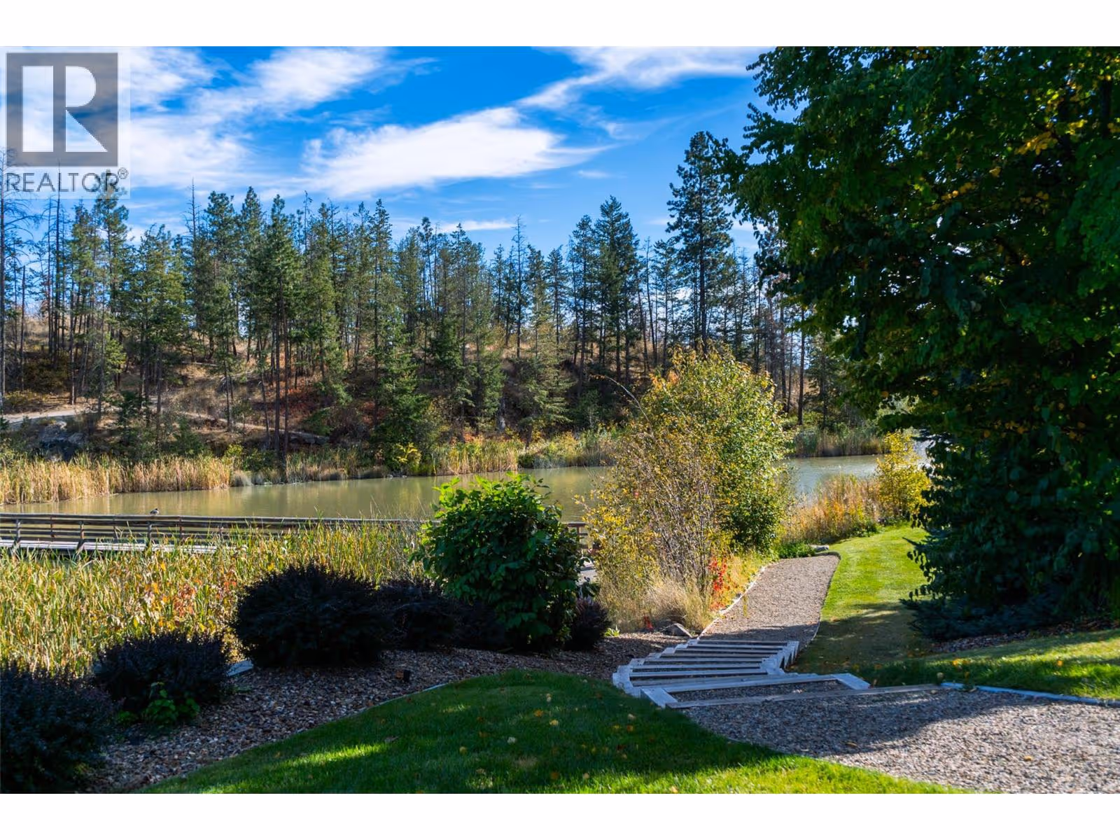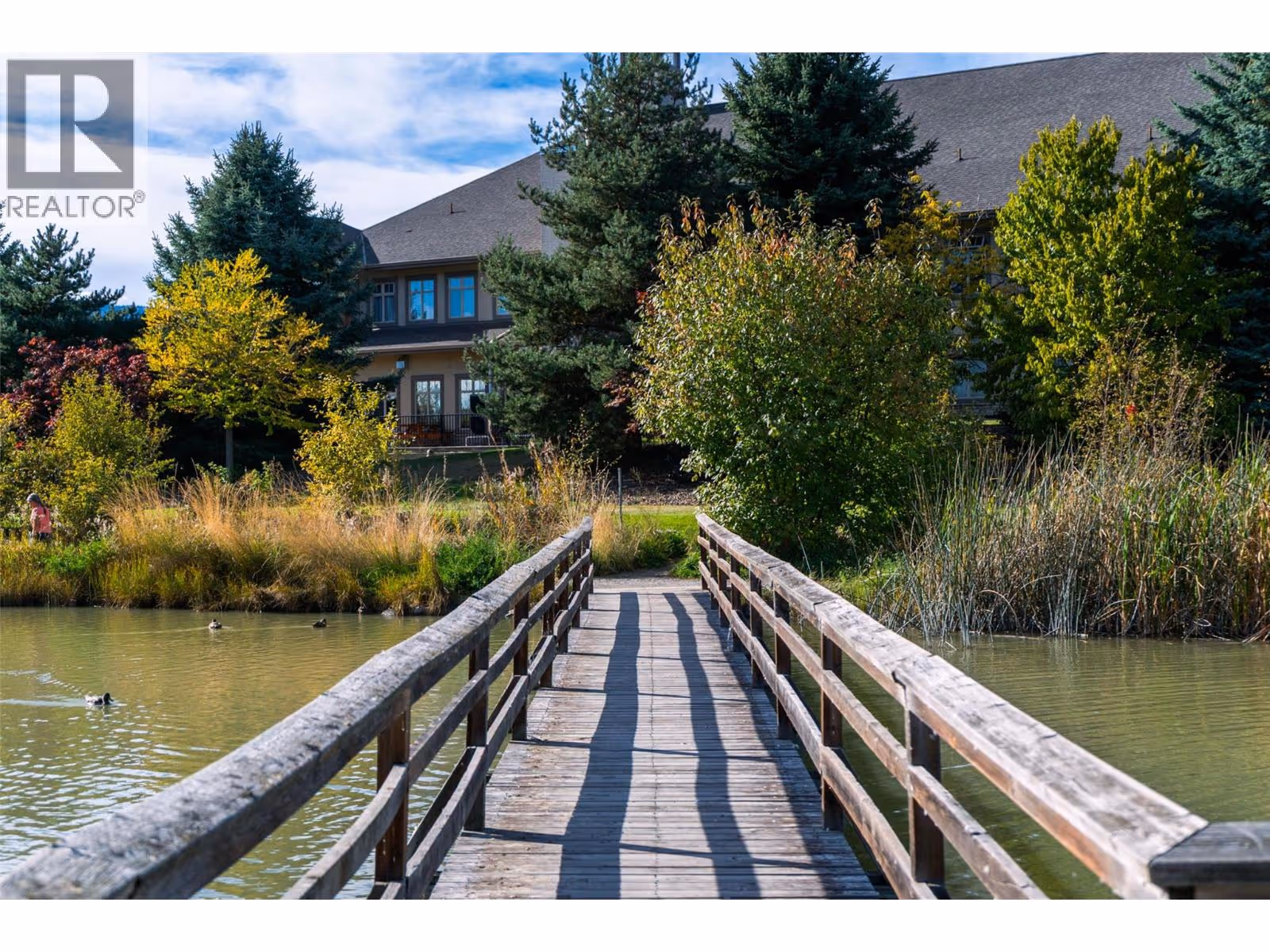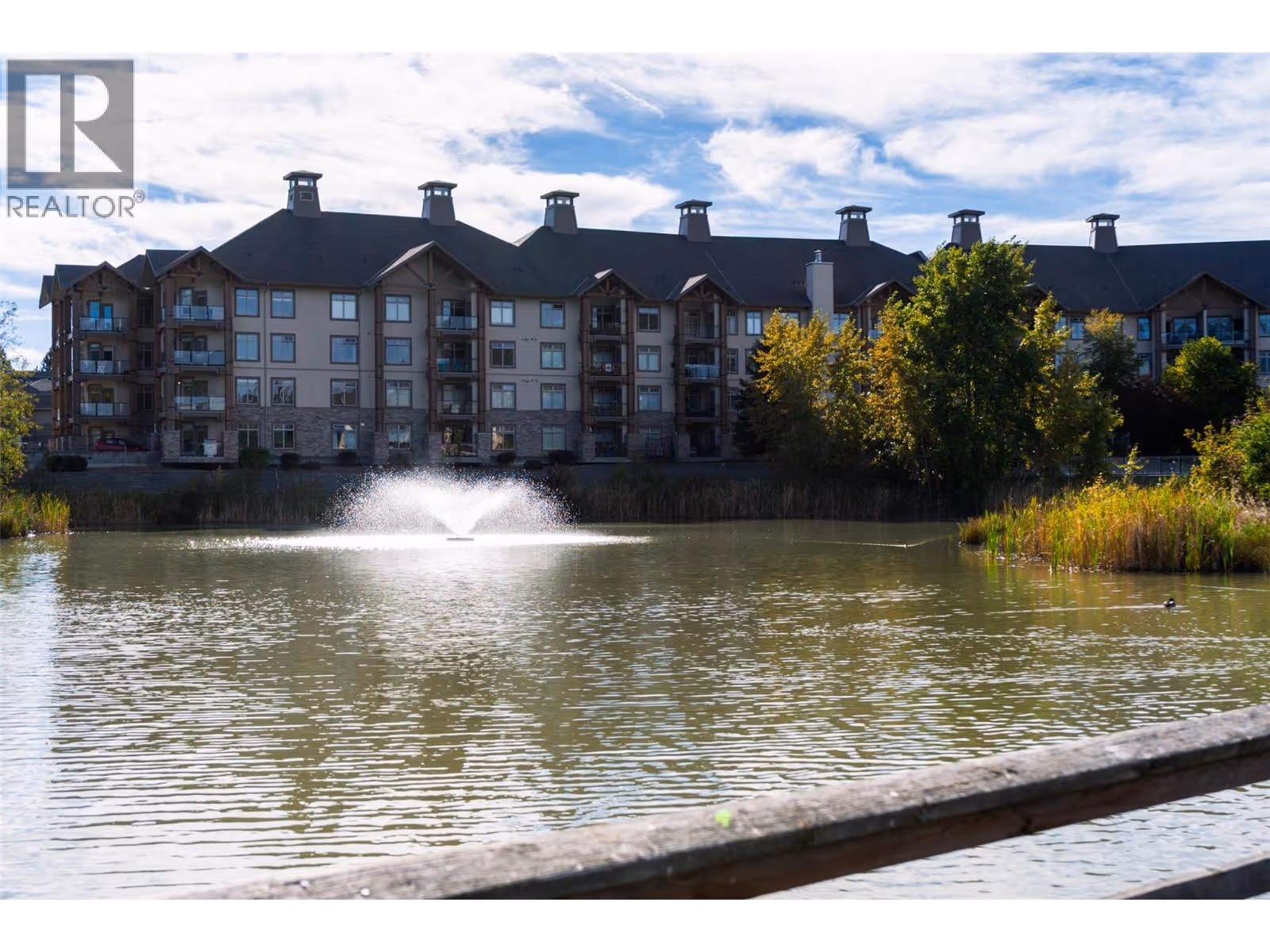 Welcome to Sitara On the Pond, nestled in the master-planned “The Lakes” community of Lake Country! This beautifully updated first-floor condo offers nearly 1,000 sqft of comfortable living with freshly painted walls, ceilings, trim, and upgraded cabinetry. Step inside to a tiled foyer with coat closet, leading into an open-concept living space featuring 9ft ceilings and an electric fireplace. The U-shaped kitchen boasts a dedicated pantry, newer fridge + dishwasher, and plenty of prep space for the home cook. A spacious patio with glass railings overlooks the tranquil pond and includes a natural gas hookup and phantom screen for seamless indoor-outdoor living. The primary suite offers a walk-in closet with built-ins and a 3-piece ensuite with linen storage, while the second bedroom is filled with natural light from two large windows. A full 4-piece main bath with generous counter space and its own linen closet, a laundry room with raised washer/dryer, and a separate storage room complete the home. Sitara residents enjoy incredible resort-style amenities including an outdoor pool & whirlpool, fitness room, billiards room, lounge, library, underground parking, storage locker, and bike racks ready to go! With walking trails outside your door and quick access to multiple lakes, wineries, UBCO, YLW, and more, this is Okanagan living at its best! (id:58842)