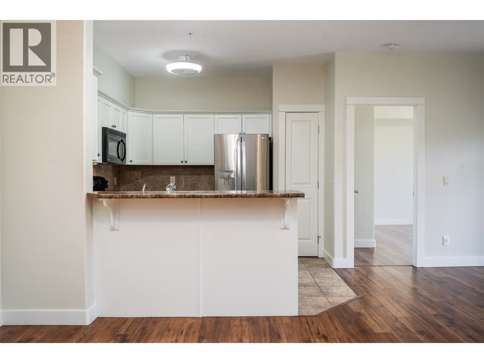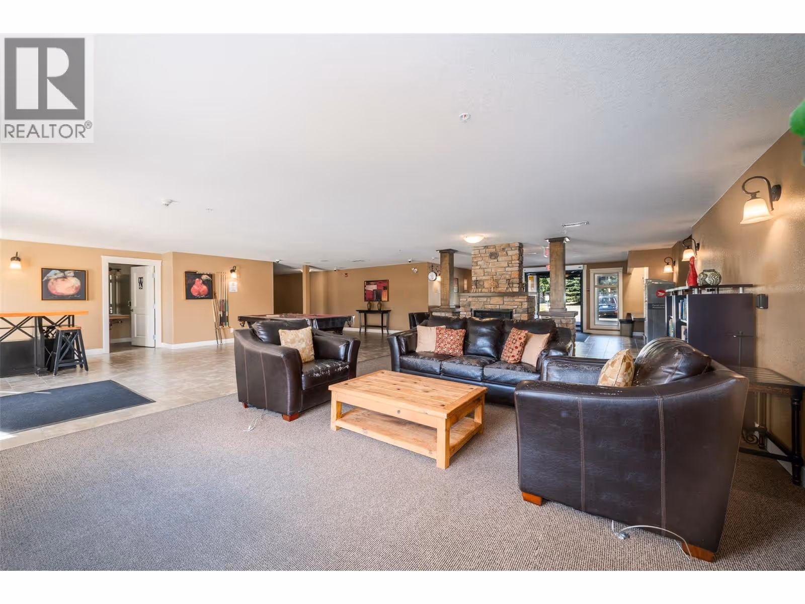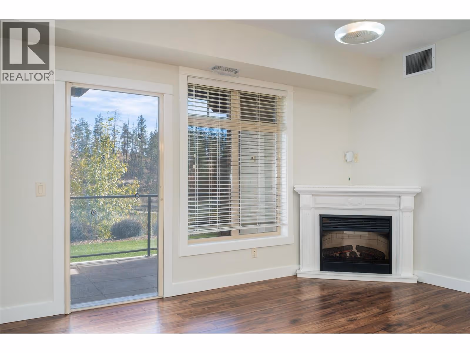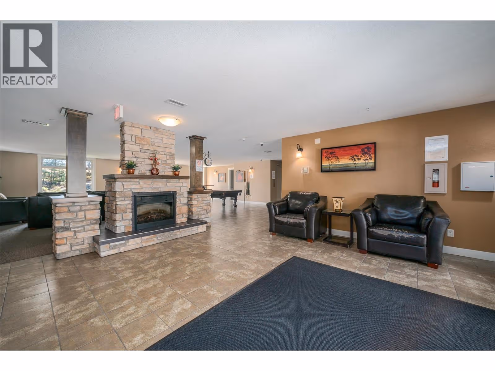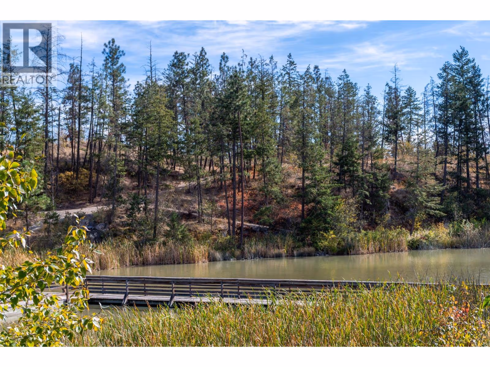 Welcome to Sitara On the Pond, nestled in the master-planned “The Lakes” community of Lake Country! This beautifully updated first-floor condo offers nearly 1,000 sqft of comfortable living with freshly painted walls, ceilings, trim, and upgraded cabinetry. Step inside to a tiled foyer with coat closet, leading into an open-concept living space featuring 9ft ceilings and an electric fireplace. The U-shaped kitchen boasts a dedicated pantry, newer fridge + dishwasher, and plenty of prep space for the home cook. A spacious patio with glass railings overlooks the tranquil pond and includes a natural gas hookup and phantom screen for seamless indoor-outdoor living. The primary suite offers a walk-in closet with built-ins and a 3-piece ensuite with linen storage, while the second bedroom is filled with natural light from two large windows. A full 4-piece main bath with generous counter space and its own linen closet, a laundry room with raised washer/dryer, and a separate storage room complete the home. Sitara residents enjoy incredible resort-style amenities including an outdoor pool & whirlpool, fitness room, billiards room, lounge, library, underground parking, storage locker, and bike racks ready to go! With walking trails outside your door and quick access to multiple lakes, wineries, UBCO, YLW, and more, this is Okanagan living at its best! (id:58842)