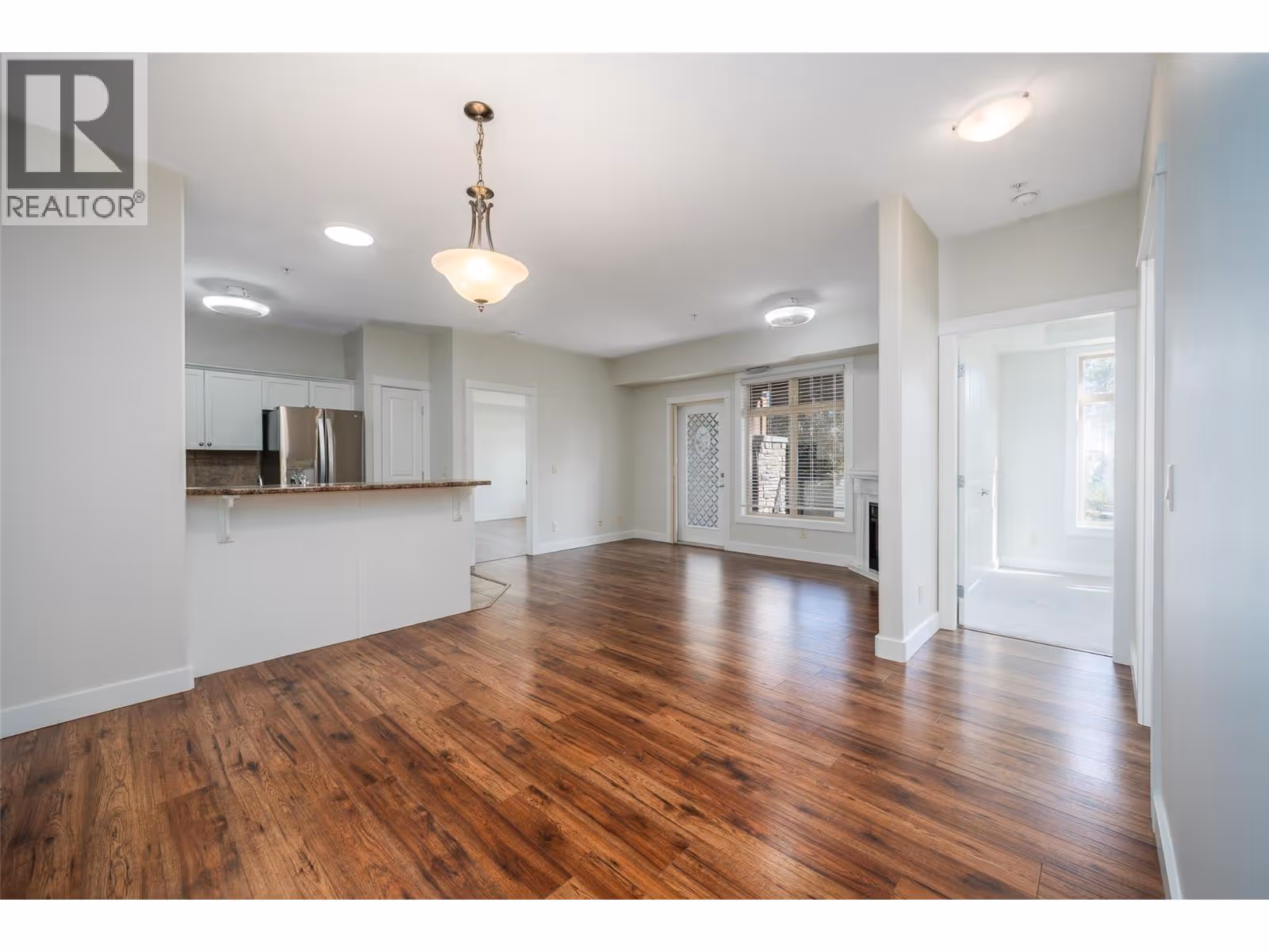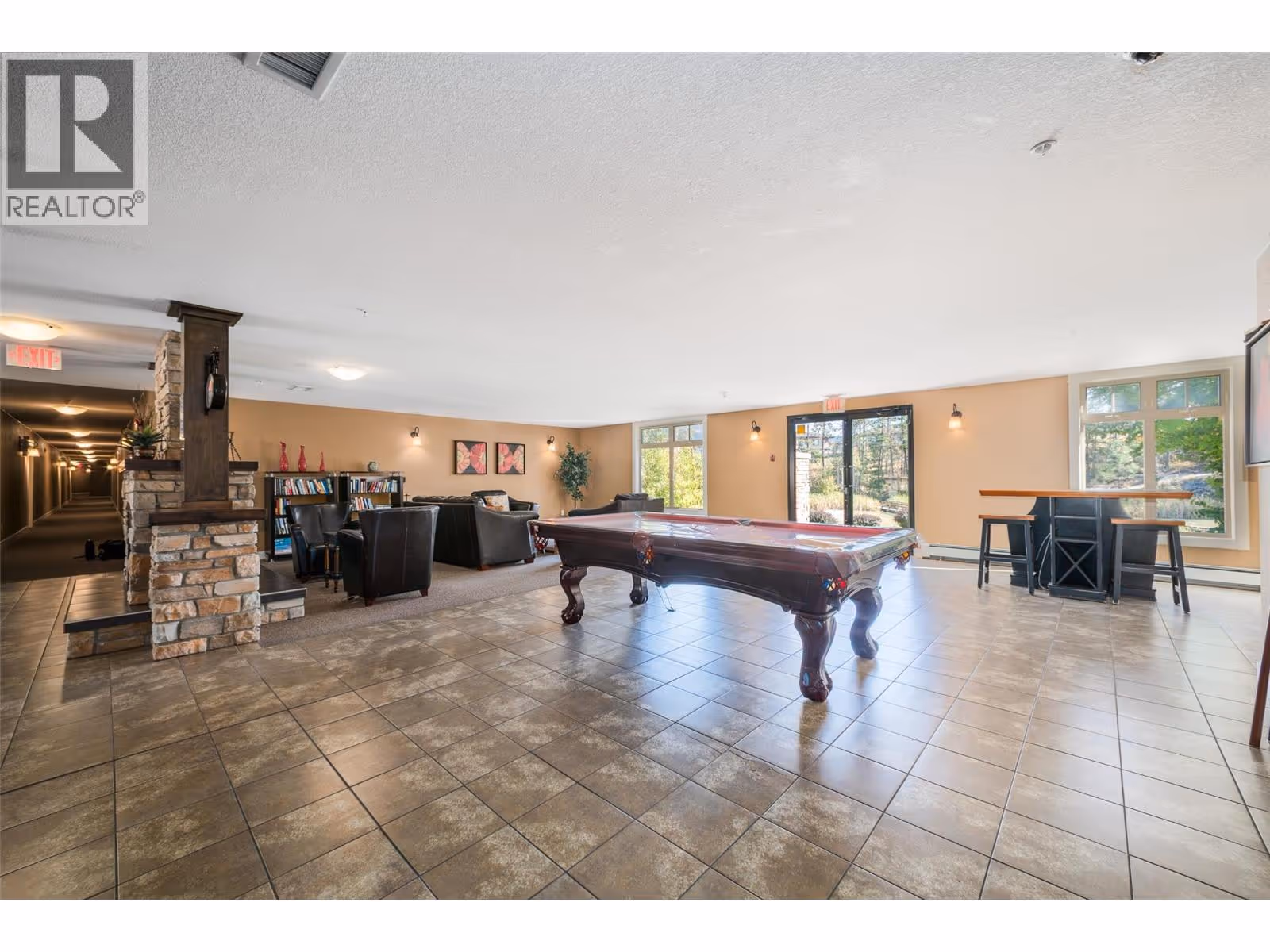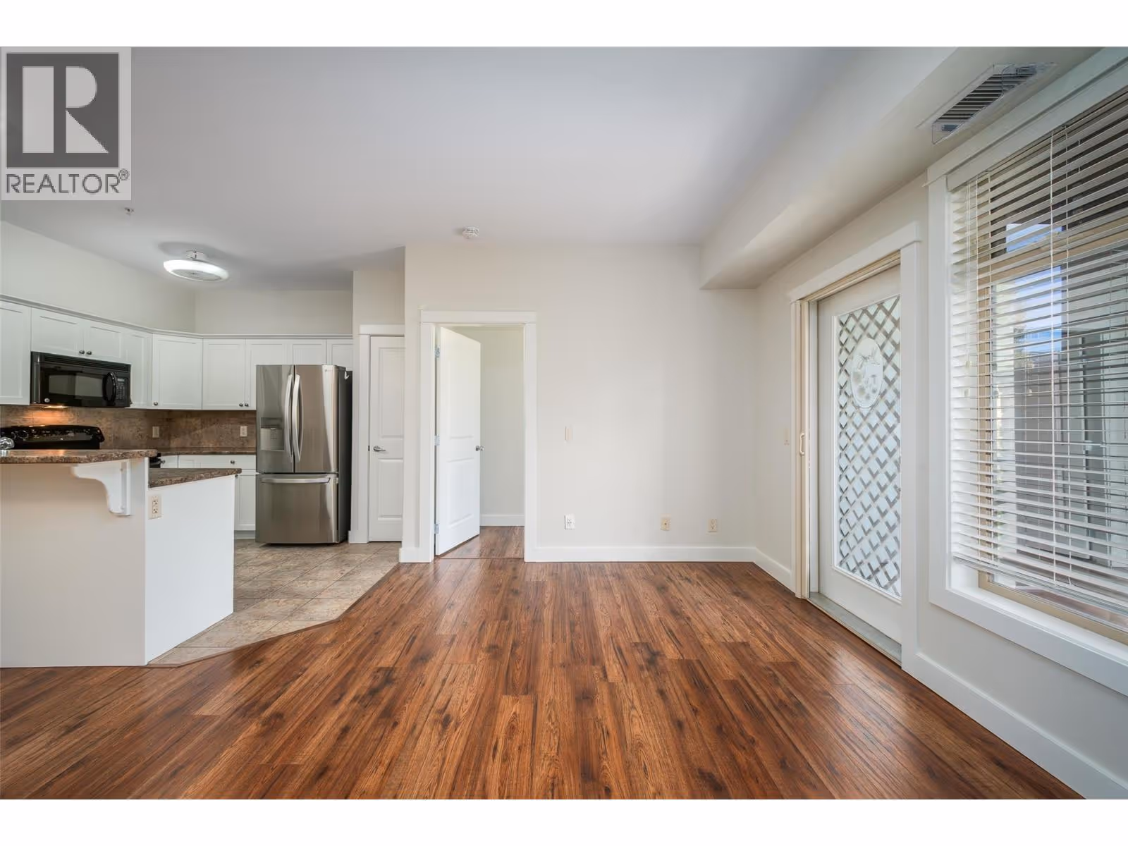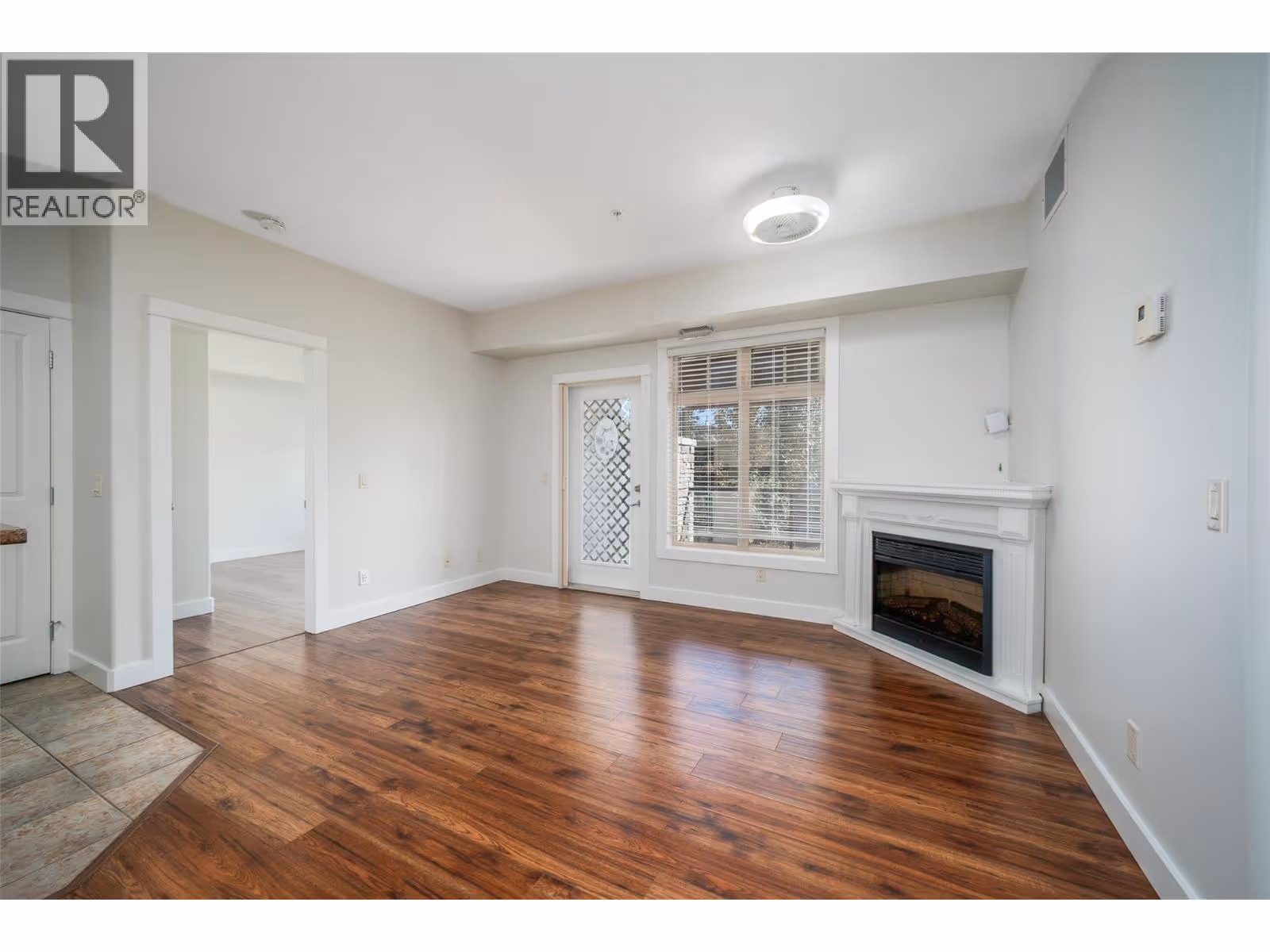 Welcome to Sitara On the Pond, nestled in the master-planned “The Lakes” community of Lake Country! This beautifully updated first-floor condo offers nearly 1,000 sqft of comfortable living with freshly painted walls, ceilings, trim, and upgraded cabinetry. Step inside to a tiled foyer with coat closet, leading into an open-concept living space featuring 9ft ceilings and an electric fireplace. The U-shaped kitchen boasts a dedicated pantry, newer fridge + dishwasher, and plenty of prep space for the home cook. A spacious patio with glass railings overlooks the tranquil pond and includes a natural gas hookup and phantom screen for seamless indoor-outdoor living. The primary suite offers a walk-in closet with built-ins and a 3-piece ensuite with linen storage, while the second bedroom is filled with natural light from two large windows. A full 4-piece main bath with generous counter space and its own linen closet, a laundry room with raised washer/dryer, and a separate storage room complete the home. Sitara residents enjoy incredible resort-style amenities including an outdoor pool & whirlpool, fitness room, billiards room, lounge, library, underground parking, storage locker, and bike racks ready to go! With walking trails outside your door and quick access to multiple lakes, wineries, UBCO, YLW, and more, this is Okanagan living at its best! (id:58842)