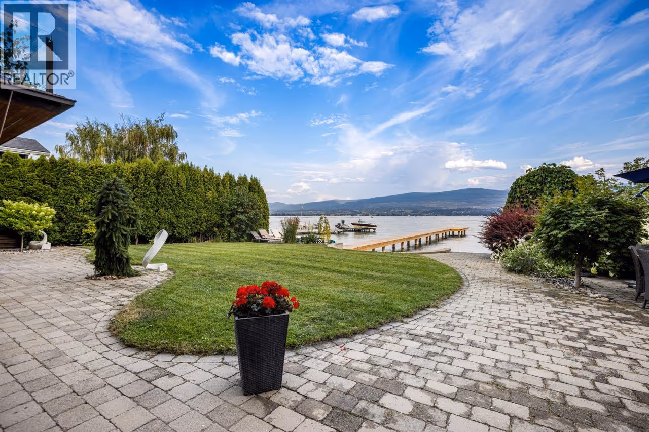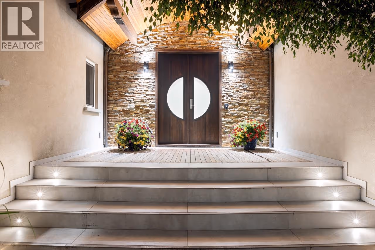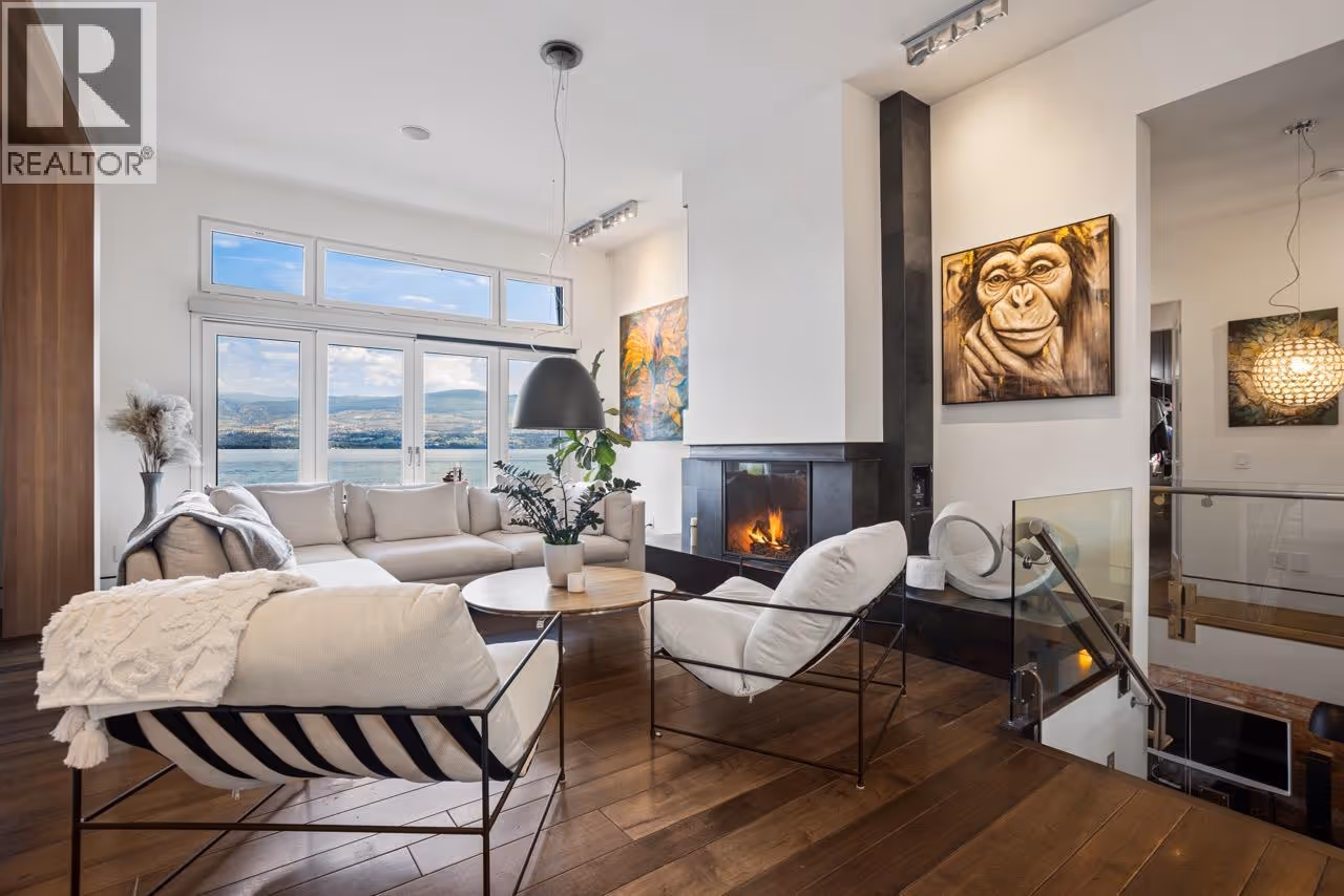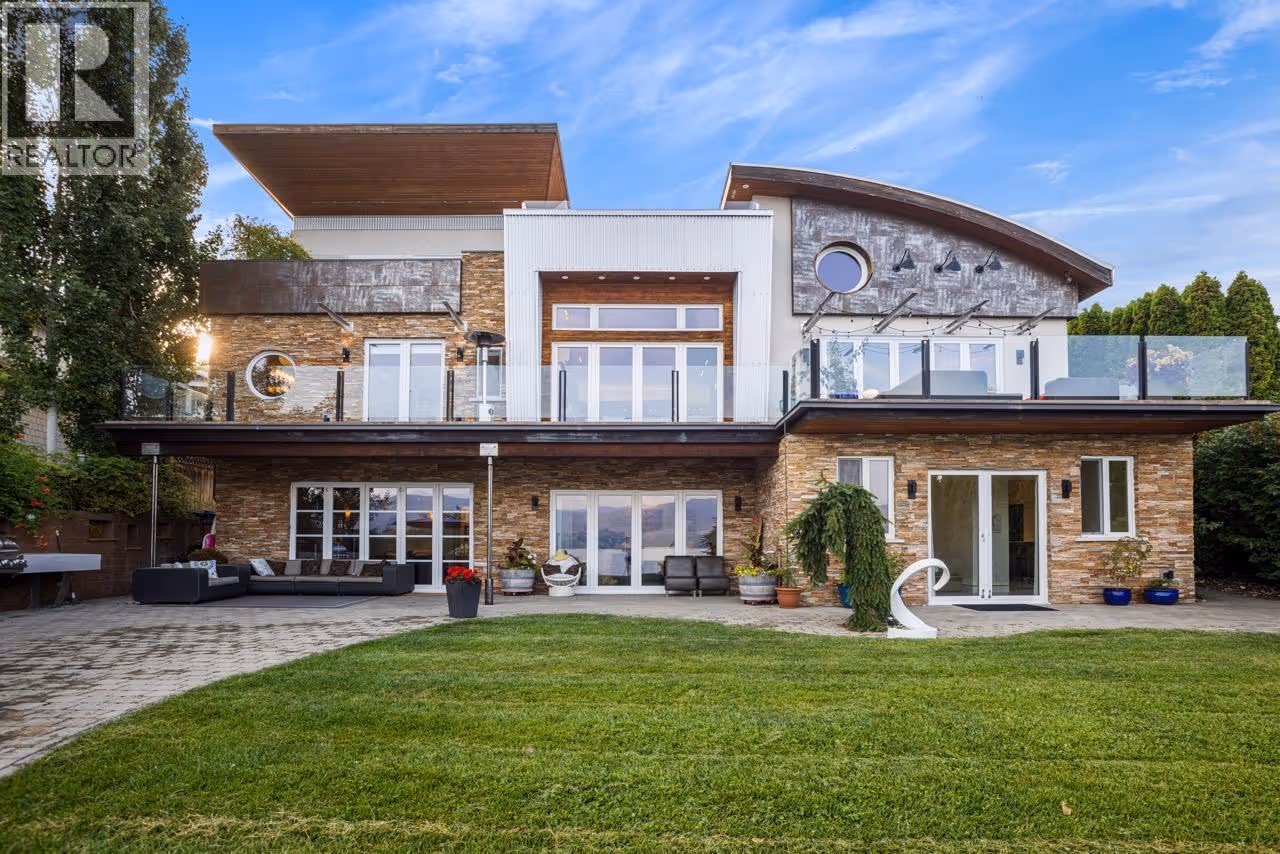 Architecturally striking lakeshore residence on the shores of Okanagan Lake. Set on a 0.25-acre (10,890 sq. ft.) lot with 75 feet of pristine frontage, this home is designed to seamlessly integrate indoor and outdoor living. The exterior blends rock, aluminum, steel, and wood, while the interior combines wood, glass, and reclaimed brick for a warm yet contemporary feel. Expansive NanaWall doors open the main living areas to the lakeside patio, extending the kitchen and dining spaces to a flat lawn, BBQ area, sandy beach with fire pit, and private licensed dock. The chef’s kitchen is equipped with top-tier appliances—including a built-in coffee maker—and anchored by a massive island with lake view dining. The upper level is devoted to the primary suite, complete with a private patio and rooftop deck capturing breathtaking sunrises. Four additional bedrooms with ensuites provide comfort for family and guests. The lower level offers a home theatre, wine cellar, recreation room, and a cozy living space with a wood-burning stove. A triple garage and ample uncovered parking add convenience, while mature landscaping creates a park-like setting. Located in the sought-after Casa Loma community, just minutes to Downtown Kelowna and steps from Kalamoir Park trails, this residence perfectly balances luxury design and lakeshore lifestyle. (id:58842)