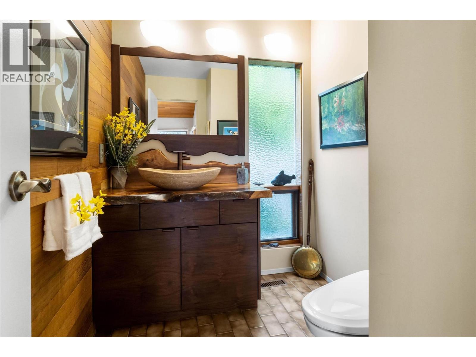 Discover your own private lakeside retreat, where timeless architecture meets the natural beauty of the Okanagan. Designed by Dan Pretty and meticulously maintained by its original owners, this 2,500+ square feet home showcases true craftsmanship and tranquility. Vaulted ceilings and rich natural wood create warmth throughout, while expansive windows frame ever-changing views of the surrounding trees, stream, and sparkling lake. The main living area centers around a striking stone fireplace- an inviting focal point for gatherings and relaxation. Downstairs, a charming family room with an antique brick fireplace adds cozy, rustic appeal. The well-designed kitchen opens to an upper deck, ideal for morning coffee or al fresco dining under the stars. The spacious primary suite features a private deck and hot tub, offering a serene retreat at day’s end. A loft-style study with a rolling ladder provides a peaceful nook for reading or work, and each bedroom enjoys its own unique connection to nature. The beautifully landscaped grounds feature mature trees, a meandering stream, and abundant wildlife, creating a true sense of seclusion. At the water’s edge, a private beachfront awaits, complete with a dock, an outdoor kitchen, and a sleeping area, perfect for unforgettable Okanagan summers. With a heated workshop, ample storage, and five pristine acres to call your own, this rare property offers endless possibilities- whether you move in and enjoy as-is or create your dream lakeside estate. (id:58842)