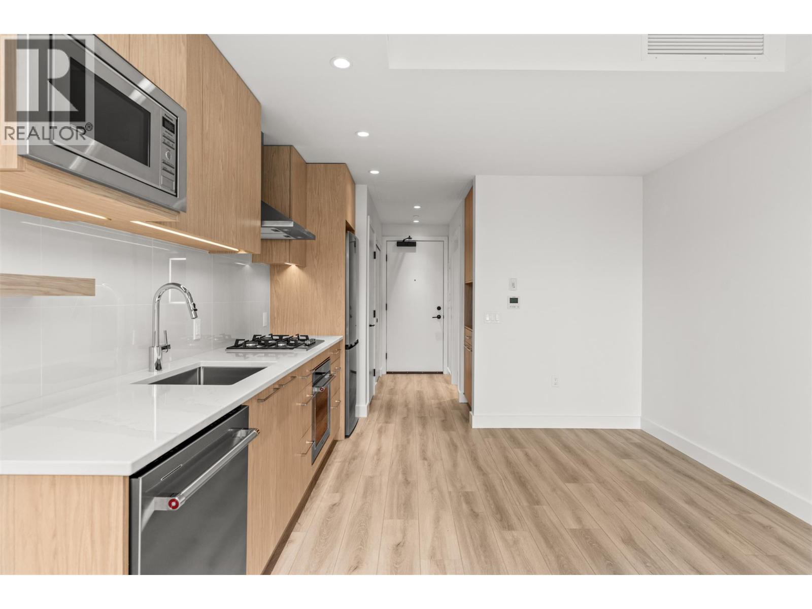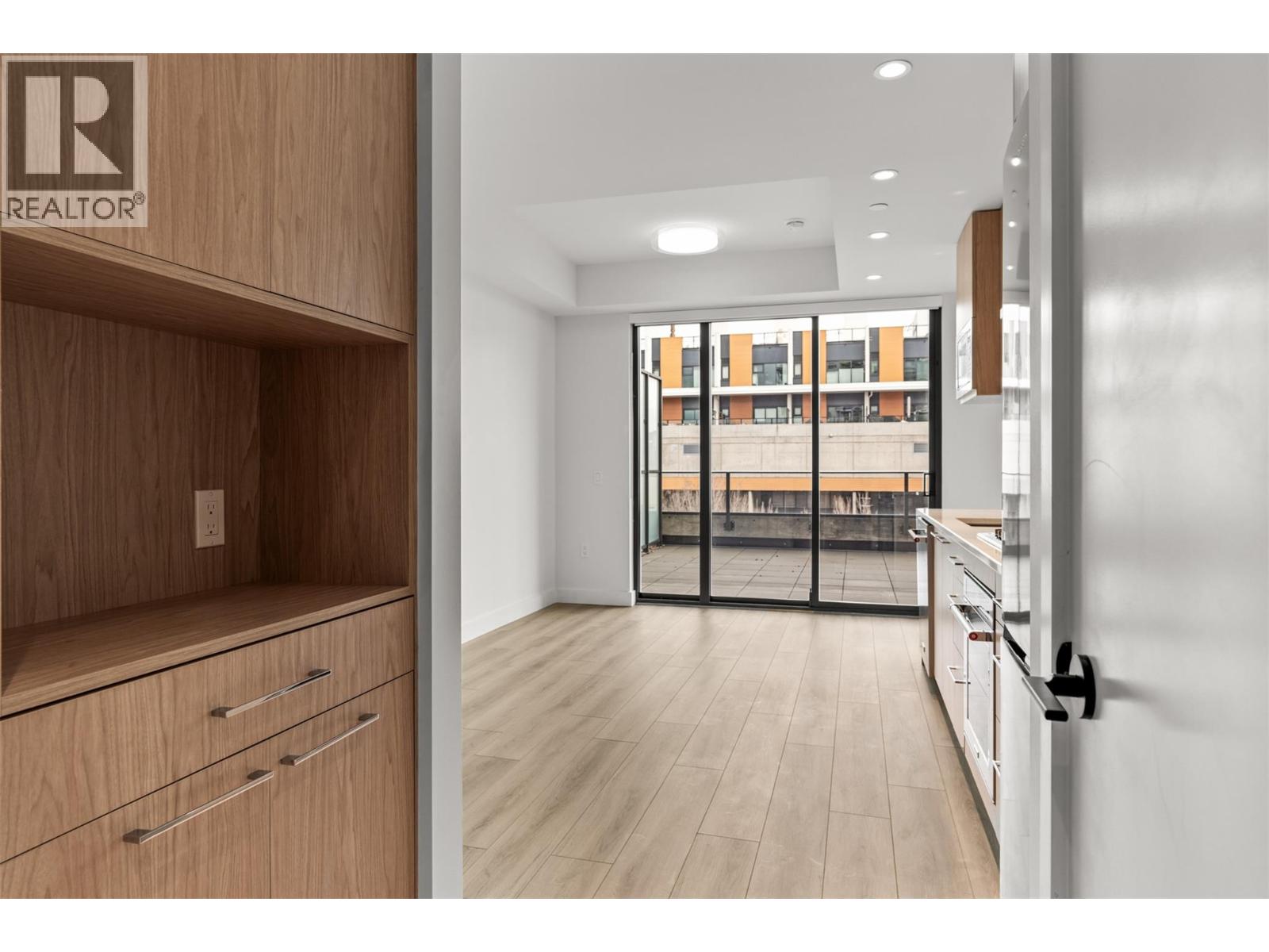 Step into ALMA by Mission Group-- this smartly crafted 2nd floor studio residence offers approximately 312 sq ft of sun-filled, highly functional living directly across the street from Pandosy Waterfront Park. Located in the heart of the Lower Mission, this home blends style and efficiency with ease. The contemporary kitchen showcases flat-panel wood-grain cabinetry, sleek quartz counters, porcelain tile backsplash, and a premium stainless steel appliance package, all accented by under-cabinet LED lighting. Expansive windows flood the open layout with natural light, while durable laminate flooring and modern roller shades add a polished finish. The spa-inspired bathroom delivers everyday luxury with large-format tile, a rainfall shower, custom niche, and soft ambient lighting. Comfort meets convenience with in-suite laundry and individually controlled heating and cooling for year-round climate control. Residents enjoy access to exceptional amenities, including an 8,000 sq ft lakeview terrace complete with firepits, BBQ areas, and community gardens, plus a fully equipped fitness centre, dog wash station, and bike maintenance hub. With an outstanding walk score of 93, you’re just steps to transit, Kelowna General Hospital, the boutiques and dining of vibrant Pandosy Village, and the shores of Okanagan Lake. Square footage and room dimensions are approximate. Photos may represent a similar home and layout. Newly constructed and move-in ready! Exclusive of GST. (id:58842)