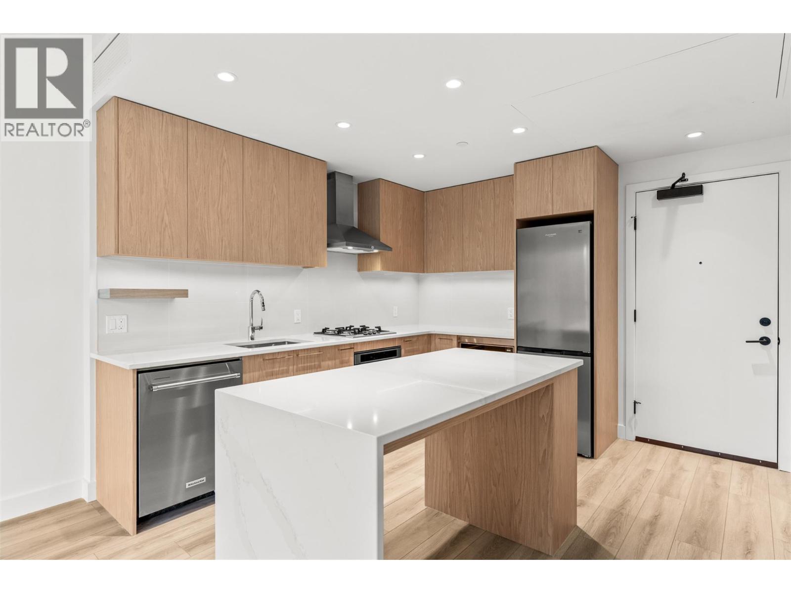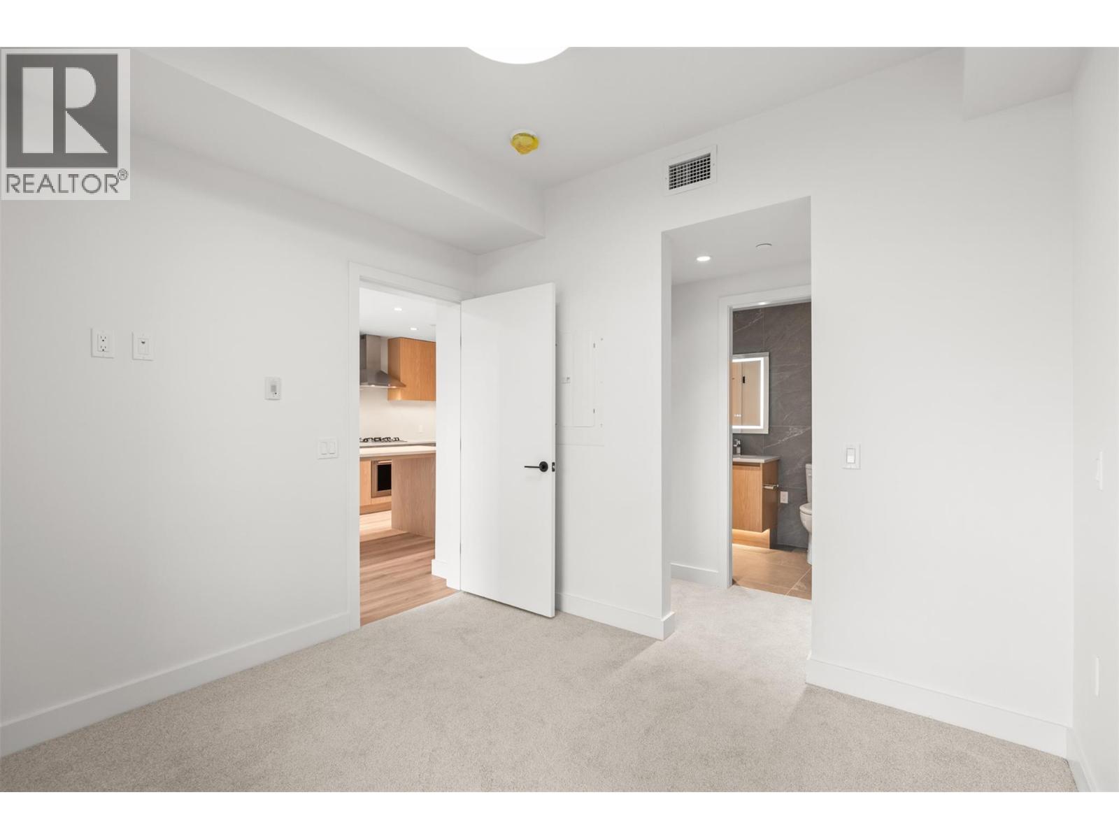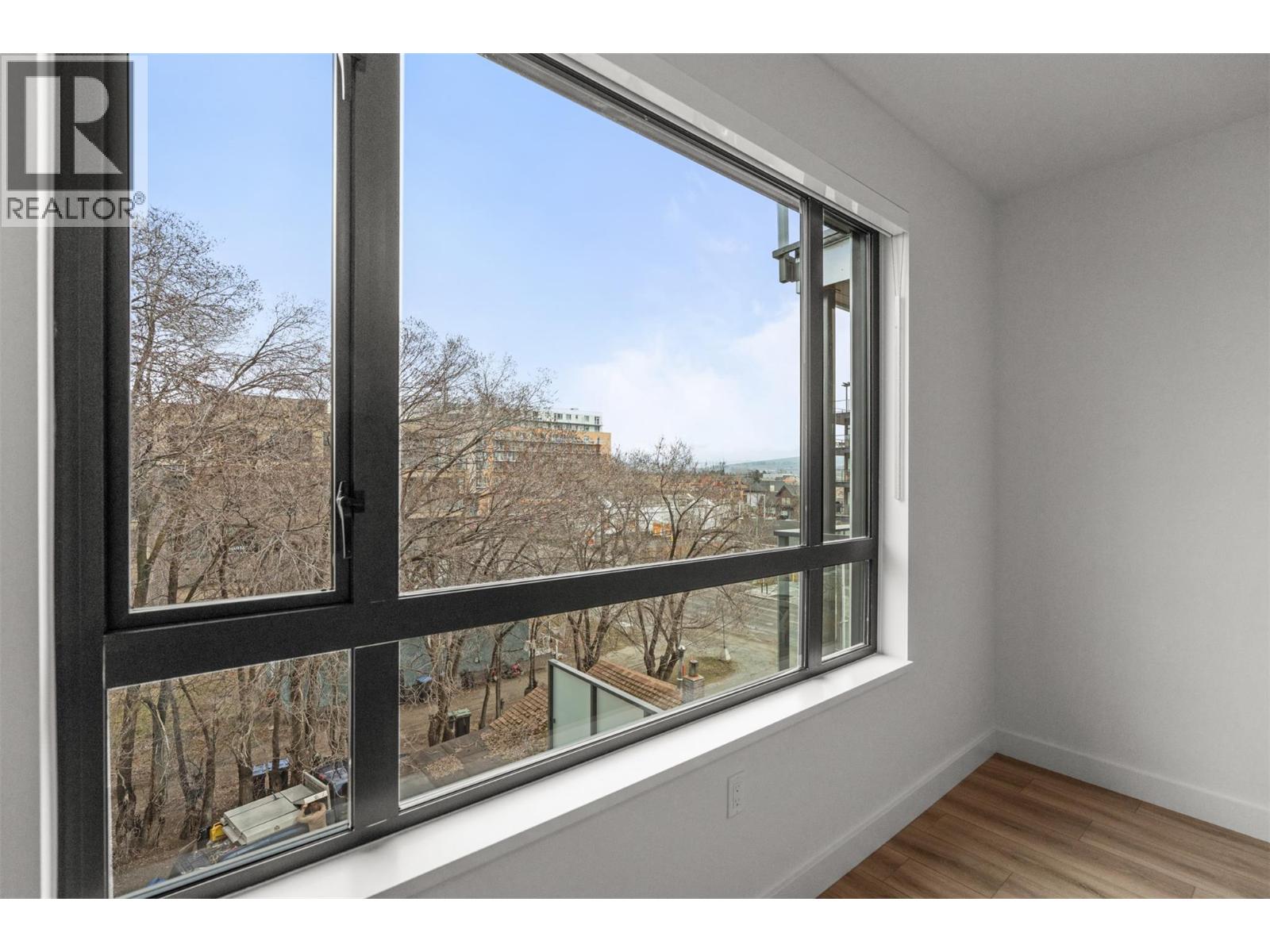 Presenting ALMA, built by Mission Group. This luminous, 3rd floor east-facing 1-bed, 1-bath residence welcomes gorgeous morning sun, offering 540 sqft of interior space plus a 100 sqft terrace, effortlessly blending purposeful design with upscale finishes in the heart of the Lower Mission. The impressive kitchen showcases streamlined flat-panel wood-grain cabinetry, a bold quartz waterfall dining island, and premium stainless-steel appliances. The open-concept plan is ideal for daily living and seamless entertaining, elevated by oversized windows that bathe the home in natural light, durable laminate flooring throughout the main living areas, and soft woven broadloom carpeting in the bedroom. The primary suite features a walk-through closet, while the ensuite is appointed with large-format tile, a rainfall shower, custom-tiled niche, and gentle ambient lighting that creates a spa-like retreat. Added features include roller shades on every window, individually controlled heating and cooling, and one secure underground parking stall. Residents enjoy access to amenities including an 8,000 sqft lakeview terrace with firepits, BBQs, and community gardens, along with a fully equipped fitness centre, dog wash, and bike maintenance station. With a walk score of 93, you’re moments from transit, KGH, the shops and dining of vibrant Pandosy Village, and the shoreline of Okanagan Lake. Sqft and room sizes are approximate and may vary. This new home is move-in ready. Exclusive of GST (id:58842)