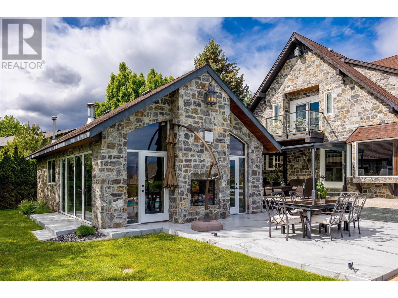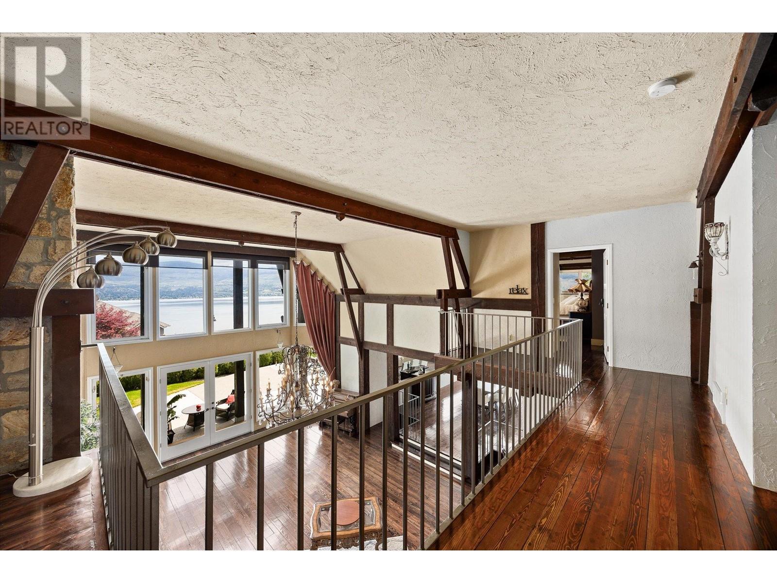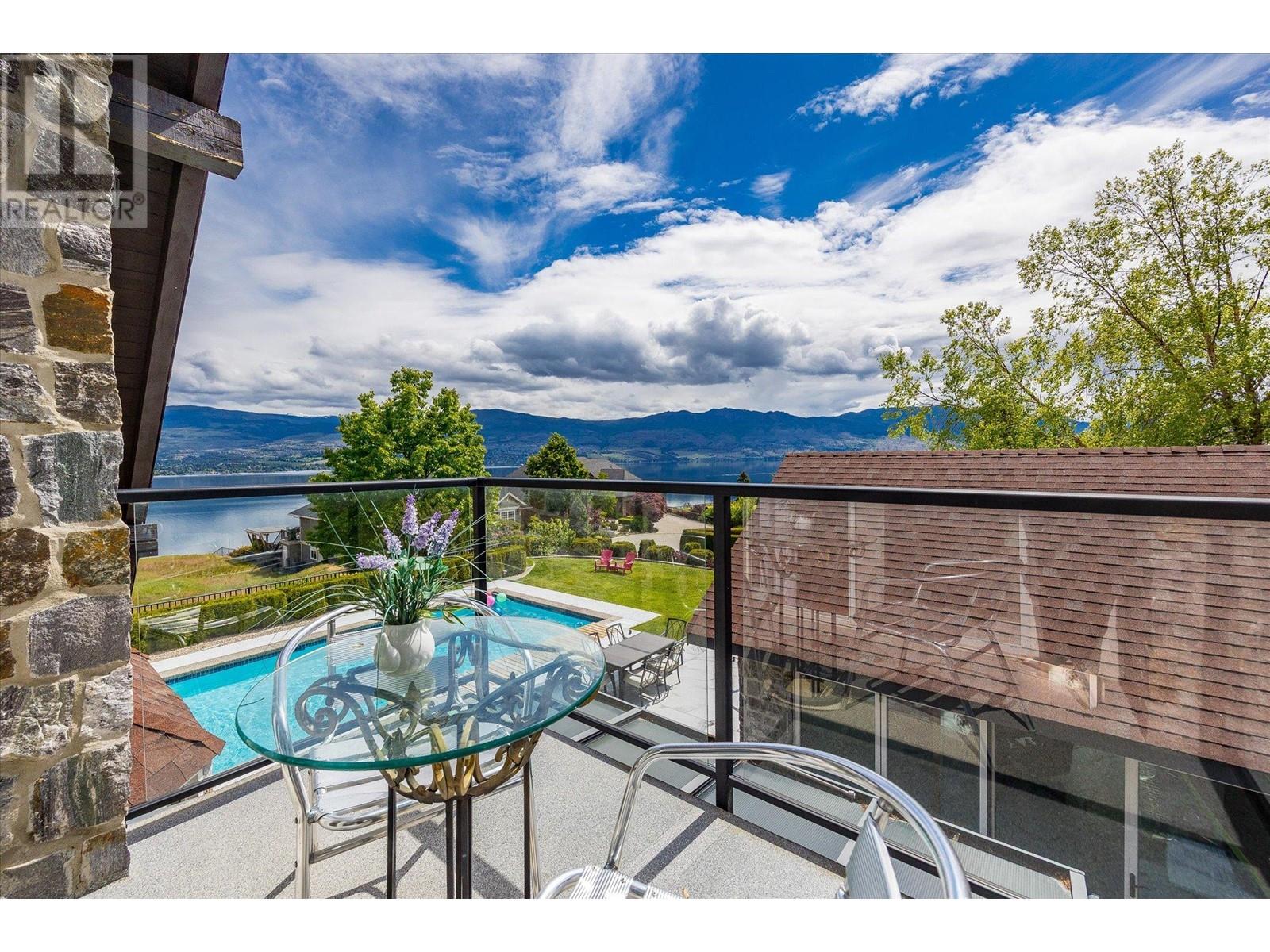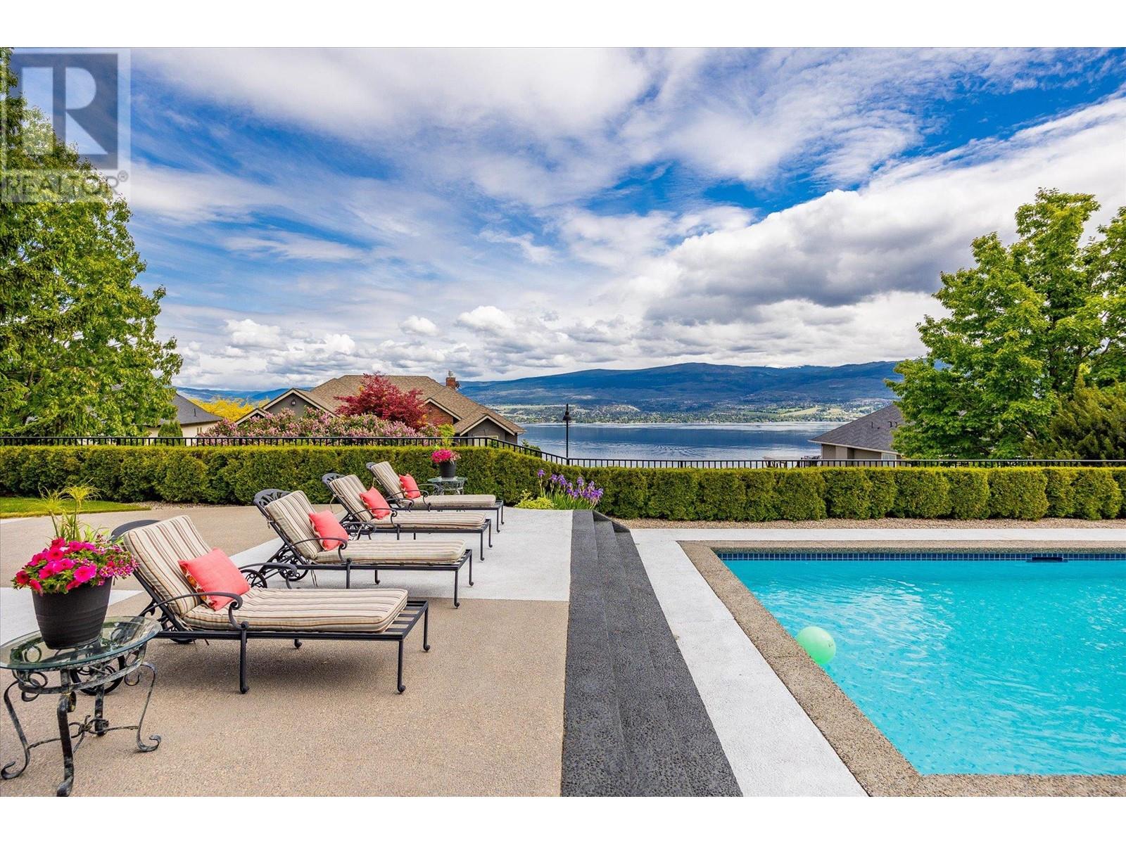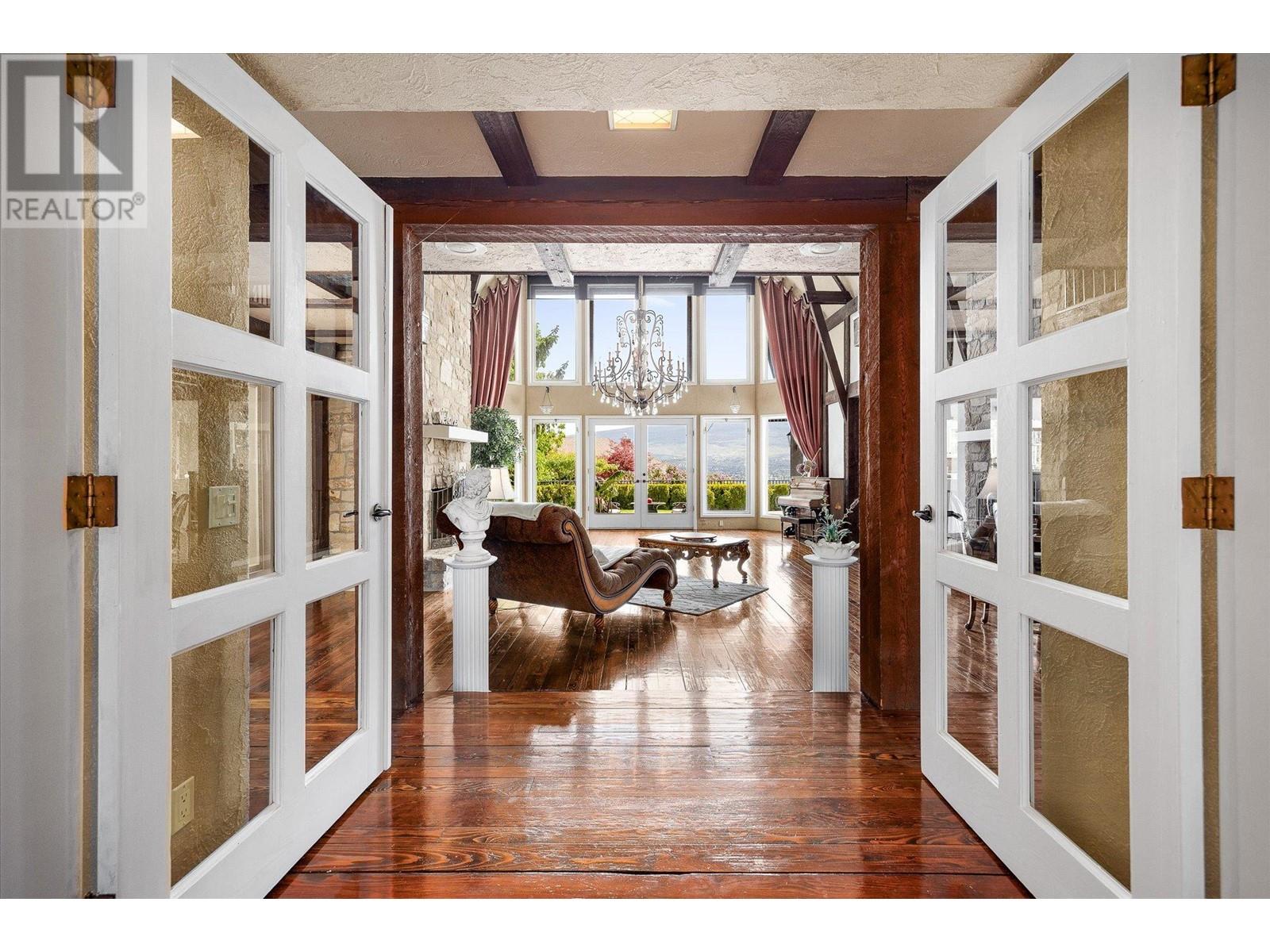 Set on a beautifully landscaped half-acre lot in the exclusive gated community of Thacker Ridge Estates, this remarkable estate home blends luxury, rustic charm, and timeless character. Enjoy breathtaking Okanagan Lake views from your private pool and patio, surrounded by an immaculately maintained yard. Inside, the home is filled with unique touches — rustic wood beams, soaring 20 foot ceilings, and charming secret passages. A grand double-door entrance leads to a sunken living room with a dramatic fireplace and a full wall of windows framing the lush outdoors. The entertainer’s kitchen offers a thoughtful layout with dual sinks, a gas cooktop, double ovens, an oversized fridge-freezer with custom cabinetry, and an adjoining statement dining room perfect for hosting. Upstairs, three spacious bedrooms each feature ensuites, creating private, tranquil retreats. Bonus spaces include a finished attic and a large basement with a recording studio and media room — not included in the main square footage — with 6’2” ceilings, offering extra flexibility and creative potential. An additional highlight is the cabana, complete with a commercial kitchen, bar, and bathroom, ideal for entertaining in resort-style comfort. This home masterfully balances grandeur and warmth, is minutes away from a number of world-class wineries, golf courses, and a short 5 minute drive from all the daily amenities you need, making it a rare and unforgettable opportunity that is perfect for Okanagan living. (id:58842)