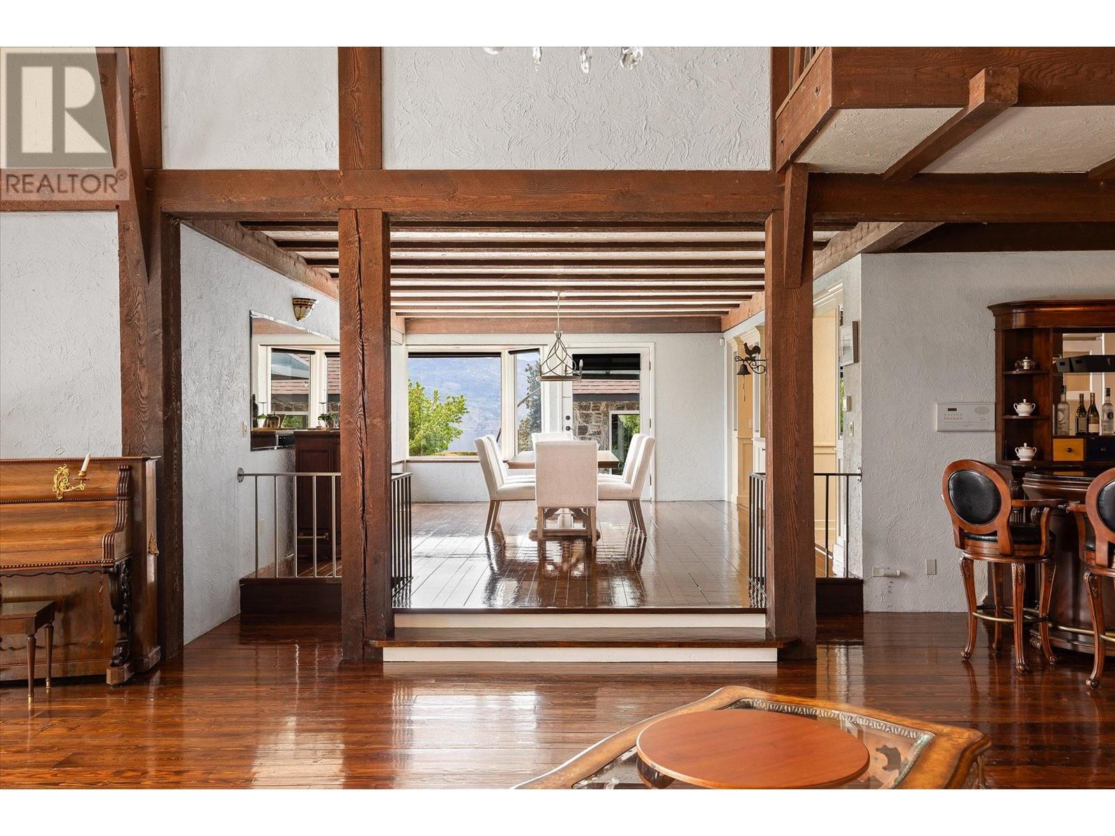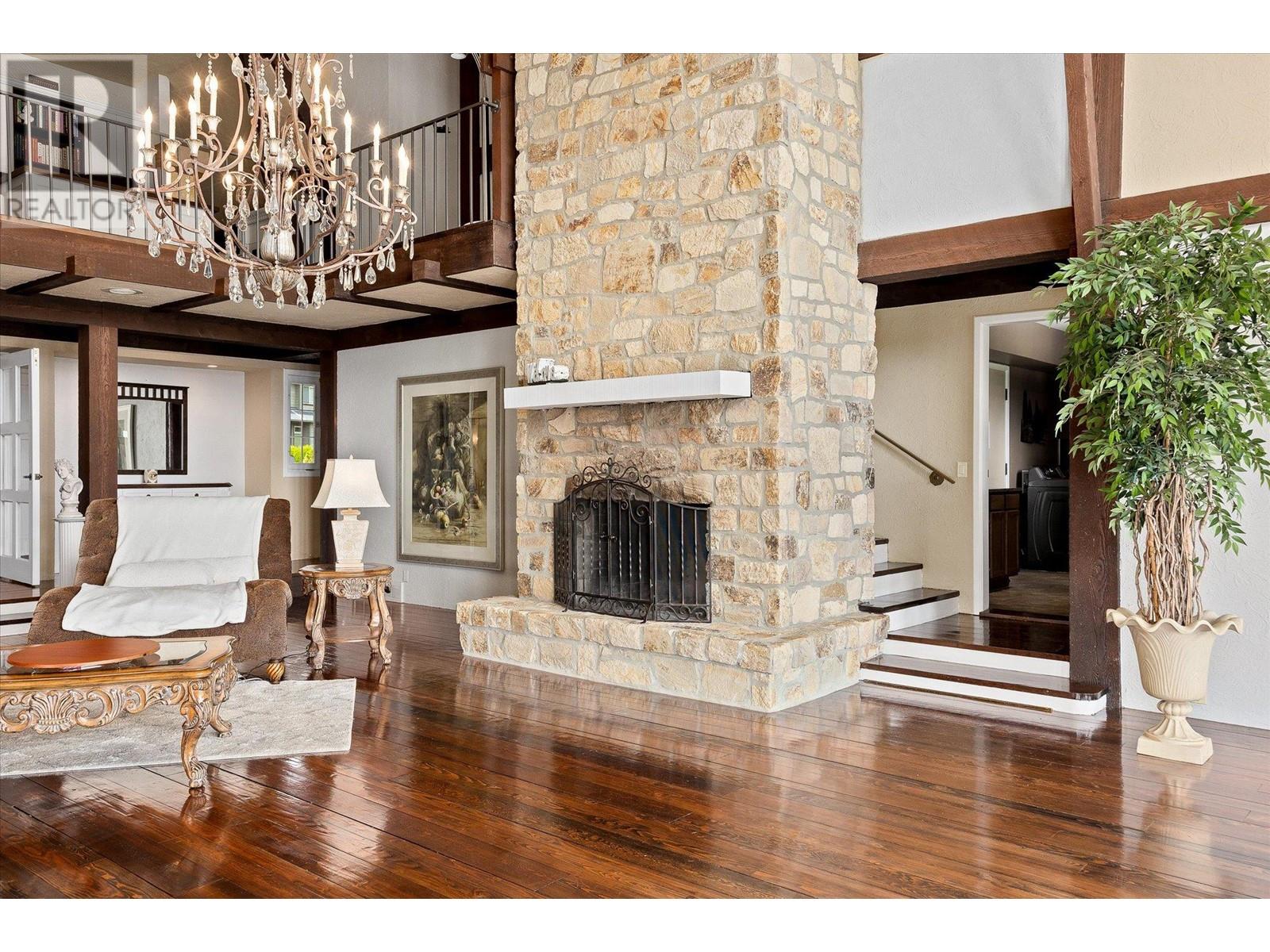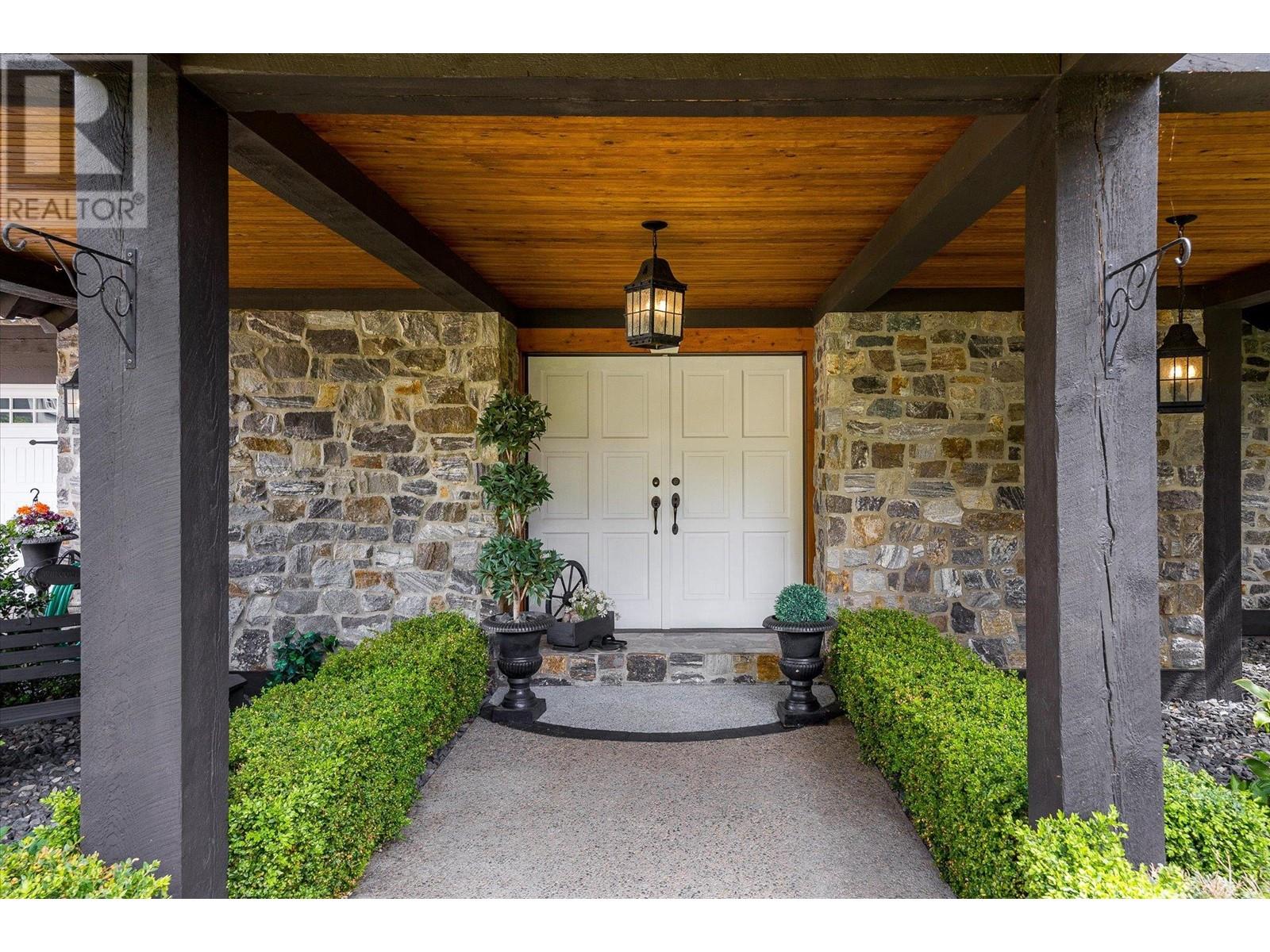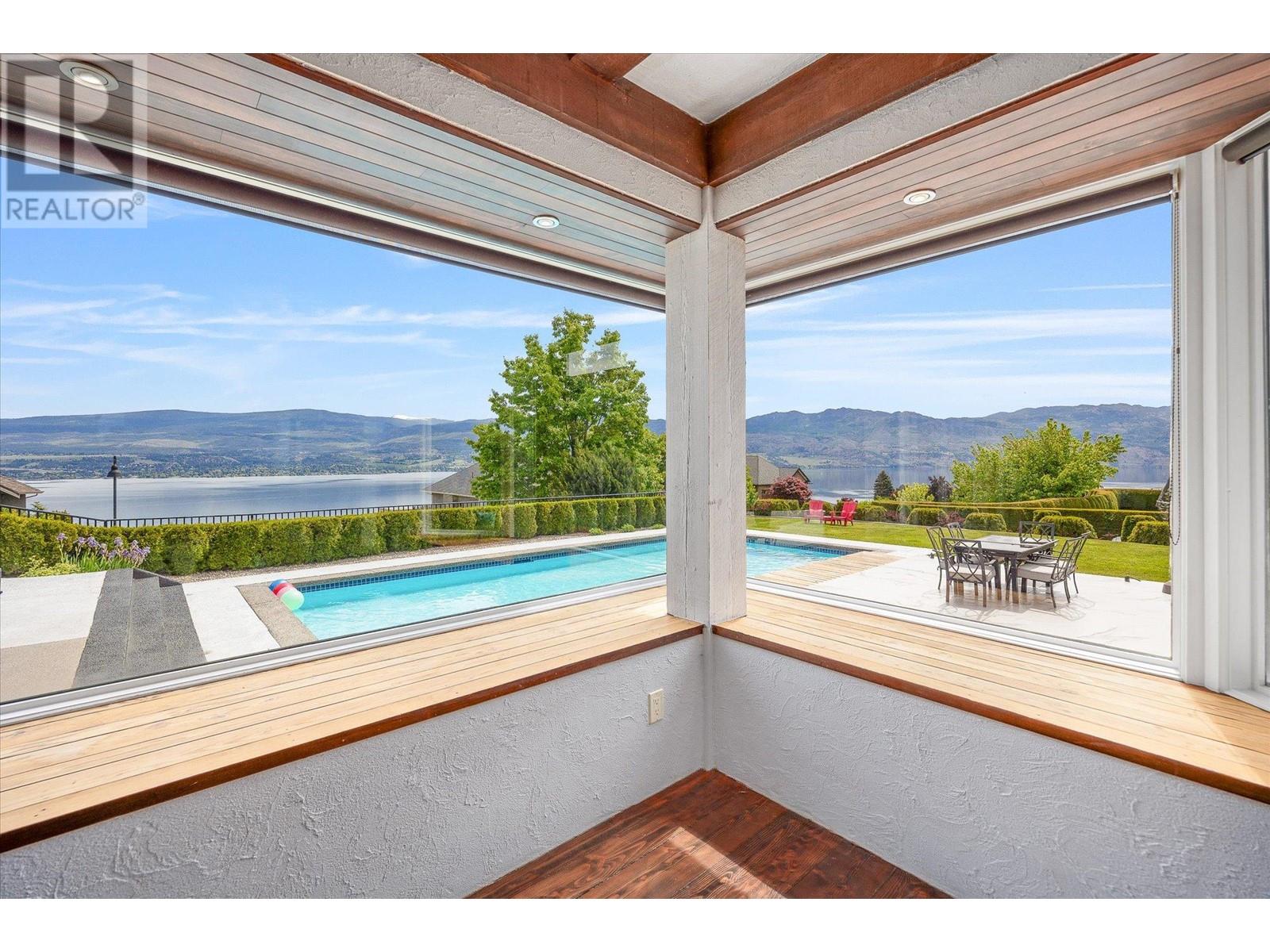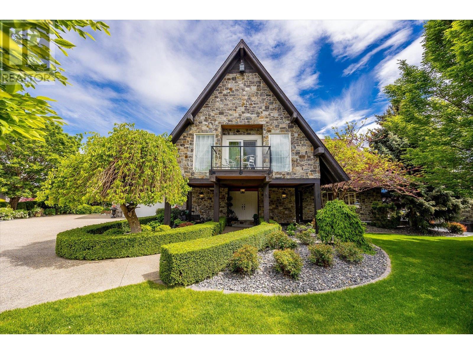 Set on a beautifully landscaped half-acre lot in the exclusive gated community of Thacker Ridge Estates, this remarkable estate home blends luxury, rustic charm, and timeless character. Enjoy breathtaking Okanagan Lake views from your private pool and patio, surrounded by an immaculately maintained yard. Inside, the home is filled with unique touches — rustic wood beams, soaring 20 foot ceilings, and charming secret passages. A grand double-door entrance leads to a sunken living room with a dramatic fireplace and a full wall of windows framing the lush outdoors. The entertainer’s kitchen offers a thoughtful layout with dual sinks, a gas cooktop, double ovens, an oversized fridge-freezer with custom cabinetry, and an adjoining statement dining room perfect for hosting. Upstairs, three spacious bedrooms each feature ensuites, creating private, tranquil retreats. Bonus spaces include a finished attic and a large basement with a recording studio and media room — not included in the main square footage — with 6’2” ceilings, offering extra flexibility and creative potential. An additional highlight is the cabana, complete with a commercial kitchen, bar, and bathroom, ideal for entertaining in resort-style comfort. This home masterfully balances grandeur and warmth, is minutes away from a number of world-class wineries, golf courses, and a short 5 minute drive from all the daily amenities you need, making it a rare and unforgettable opportunity that is perfect for Okanagan living. (id:58842)