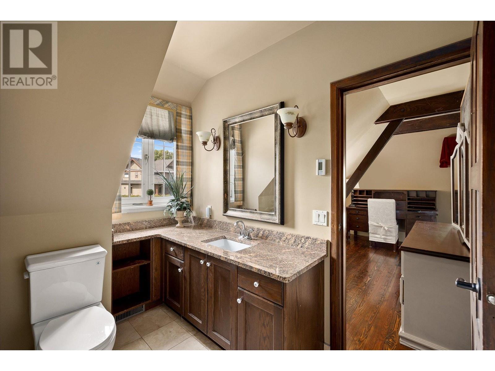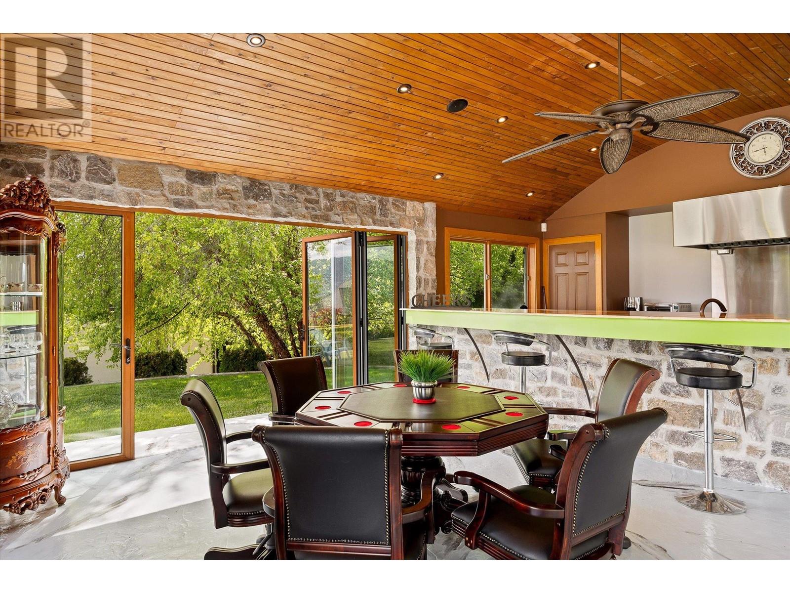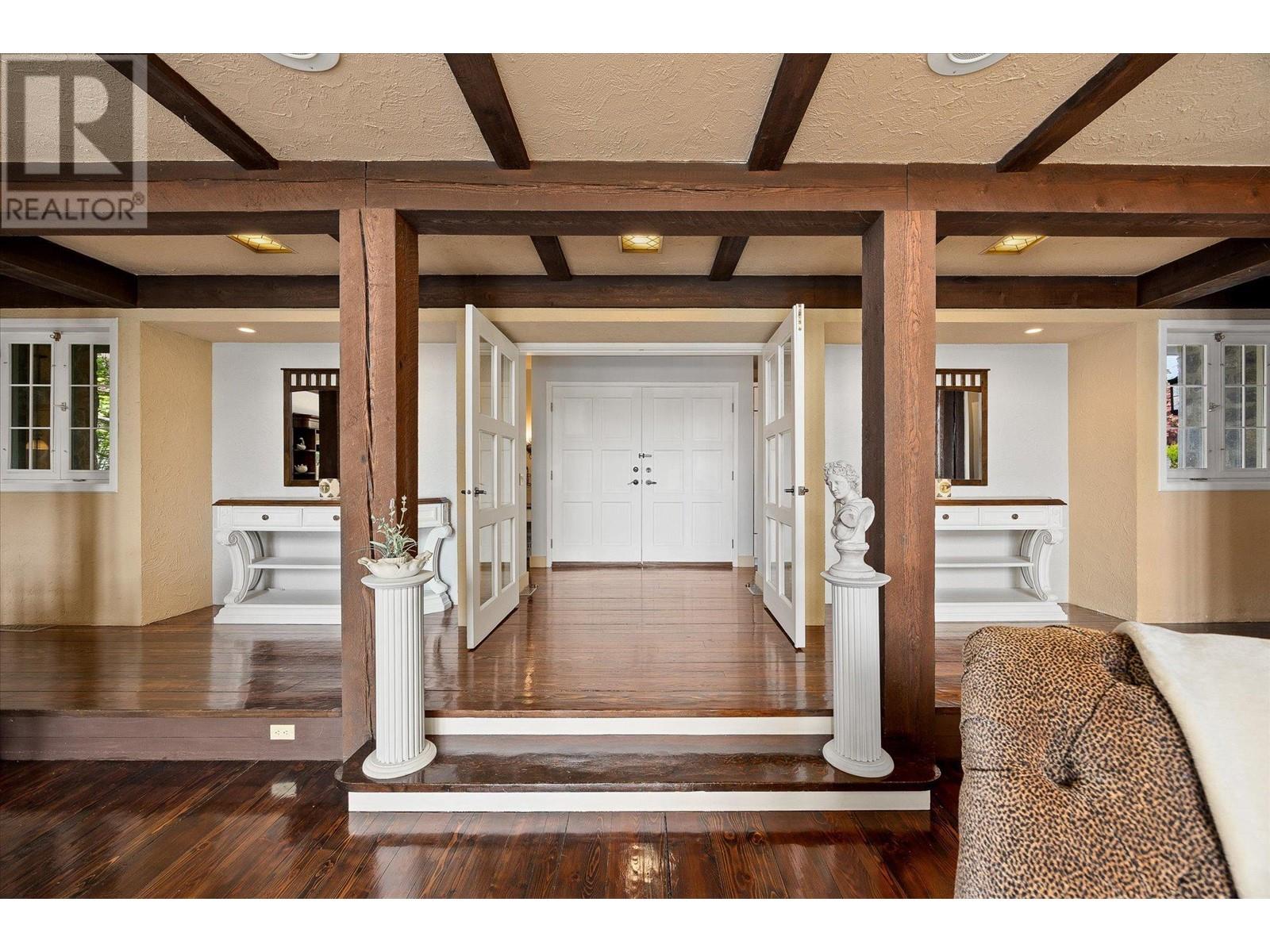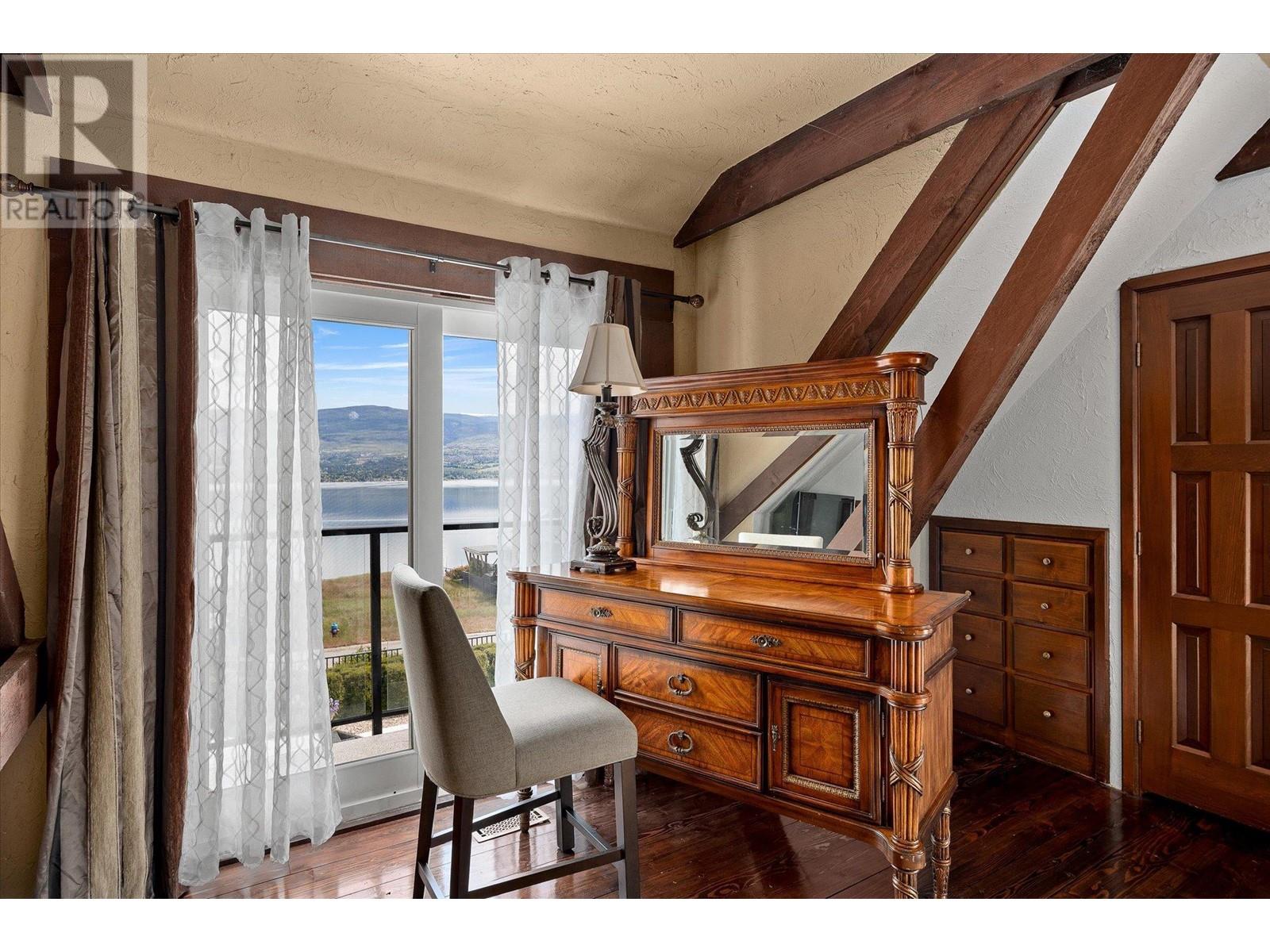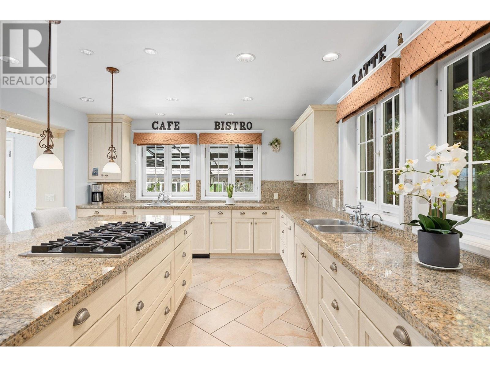 Set on a beautifully landscaped half-acre lot in the exclusive gated community of Thacker Ridge Estates, this remarkable estate home blends luxury, rustic charm, and timeless character. Enjoy breathtaking Okanagan Lake views from your private pool and patio, surrounded by an immaculately maintained yard. Inside, the home is filled with unique touches — rustic wood beams, soaring 20 foot ceilings, and charming secret passages. A grand double-door entrance leads to a sunken living room with a dramatic fireplace and a full wall of windows framing the lush outdoors. The entertainer’s kitchen offers a thoughtful layout with dual sinks, a gas cooktop, double ovens, an oversized fridge-freezer with custom cabinetry, and an adjoining statement dining room perfect for hosting. Upstairs, three spacious bedrooms each feature ensuites, creating private, tranquil retreats. Bonus spaces include a finished attic and a large basement with a recording studio and media room — not included in the main square footage — with 6’2” ceilings, offering extra flexibility and creative potential. An additional highlight is the cabana, complete with a commercial kitchen, bar, and bathroom, ideal for entertaining in resort-style comfort. This home masterfully balances grandeur and warmth, is minutes away from a number of world-class wineries, golf courses, and a short 5 minute drive from all the daily amenities you need, making it a rare and unforgettable opportunity that is perfect for Okanagan living. (id:58842)