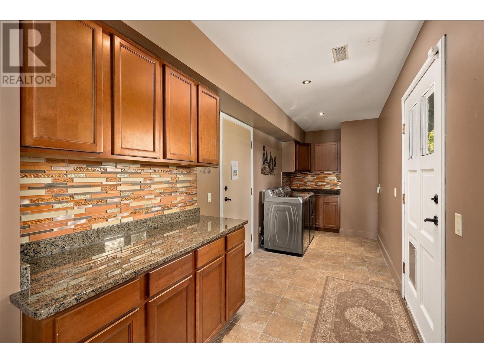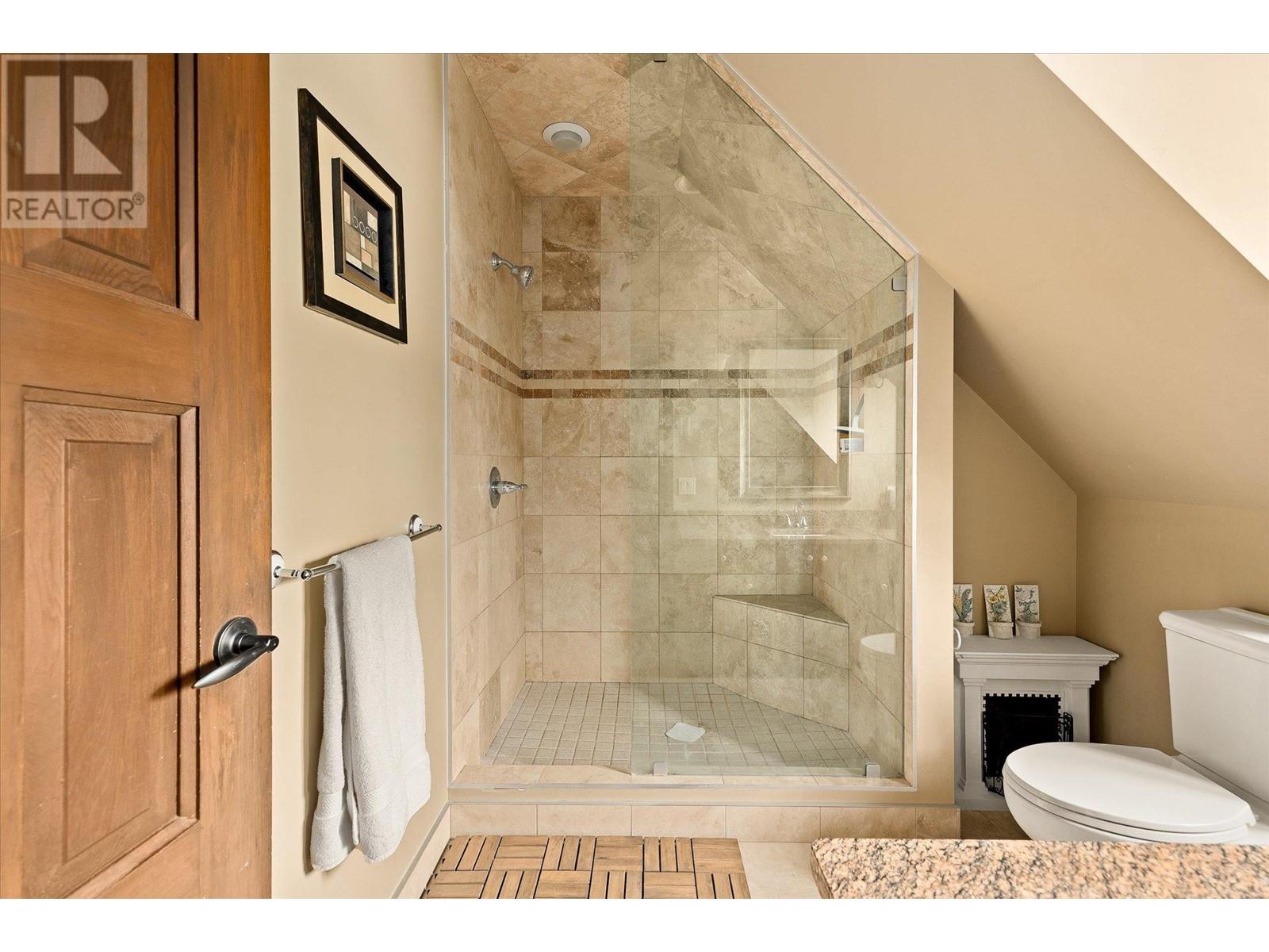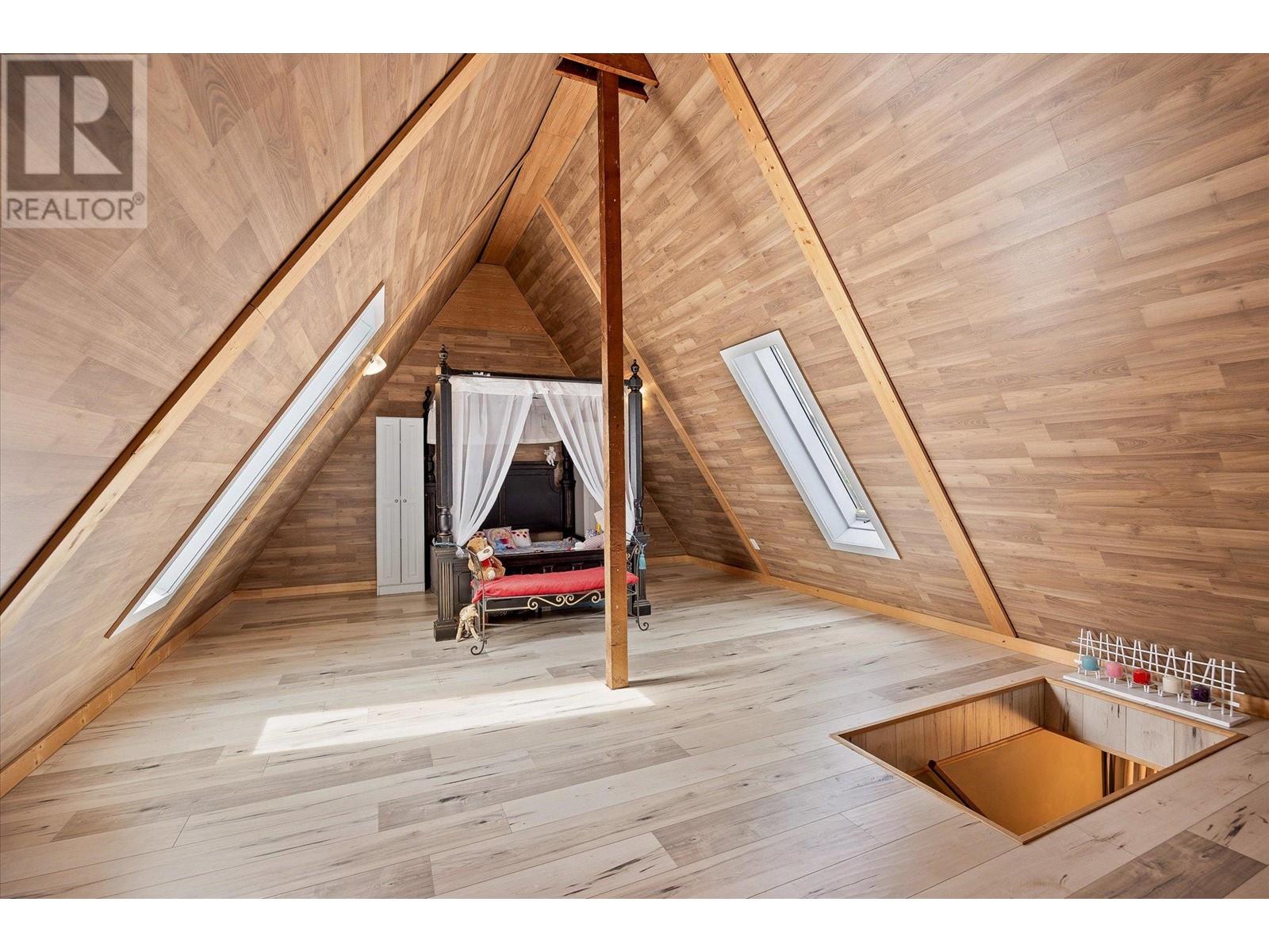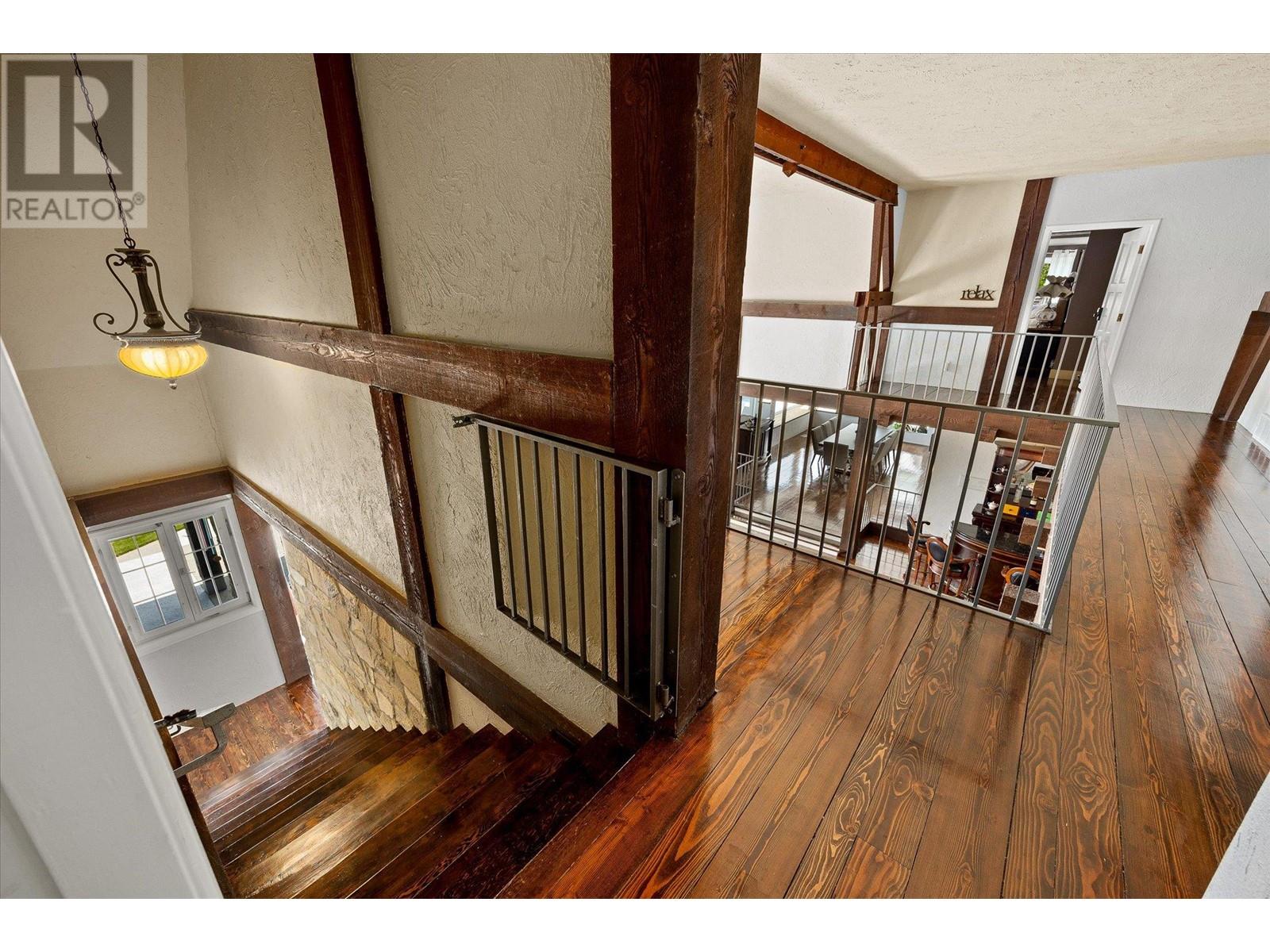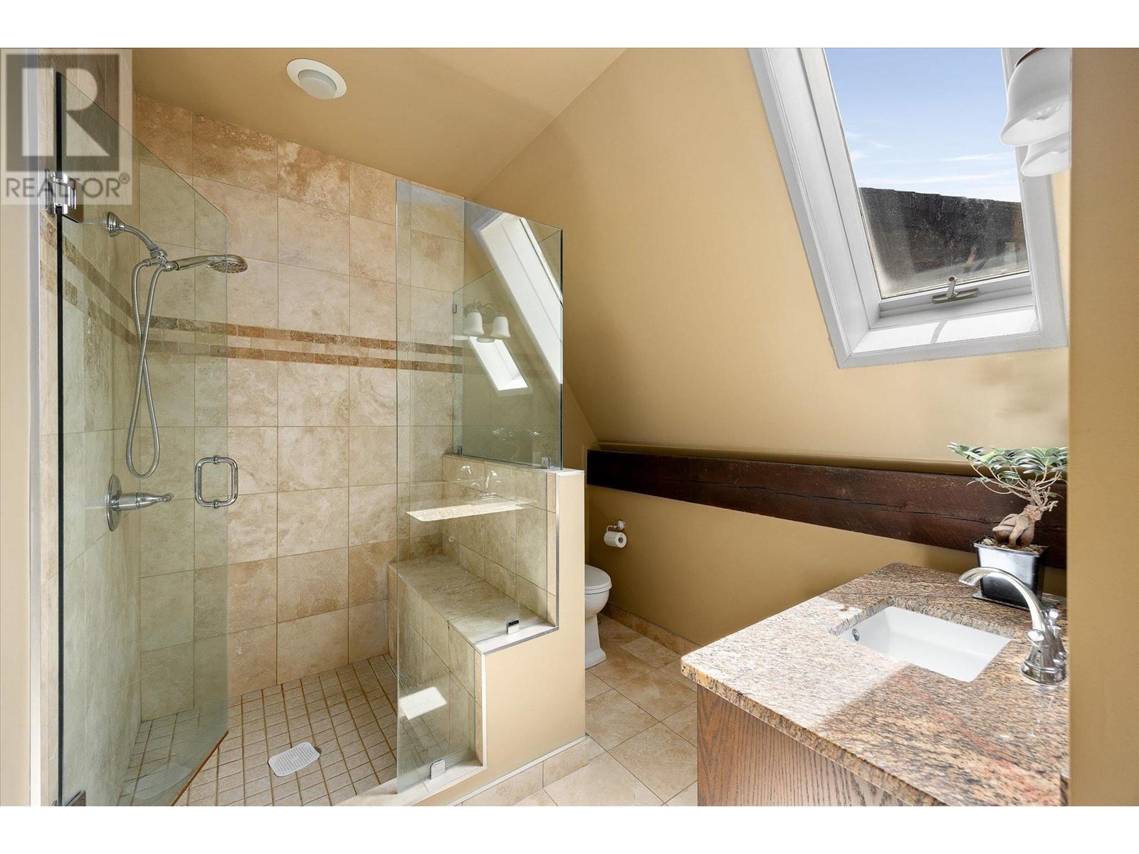 Set on a beautifully landscaped half-acre lot in the exclusive gated community of Thacker Ridge Estates, this remarkable estate home blends luxury, rustic charm, and timeless character. Enjoy breathtaking Okanagan Lake views from your private pool and patio, surrounded by an immaculately maintained yard. Inside, the home is filled with unique touches — rustic wood beams, soaring 20 foot ceilings, and charming secret passages. A grand double-door entrance leads to a sunken living room with a dramatic fireplace and a full wall of windows framing the lush outdoors. The entertainer’s kitchen offers a thoughtful layout with dual sinks, a gas cooktop, double ovens, an oversized fridge-freezer with custom cabinetry, and an adjoining statement dining room perfect for hosting. Upstairs, three spacious bedrooms each feature ensuites, creating private, tranquil retreats. Bonus spaces include a finished attic and a large basement with a recording studio and media room — not included in the main square footage — with 6’2” ceilings, offering extra flexibility and creative potential. An additional highlight is the cabana, complete with a commercial kitchen, bar, and bathroom, ideal for entertaining in resort-style comfort. This home masterfully balances grandeur and warmth, is minutes away from a number of world-class wineries, golf courses, and a short 5 minute drive from all the daily amenities you need, making it a rare and unforgettable opportunity that is perfect for Okanagan living. (id:58842)