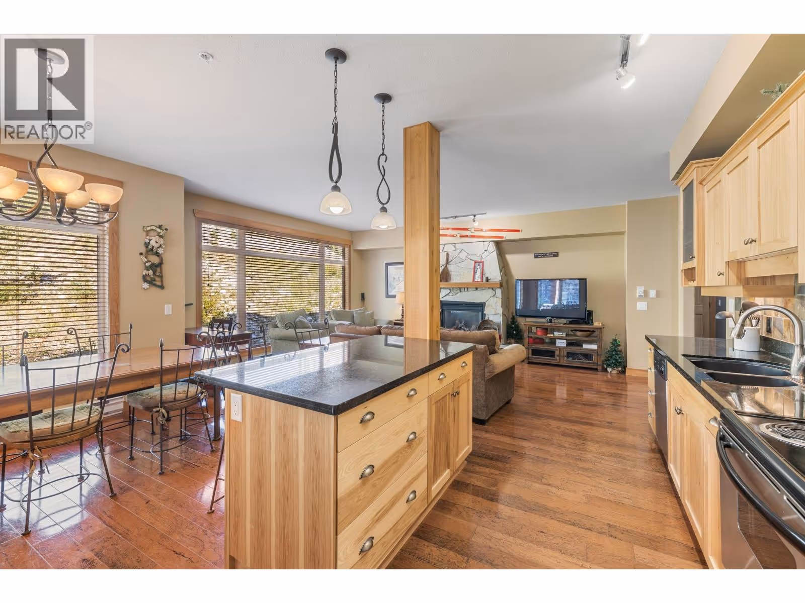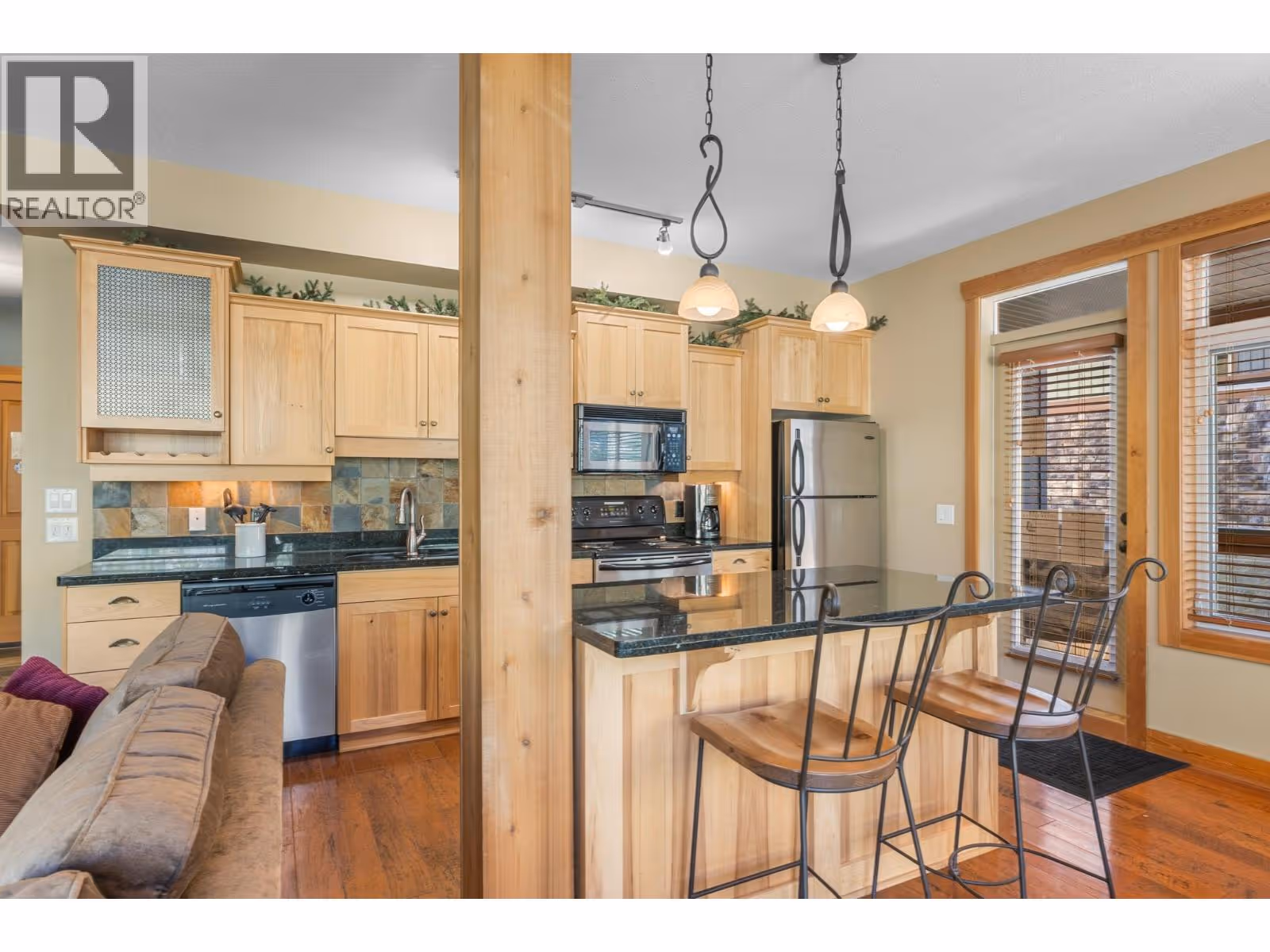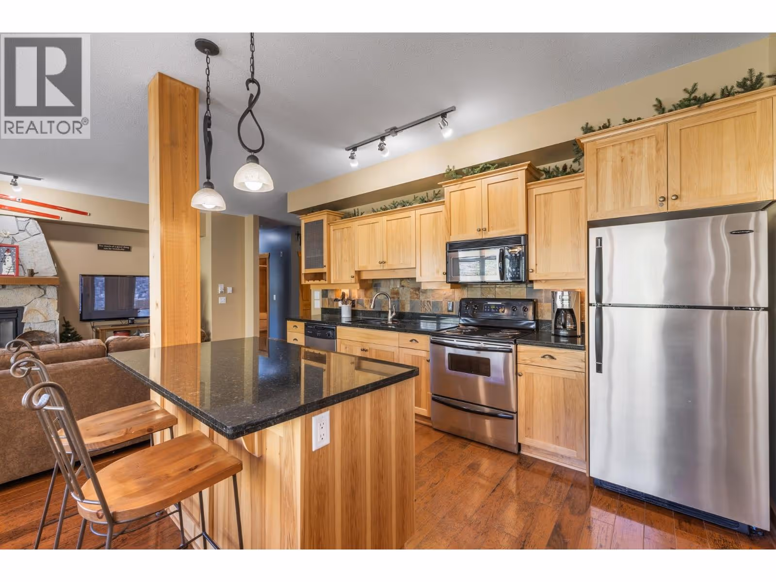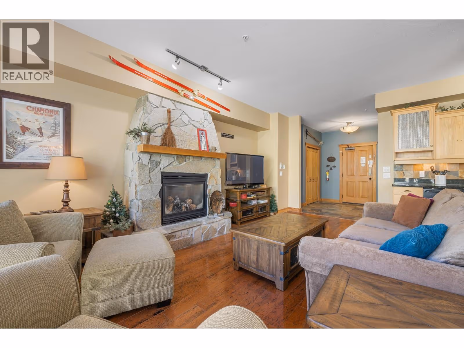 Discover mountain living at its finest in this stunning 2-bedroom, 2-bath corner unit in Glacier Lodge at Big White. Warm and inviting, this beautifully maintained condo features gleaming hardwood floors, a striking stone fireplace, and a bright, open layout designed for both comfort and style. Step out to your private covered deck and unwind in your own hot tub while soaking up the alpine atmosphere. With the convenience of in-suite laundry and the privacy of a corner location, this home is the perfect mountain retreat or investment property. Cozy yet spacious, it’s everything you’ve been looking for in a Big White getaway. (id:58842)
