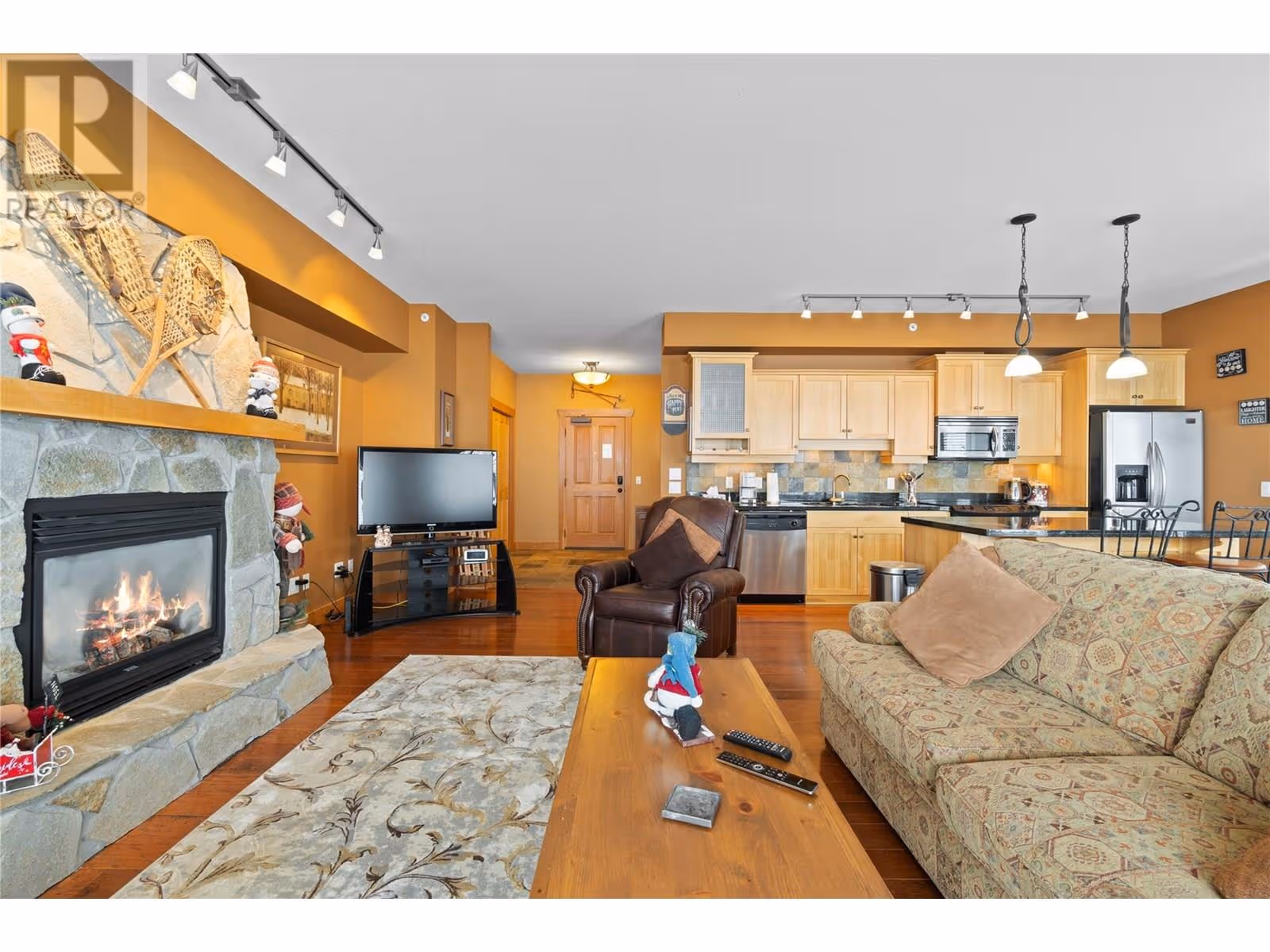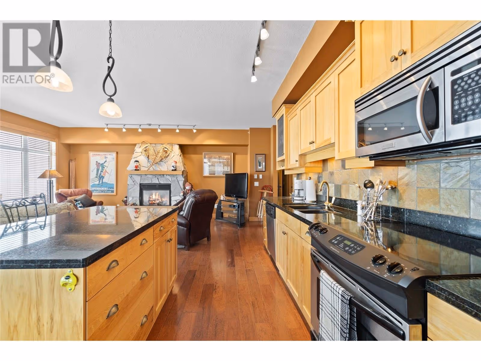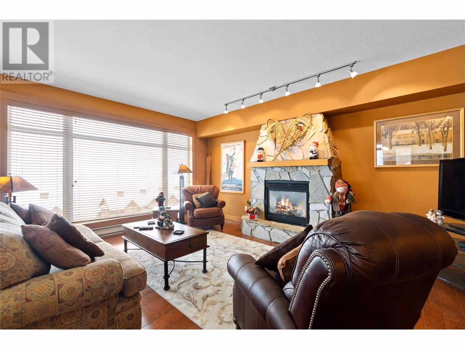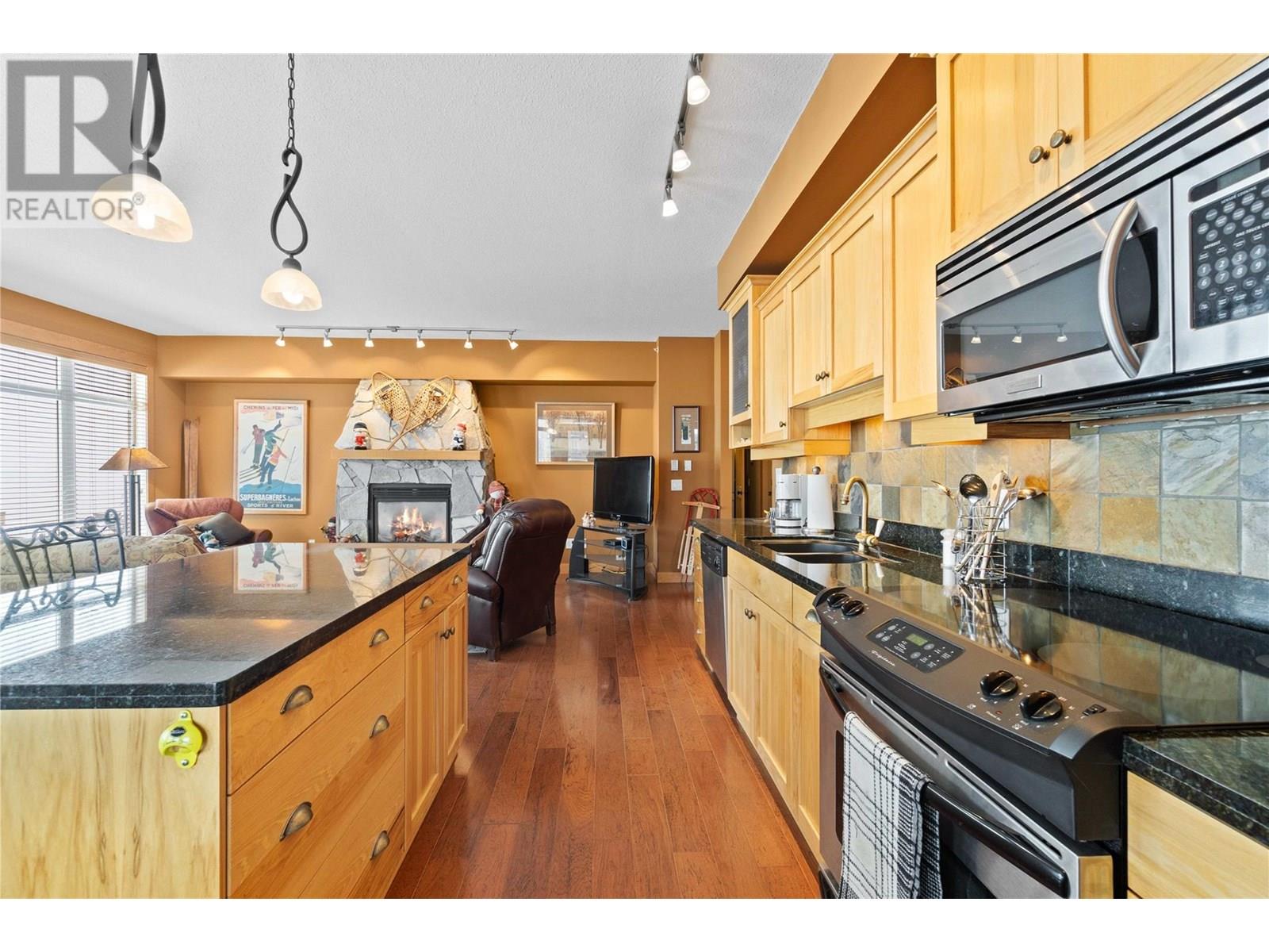Top floor corner unit ski chalet with unobstructed views in Big White's favorite boutique bldg: Glacier Lodge. This ski in/out former show home boasts 2 bd + 2 bath ;has simply incredible views of the valley, Monashees and weekly fireworks. Easy access with a ski bridge 25 steps to your front door. 2 secure underground parking stalls & 2 ski storage lockers just steps from the unit. Centrally located right on Happy Valley Way you are just mins to the village or gondola. Private hot tub/balcony. In-suite laundry. Stainless appliances, granite counters. New fridge+microwave. Hardwood flrs, heated slate tiles, steam shower. Spacious entry, stone fireplace and over height ceilings. Smart floor plan with space to entertain or host family. Owner occupied, the unit has never been rented, well run strata and the unit is in excellent condition. No rental restrictions or revenue share required. Sold turn key ready to occupy for Jan 1 with all furniture, decor and linens/sundries. Sleeps 8. Newer washer/dryer, h/w tank, vacuum and under cabinet lighting. Measurements are approx. (id:58842)