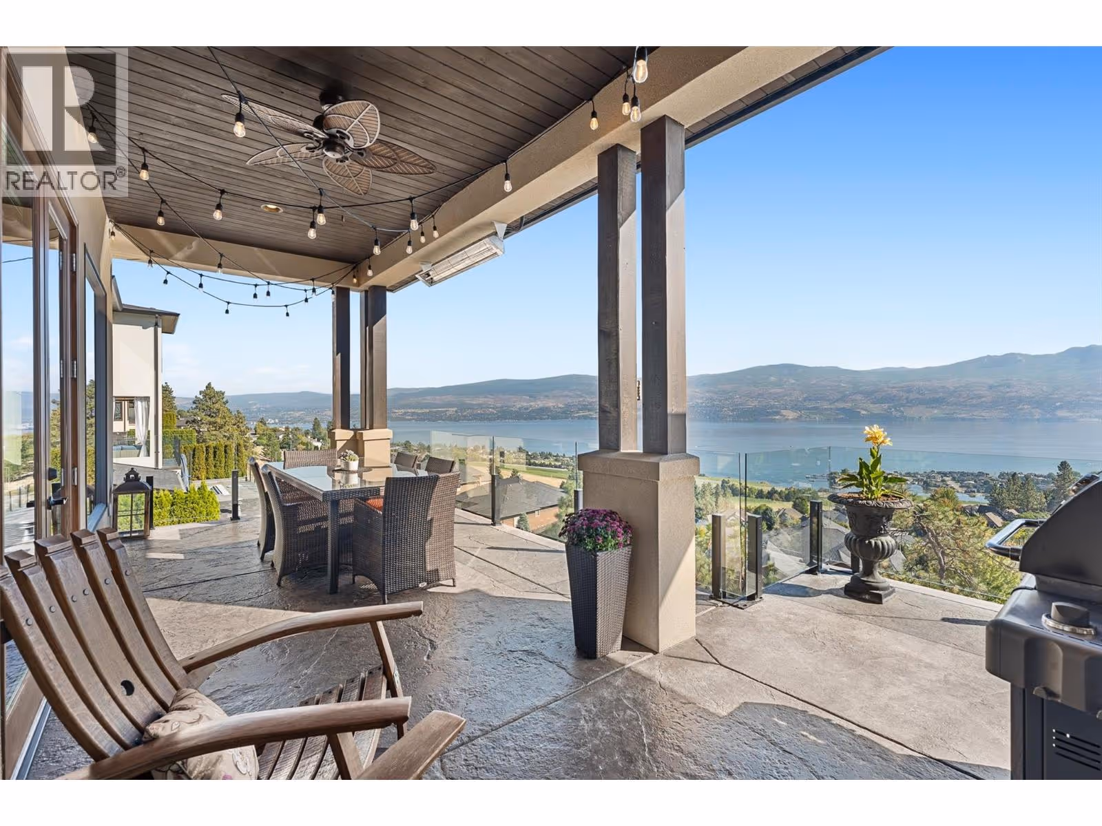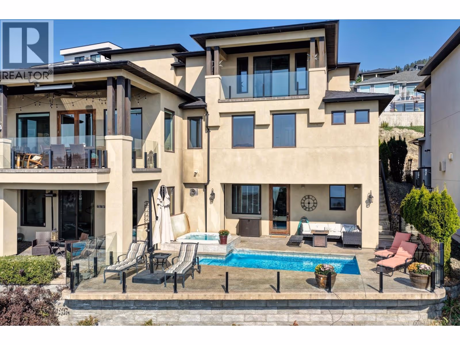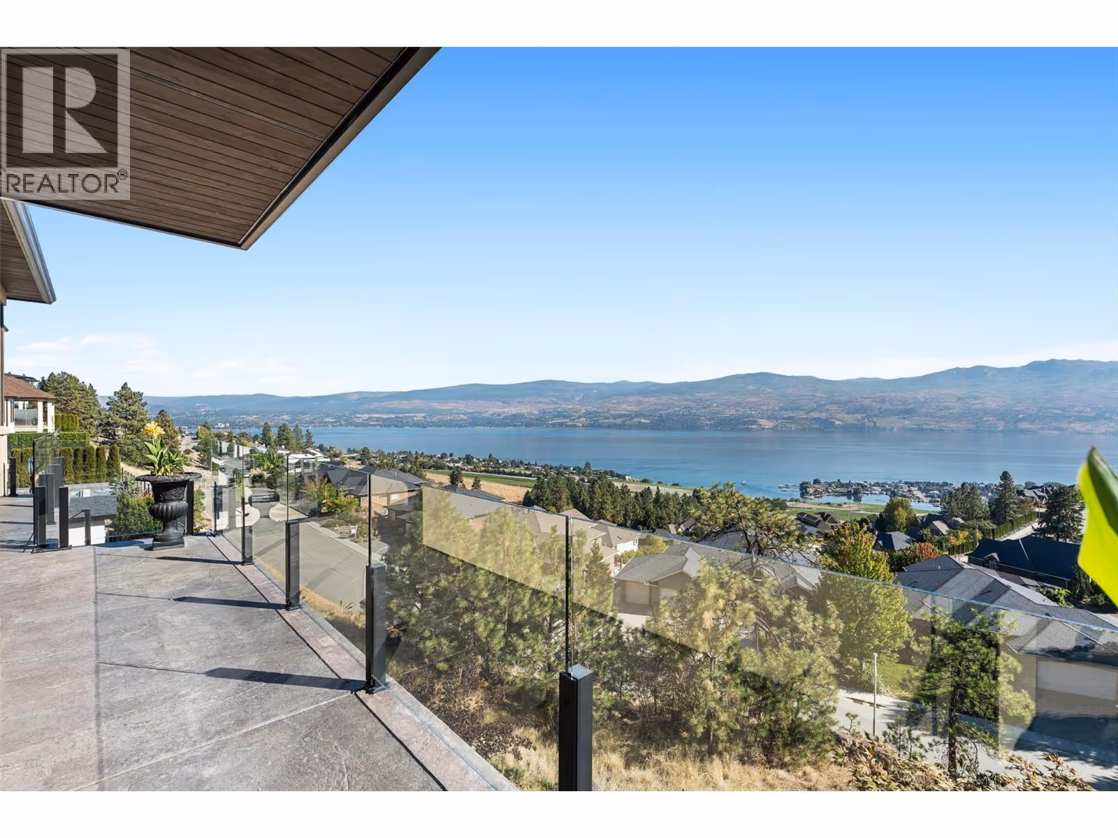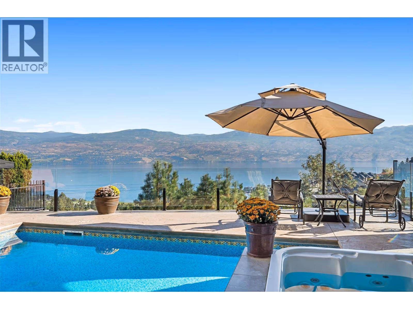 Set in one of West Kelowna’s most coveted neighbourhoods, this home blends timeless design with sweeping views of Okanagan Lake. It features 4 bedrooms plus a self-contained studio suite—ideal for extended family or guests. Inside, soaring ceilings with timber beams, and stone accents create an atmosphere both warm and sophisticated. The open-concept great room flows seamlessly to a covered lakeview deck with wood-inlay ceilings, and infrared heaters—perfect for year-round enjoyment. This kitchen showcases hardwood floors, granite countertops, a contrasting island with seating, shaker-style cabinetry, and premium Bosch and Bertazzoni appliances, all connected to the living area. The entire upper level is dedicated to the primary suite, a private sanctuary offering two walk-in closets and a spa-inspired ensuite with heated travertine floors, a soaker tub, and walk-in shower. Step onto the covered balcony to take in panoramic lake and valley vistas. The lower level is designed for entertaining, complete with a bright recreation room, custom bar, and walkout access to the pool terrace. Outdoors, relax beside the pool, soak in the hot tub, or gather around the firepit, all framed by manicured landscaping and tranquil water features. Oversized double garage, abundant storage, and a tiled dog wash. Every detail has been carefully considered, creating a residence that balances refined design, modern comfort, and the unmatched lifestyle of Lakeview Heights. (id:58842)