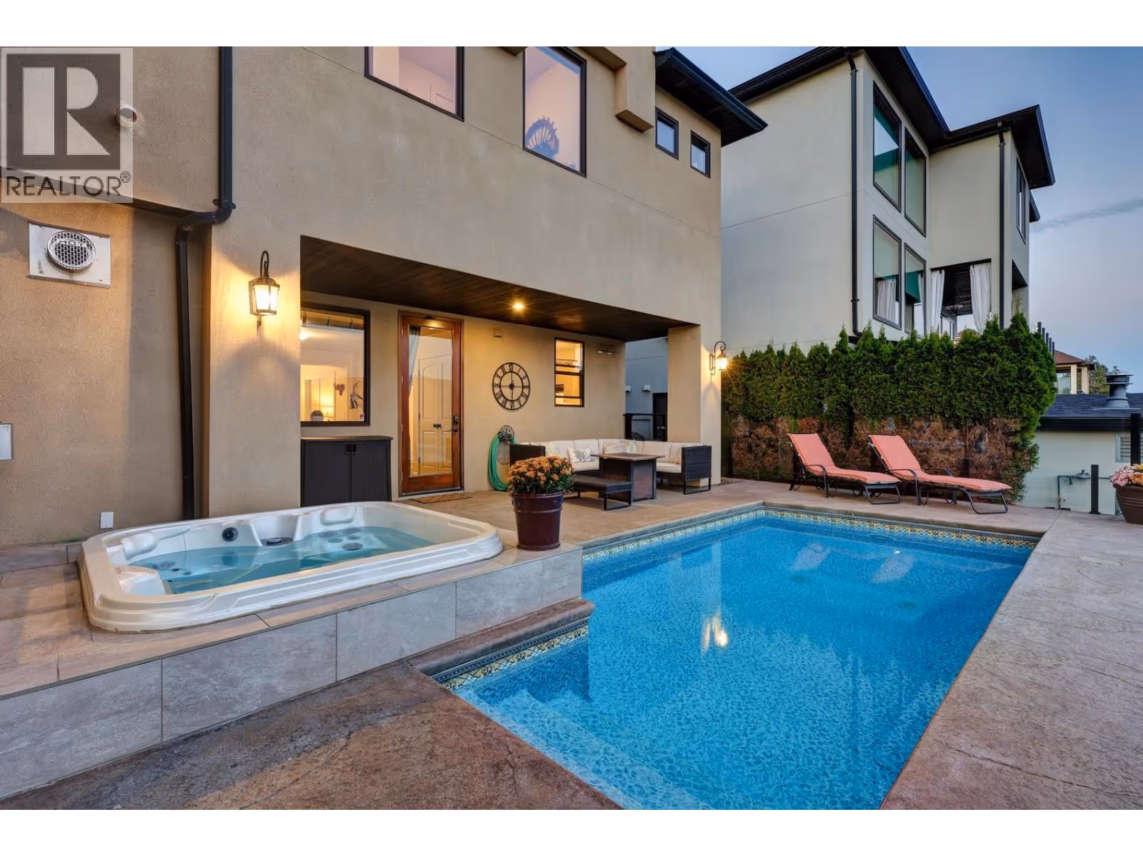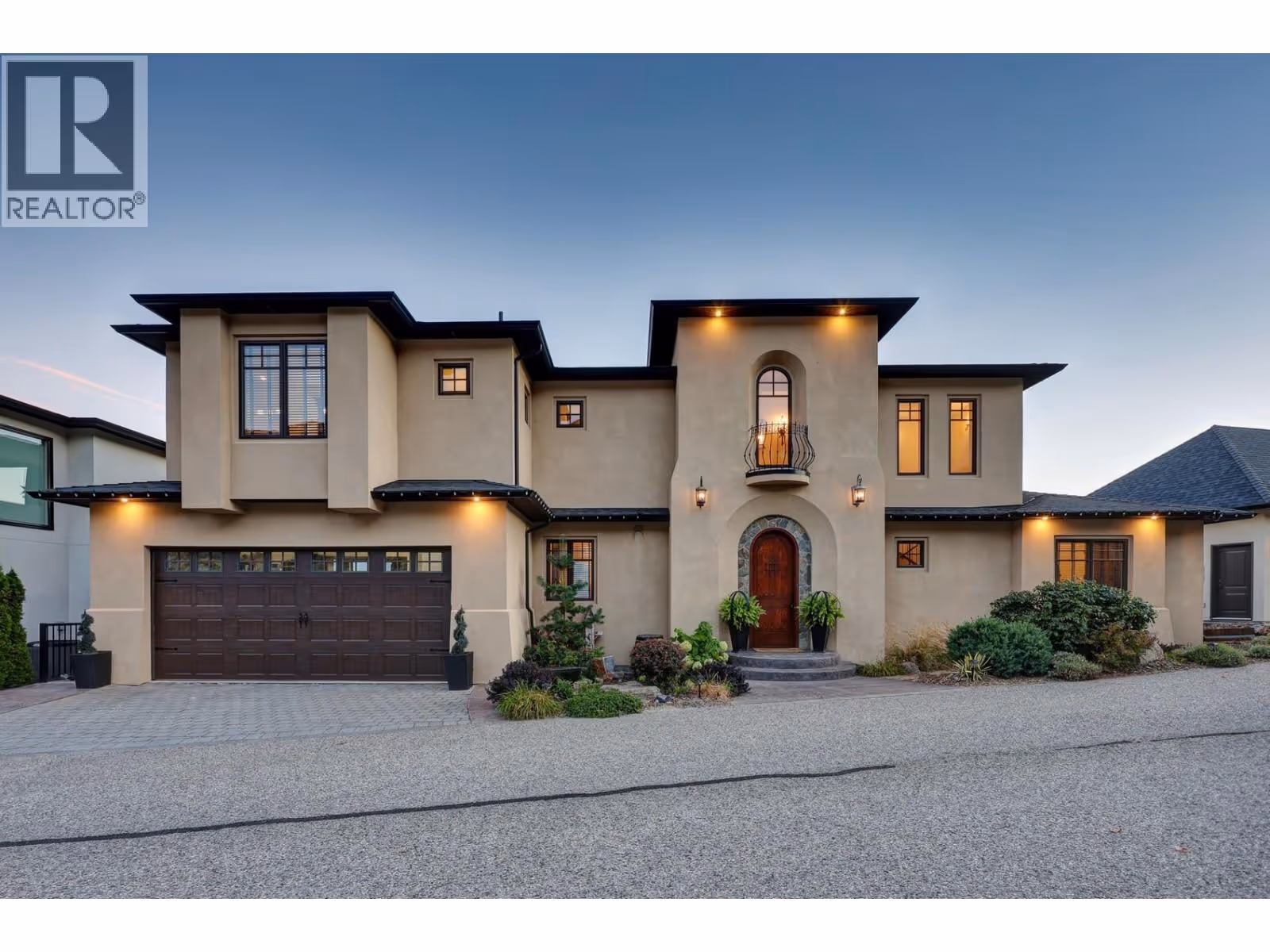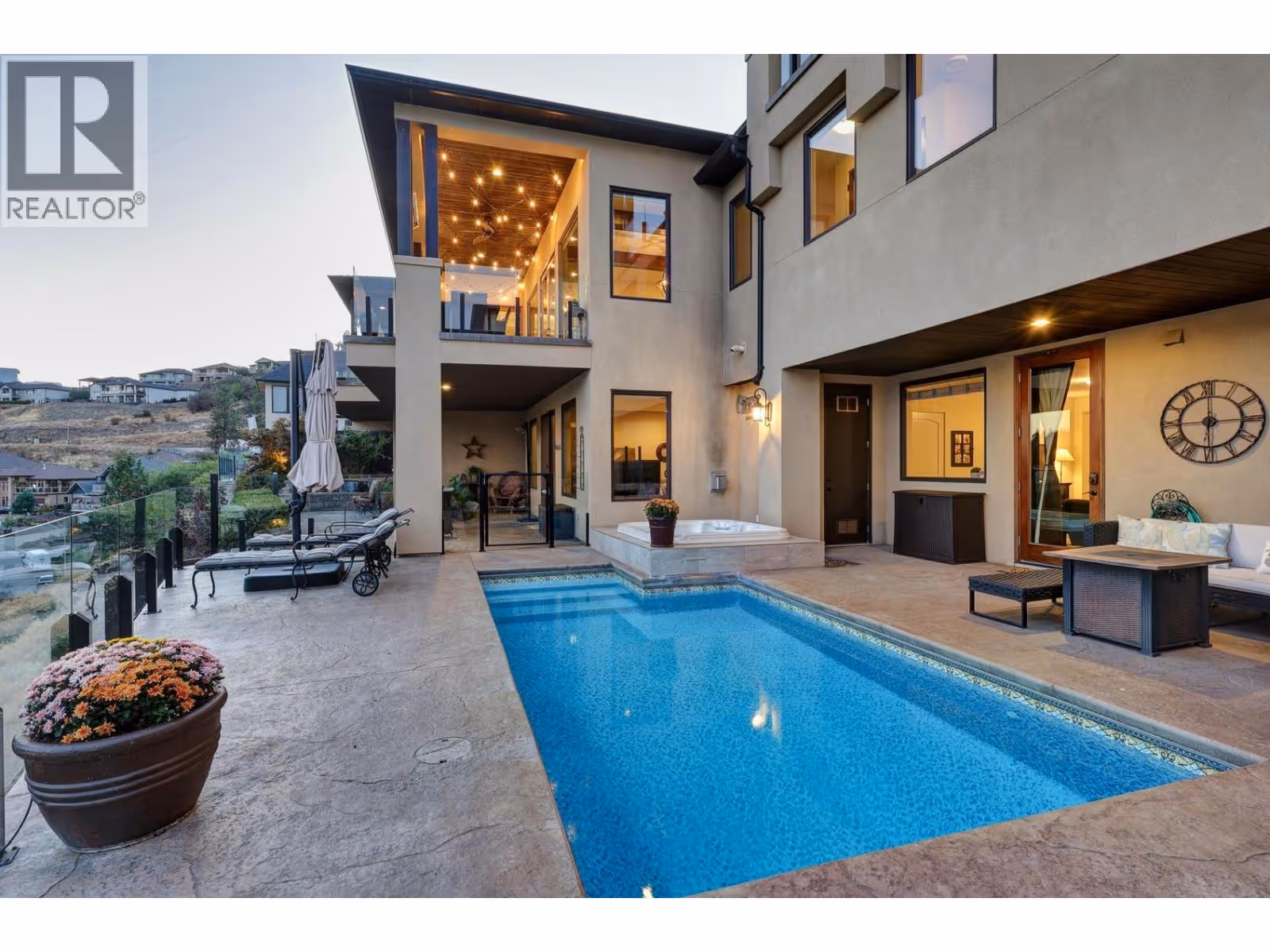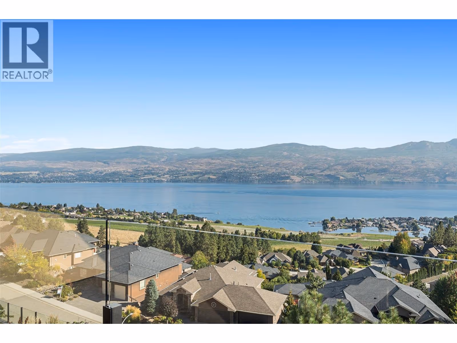 Set in one of West Kelowna’s most coveted neighbourhoods, this home blends timeless design with sweeping views of Okanagan Lake. It features 4 bedrooms plus a self-contained studio suite—ideal for extended family or guests. Inside, soaring ceilings with timber beams, and stone accents create an atmosphere both warm and sophisticated. The open-concept great room flows seamlessly to a covered lakeview deck with wood-inlay ceilings, and infrared heaters—perfect for year-round enjoyment. This kitchen showcases hardwood floors, granite countertops, a contrasting island with seating, shaker-style cabinetry, and premium Bosch and Bertazzoni appliances, all connected to the living area. The entire upper level is dedicated to the primary suite, a private sanctuary offering two walk-in closets and a spa-inspired ensuite with heated travertine floors, a soaker tub, and walk-in shower. Step onto the covered balcony to take in panoramic lake and valley vistas. The lower level is designed for entertaining, complete with a bright recreation room, custom bar, and walkout access to the pool terrace. Outdoors, relax beside the pool, soak in the hot tub, or gather around the firepit, all framed by manicured landscaping and tranquil water features. Oversized double garage, abundant storage, and a tiled dog wash. Every detail has been carefully considered, creating a residence that balances refined design, modern comfort, and the unmatched lifestyle of Lakeview Heights. (id:58842)