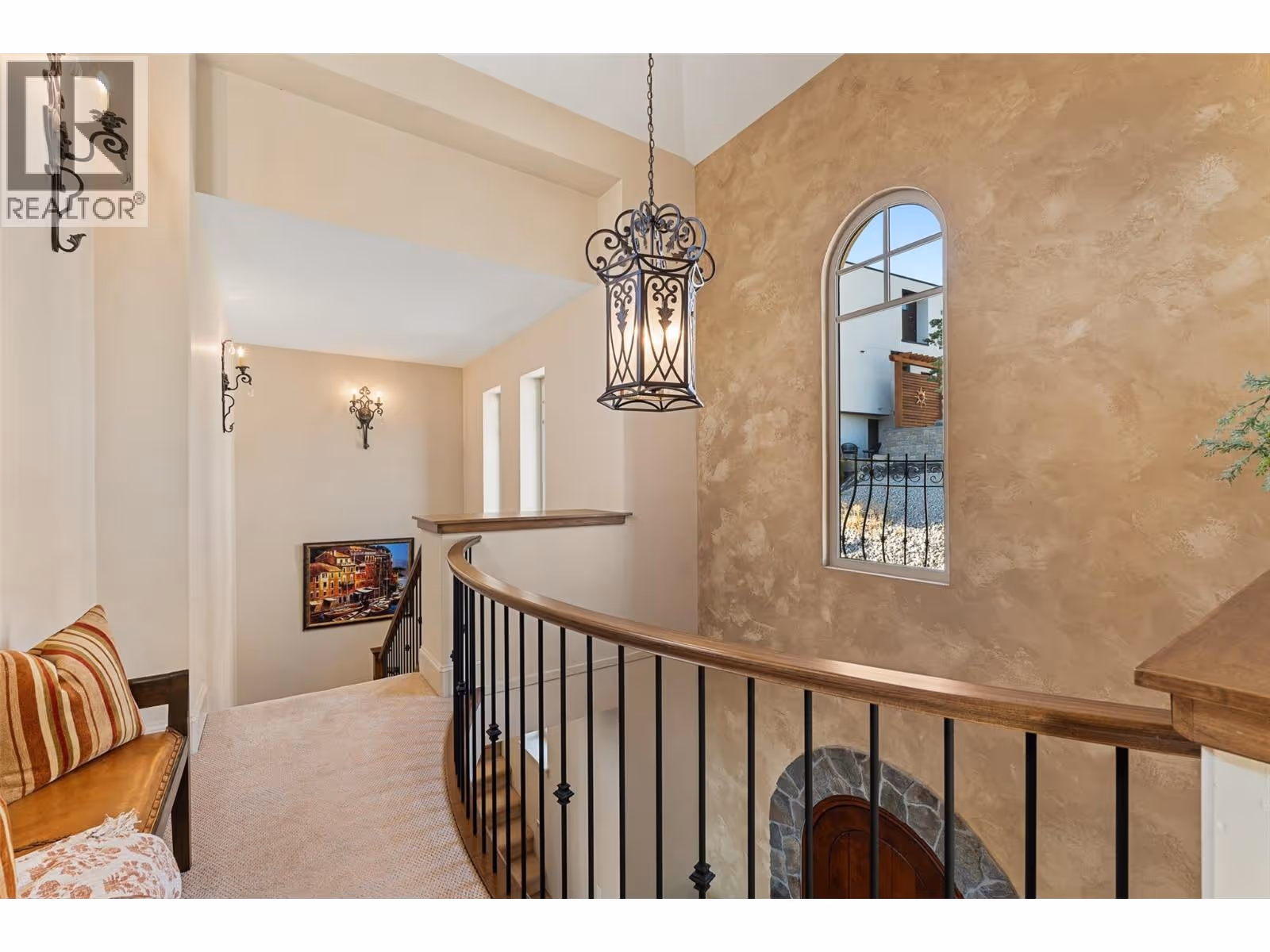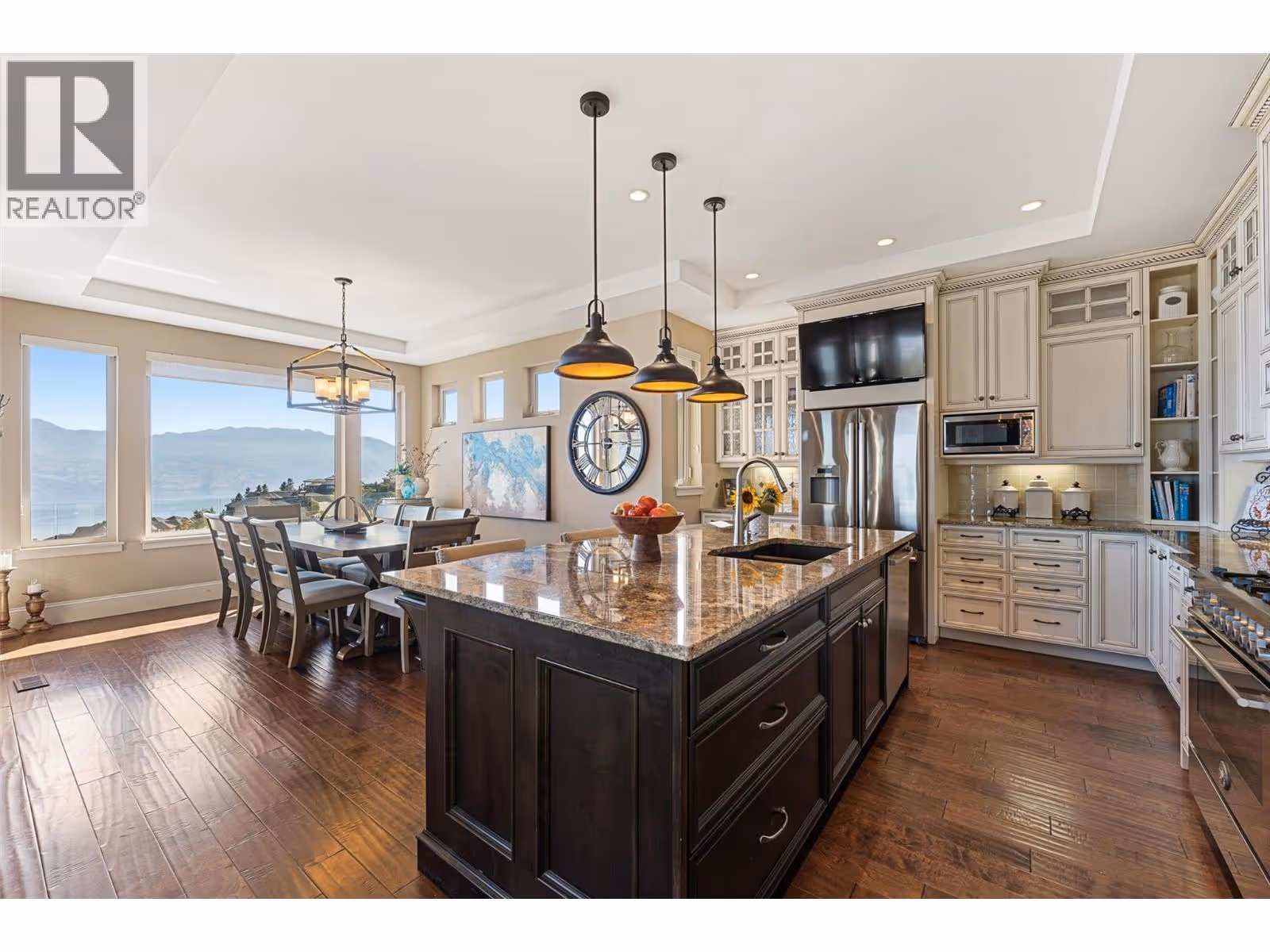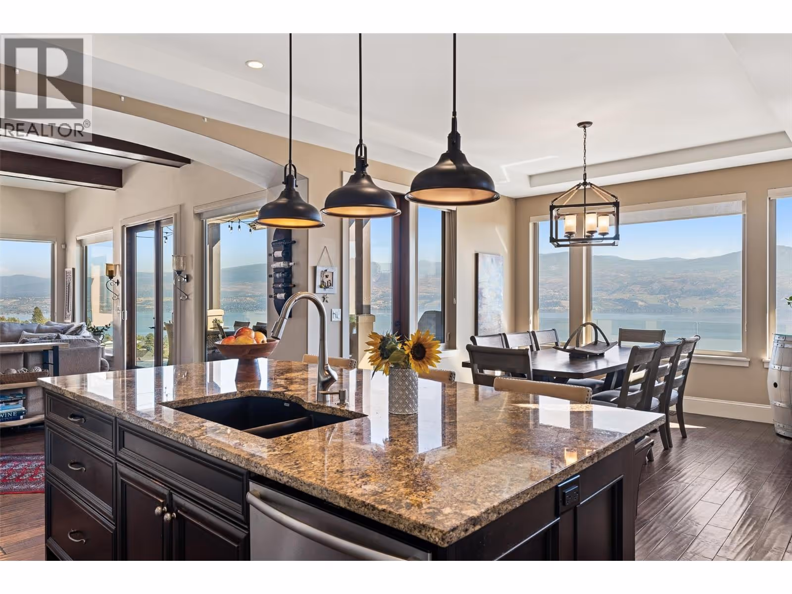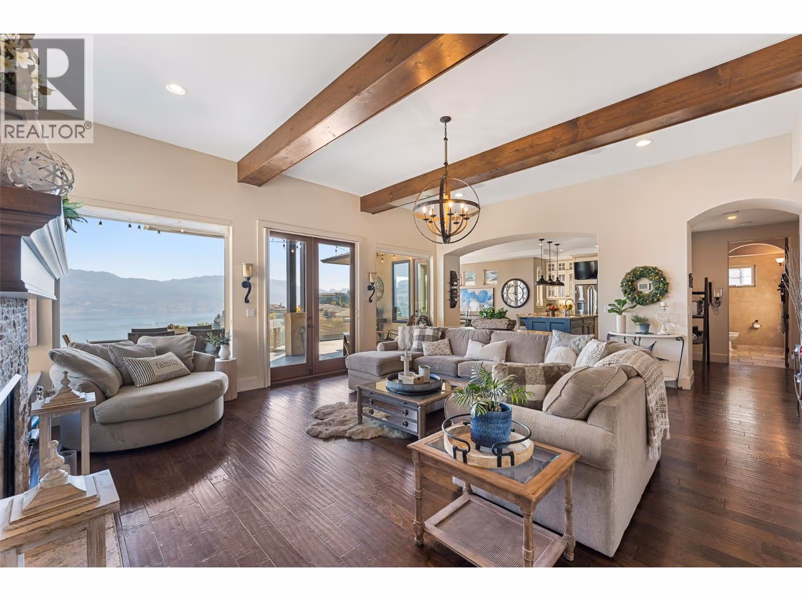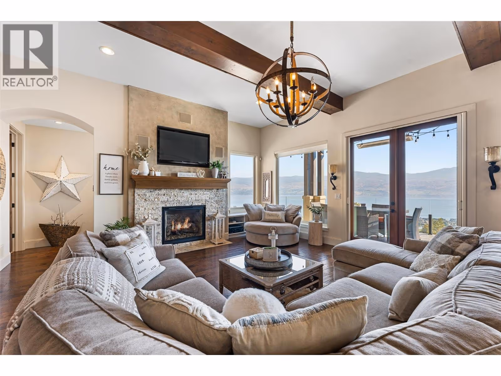 Set in one of West Kelowna’s most coveted neighbourhoods, this home blends timeless design with sweeping views of Okanagan Lake. It features 4 bedrooms plus a self-contained studio suite—ideal for extended family or guests. Inside, soaring ceilings with timber beams, and stone accents create an atmosphere both warm and sophisticated. The open-concept great room flows seamlessly to a covered lakeview deck with wood-inlay ceilings, and infrared heaters—perfect for year-round enjoyment. This kitchen showcases hardwood floors, granite countertops, a contrasting island with seating, shaker-style cabinetry, and premium Bosch and Bertazzoni appliances, all connected to the living area. The entire upper level is dedicated to the primary suite, a private sanctuary offering two walk-in closets and a spa-inspired ensuite with heated travertine floors, a soaker tub, and walk-in shower. Step onto the covered balcony to take in panoramic lake and valley vistas. The lower level is designed for entertaining, complete with a bright recreation room, custom bar, and walkout access to the pool terrace. Outdoors, relax beside the pool, soak in the hot tub, or gather around the firepit, all framed by manicured landscaping and tranquil water features. Oversized double garage, abundant storage, and a tiled dog wash. Every detail has been carefully considered, creating a residence that balances refined design, modern comfort, and the unmatched lifestyle of Lakeview Heights. (id:58842)