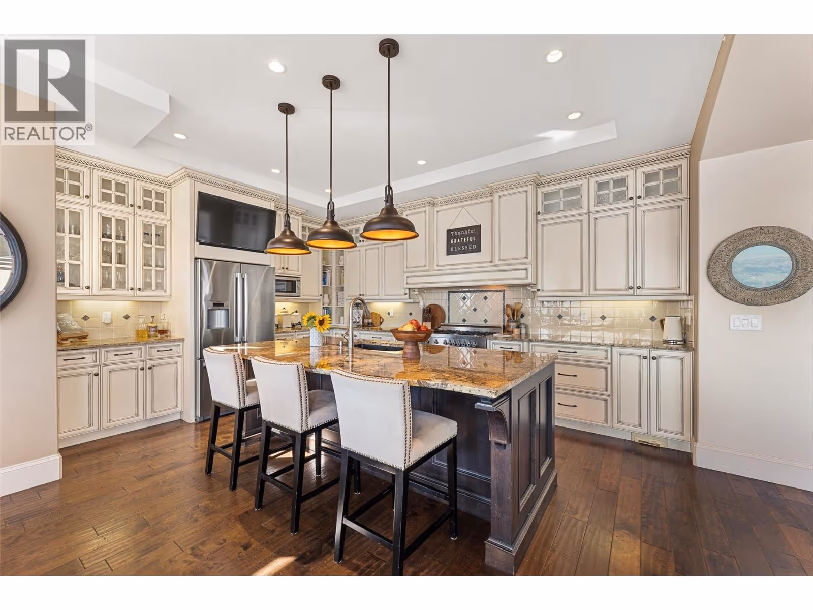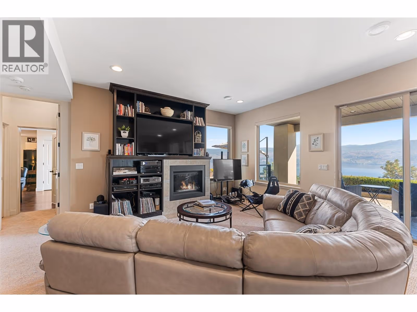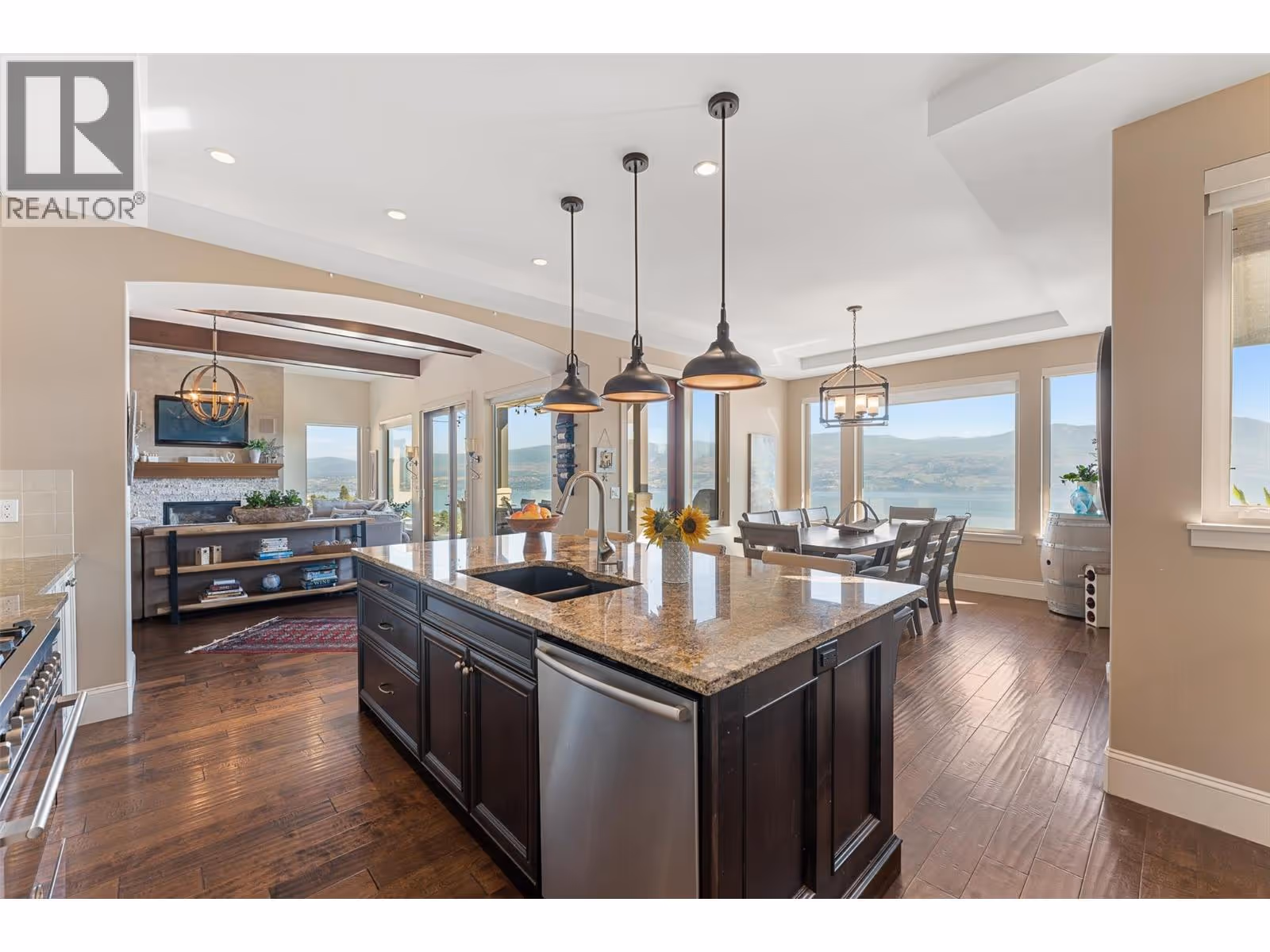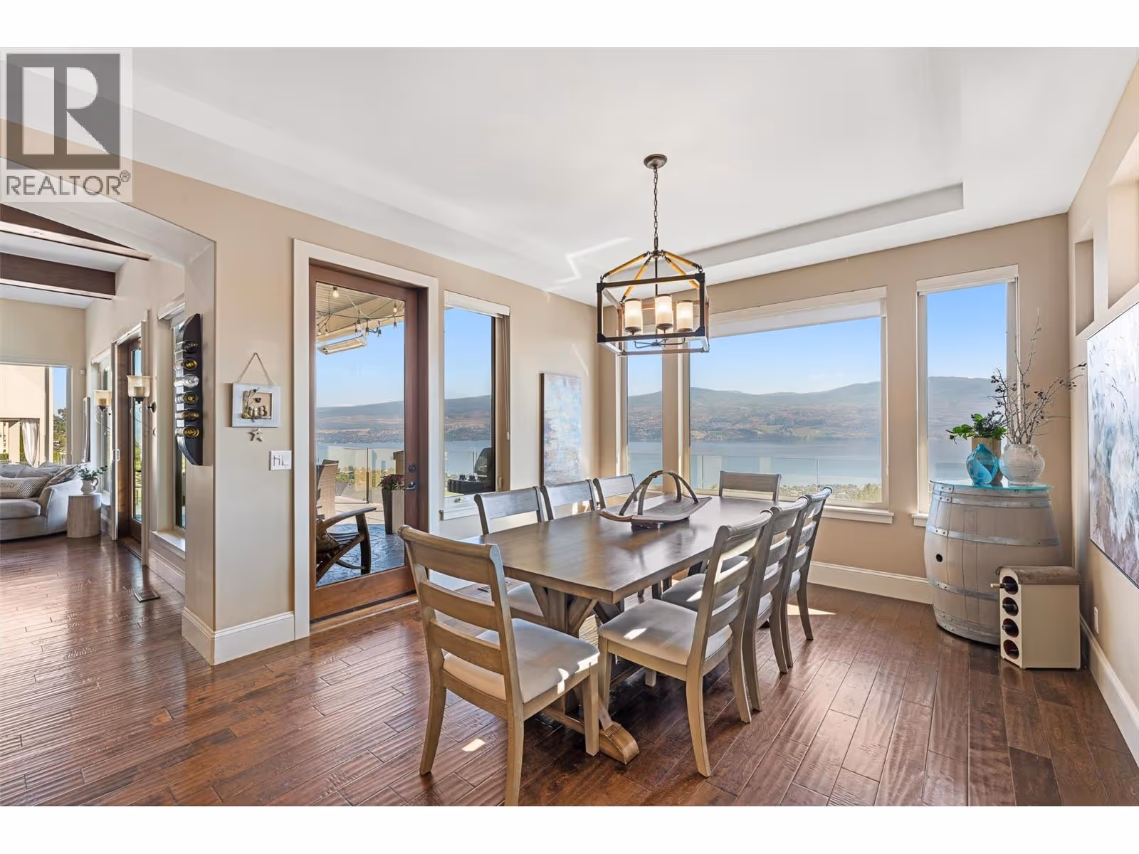 Set in one of West Kelowna’s most coveted neighbourhoods, this home blends timeless design with sweeping views of Okanagan Lake. It features 4 bedrooms plus a self-contained studio suite—ideal for extended family or guests. Inside, soaring ceilings with timber beams, and stone accents create an atmosphere both warm and sophisticated. The open-concept great room flows seamlessly to a covered lakeview deck with wood-inlay ceilings, and infrared heaters—perfect for year-round enjoyment. This kitchen showcases hardwood floors, granite countertops, a contrasting island with seating, shaker-style cabinetry, and premium Bosch and Bertazzoni appliances, all connected to the living area. The entire upper level is dedicated to the primary suite, a private sanctuary offering two walk-in closets and a spa-inspired ensuite with heated travertine floors, a soaker tub, and walk-in shower. Step onto the covered balcony to take in panoramic lake and valley vistas. The lower level is designed for entertaining, complete with a bright recreation room, custom bar, and walkout access to the pool terrace. Outdoors, relax beside the pool, soak in the hot tub, or gather around the firepit, all framed by manicured landscaping and tranquil water features. Oversized double garage, abundant storage, and a tiled dog wash. Every detail has been carefully considered, creating a residence that balances refined design, modern comfort, and the unmatched lifestyle of Lakeview Heights. (id:58842)