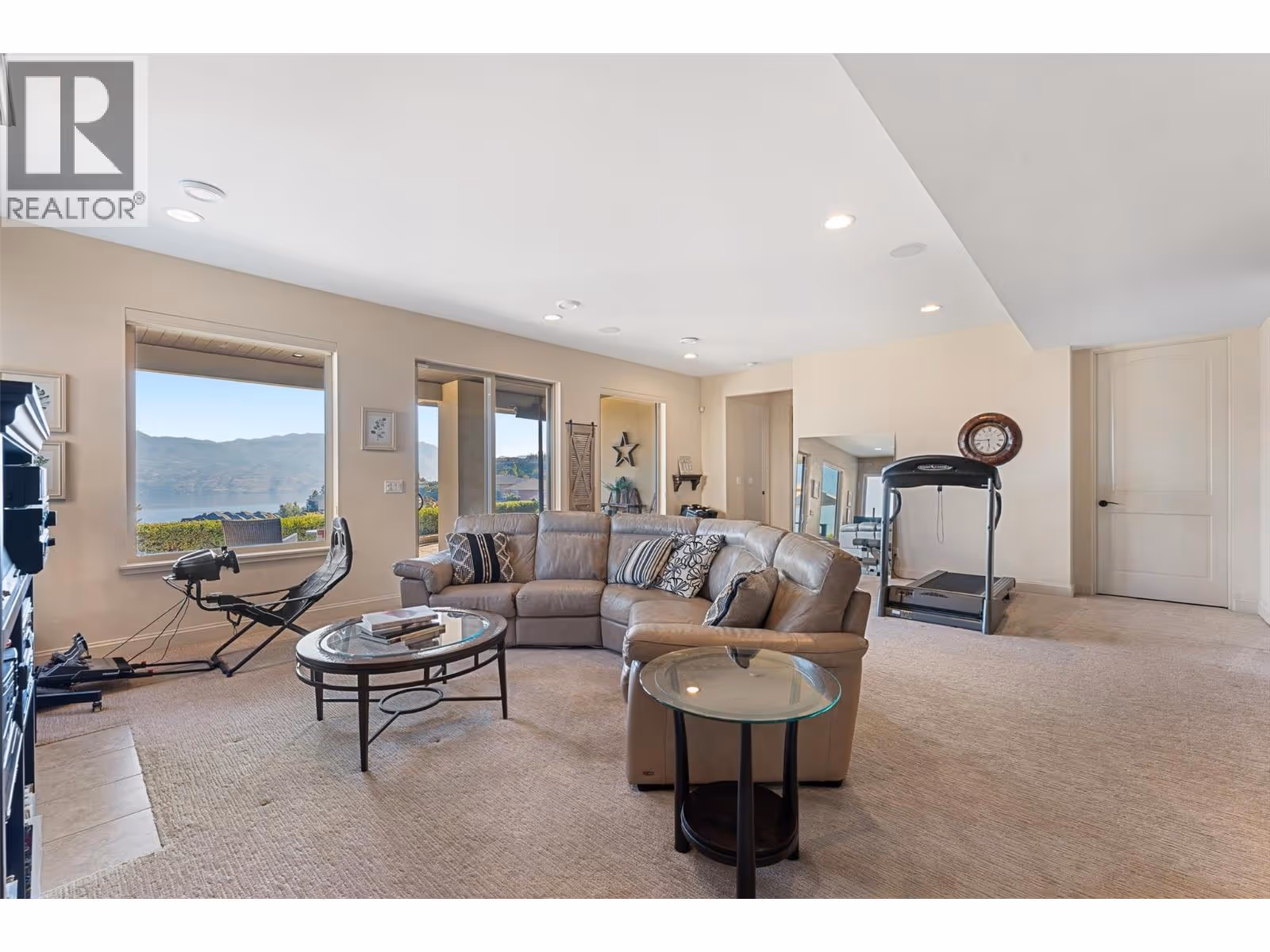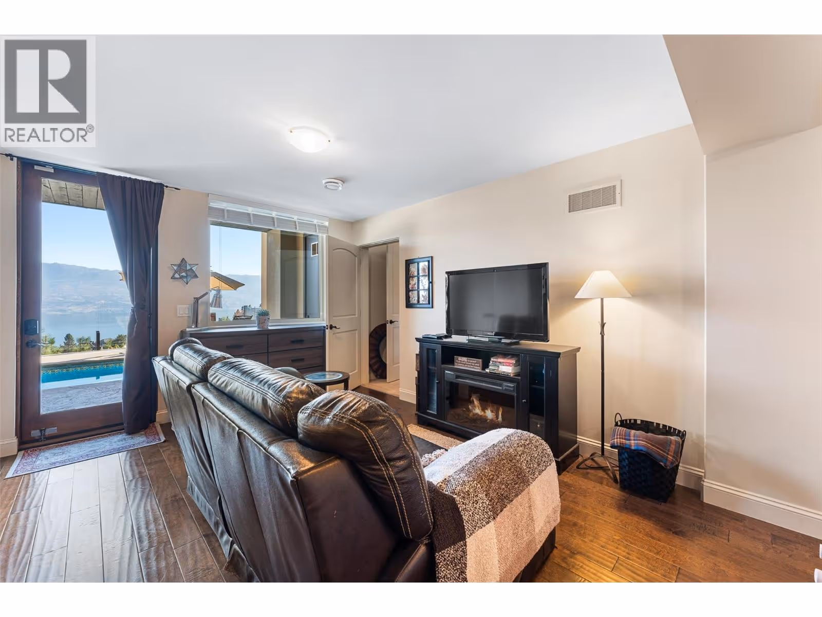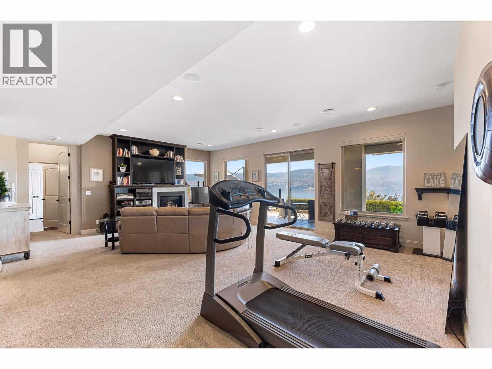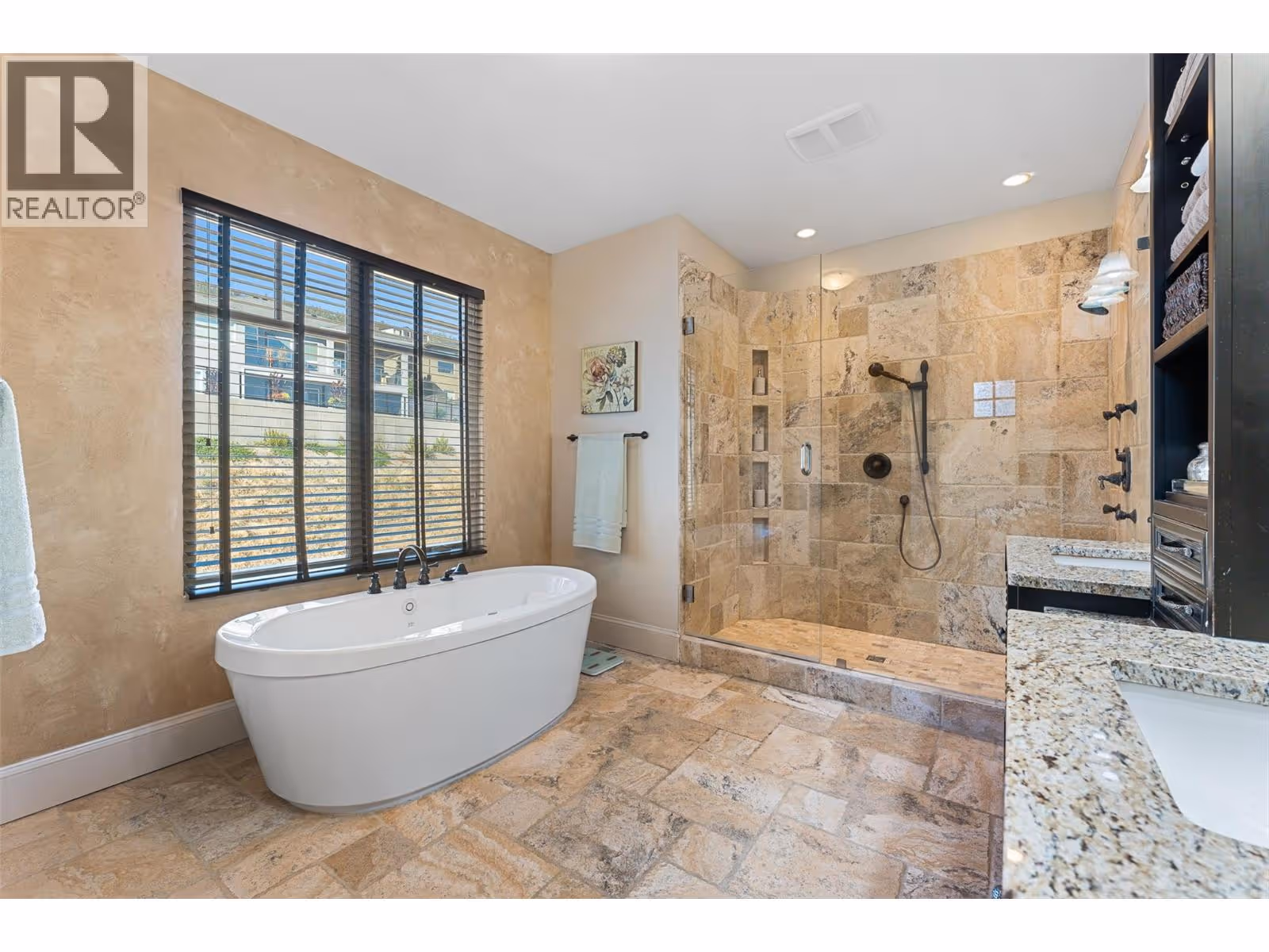 Set in one of West Kelowna’s most coveted neighbourhoods, this home blends timeless design with sweeping views of Okanagan Lake. It features 4 bedrooms plus a self-contained studio suite—ideal for extended family or guests. Inside, soaring ceilings with timber beams, and stone accents create an atmosphere both warm and sophisticated. The open-concept great room flows seamlessly to a covered lakeview deck with wood-inlay ceilings, and infrared heaters—perfect for year-round enjoyment. This kitchen showcases hardwood floors, granite countertops, a contrasting island with seating, shaker-style cabinetry, and premium Bosch and Bertazzoni appliances, all connected to the living area. The entire upper level is dedicated to the primary suite, a private sanctuary offering two walk-in closets and a spa-inspired ensuite with heated travertine floors, a soaker tub, and walk-in shower. Step onto the covered balcony to take in panoramic lake and valley vistas. The lower level is designed for entertaining, complete with a bright recreation room, custom bar, and walkout access to the pool terrace. Outdoors, relax beside the pool, soak in the hot tub, or gather around the firepit, all framed by manicured landscaping and tranquil water features. Oversized double garage, abundant storage, and a tiled dog wash. Every detail has been carefully considered, creating a residence that balances refined design, modern comfort, and the unmatched lifestyle of Lakeview Heights. (id:58842)