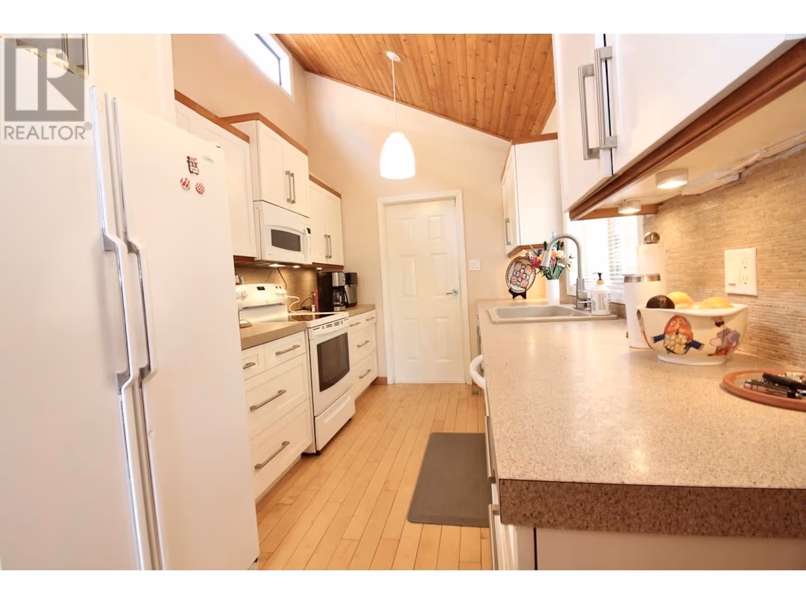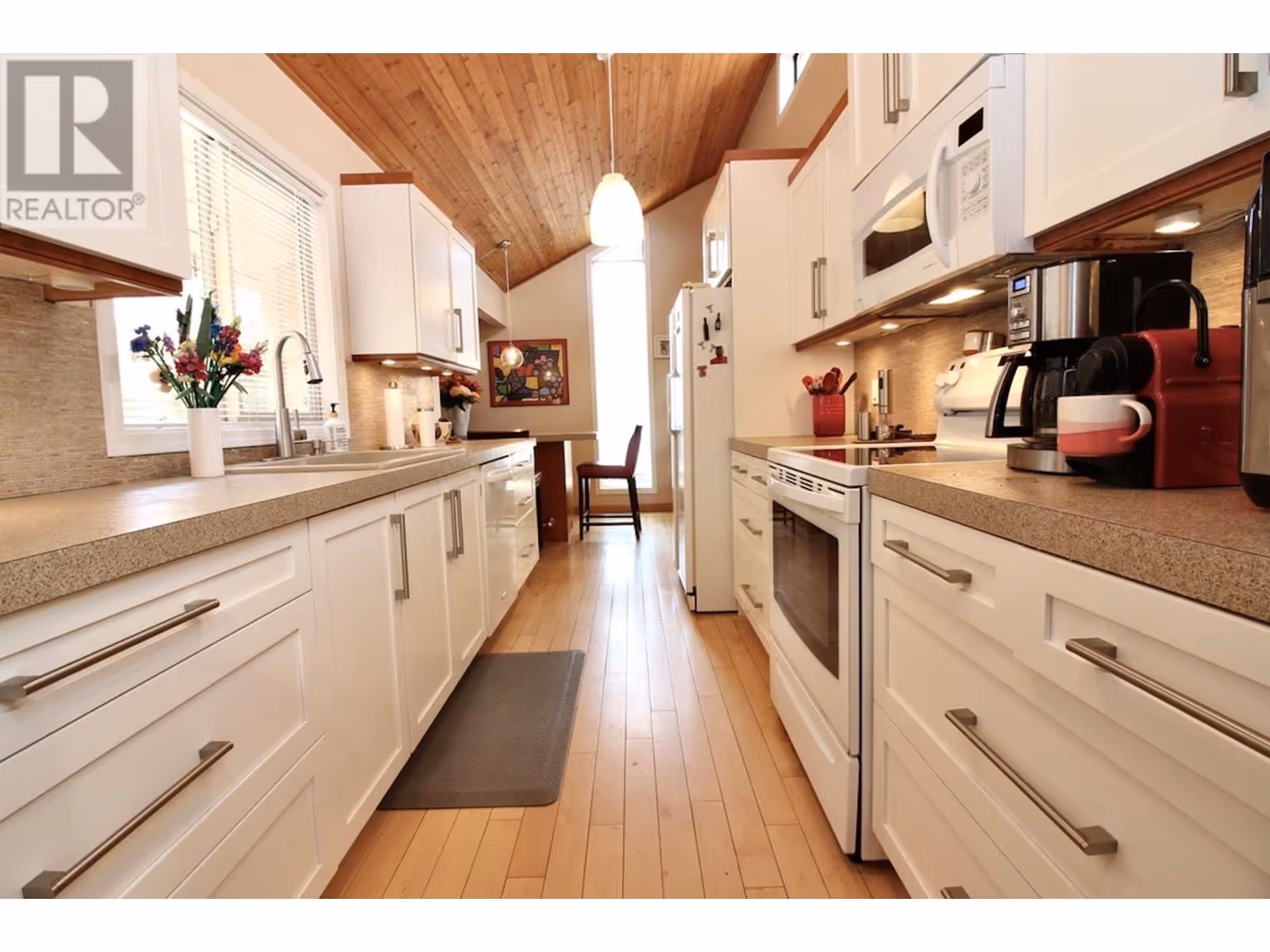 First Time on the Market in 47 Years with access to the water via Clifton Highlands! This spacious 4-bedroom, 3-bathroom detached home offers 2,581 sq ft of timeless design, thoughtful updates, & spectacular views of the lake and valley. The home is full of character & comfort. Inside, you'll find warm hardwood floors, vaulted cedar ceilings, & a renovated kitchen complete with an eating nook and built-in cabinet. A separate dining room opens through sliding glass doors to a sun deck—perfect for entertaining. The living room features a cozy fireplace (previously connected to propane) and a French door to a second deck where you can take in the stunning scenery. The primary suite is a true retreat with a walk-in closet & renovated ensuite featuring a soaker tub, double sinks with granite counters, & updated vanity. The main floor has a bedroom with full bathroom adjacent. Downstairs includes two additional bedrooms with a full bath & a spacious family room, ideal for guests, teens, or extended family. Additional features include C/A, B/I vacuum, 200 amp service, furnace (2019), hot water tank 2018. Recently connected to sewer so your touch is needed for yardwork & has a 50-year roof installed in 2008 for long-term peace of mind. The double garage provides ample storage and parking, while the quiet, established neighbourhood offers a perfect balance of privacy and convenience. This is a rare opportunity to own a home that has been lovingly cared for—ready for its next chapter. (id:58842)