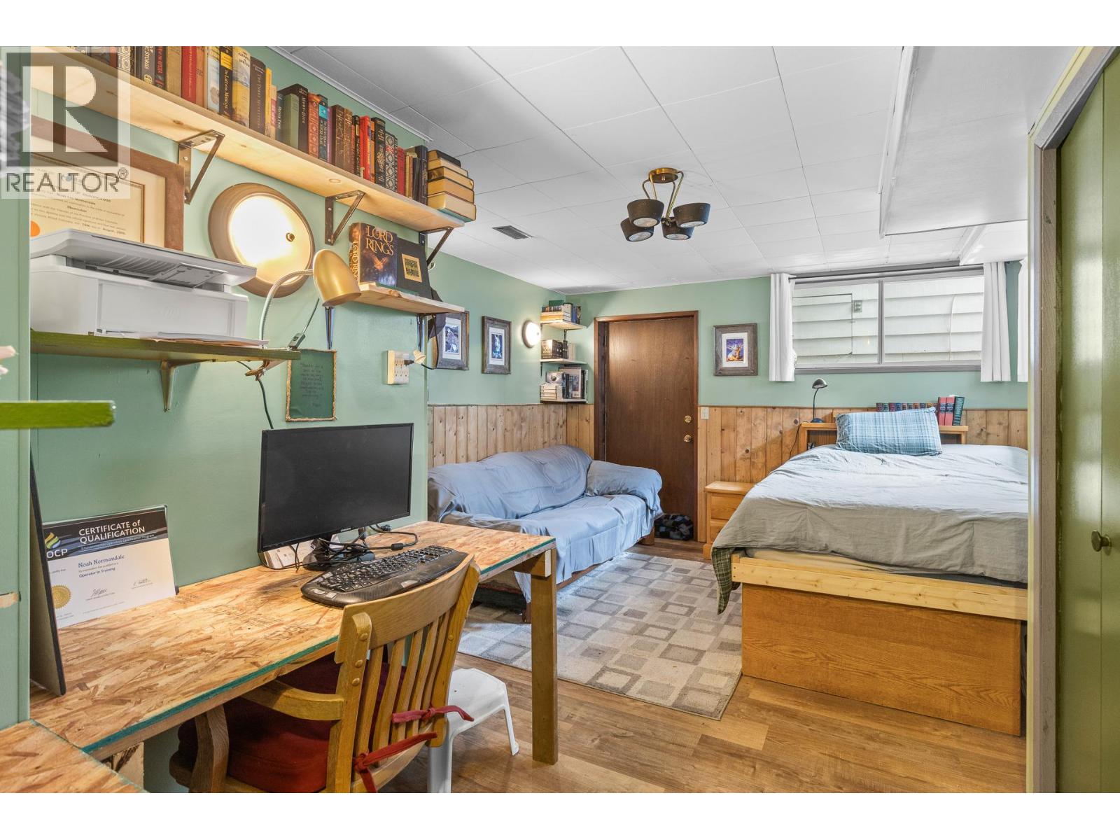 PRIVACY backing on to Powers Creek Canyon and a WORKSHOP lovers Dream property! Covered porch on front to visit neighbours or retreat to your totally private backyard patio with granite outdoor countertop for BBQ piped w/natural gas. Raised garden beds w/irrigation, low maintenance landscaping. Large patio w/room for a swing, lawn chairs and outdoor dining. 2 generations have loved this home. Desirable main level living with tons of storage, and partial basement with 3rd bedroom, office and unfinished utility room + canning room - bsmt with door to outside access. Decadent spacious Master bedroom with 3 piece ensuite and space for yoga! Hardwood floors, functional kitchen with dining area. Large 2nd bedroom, 4pc main bath with soaker tub and plenty of shelving. Cozy living room with wood burning fireplace, Adjacent Sunroom/home gym/Bonus-Games room. Copper plumbing, 8yr old H20 tank, 200 amp/220 volt service for workshop! 4-5 yr new Asphalt Shingle roof. Sewer levy paid off in Jan 2027. Macintosh & Golden Delicious apple trees, blueberries, clover. Gate to access walking path in Canyon. Amazing family friendly neighbourhood with parks, school & hiking trails nearby. (id:58842)