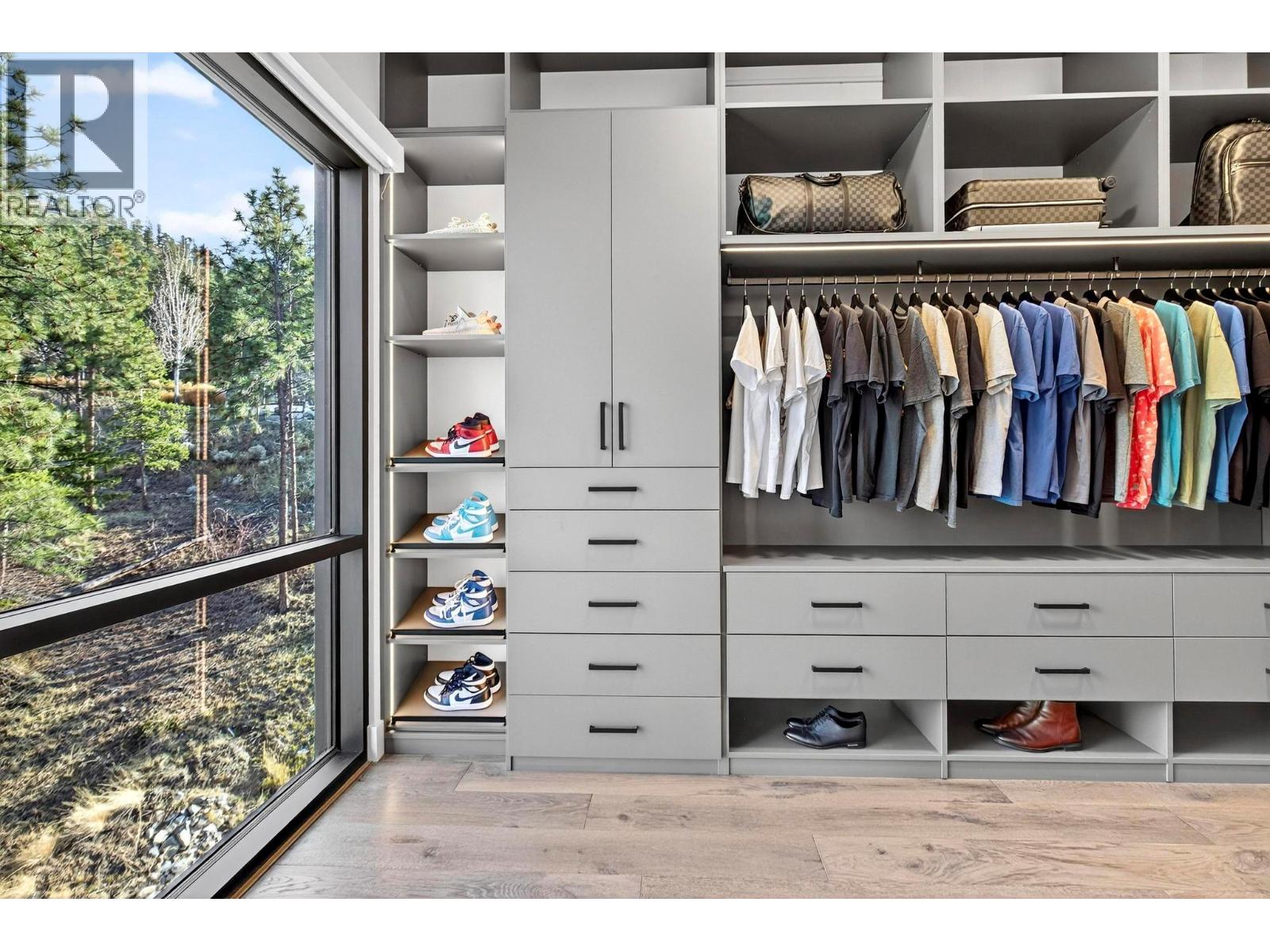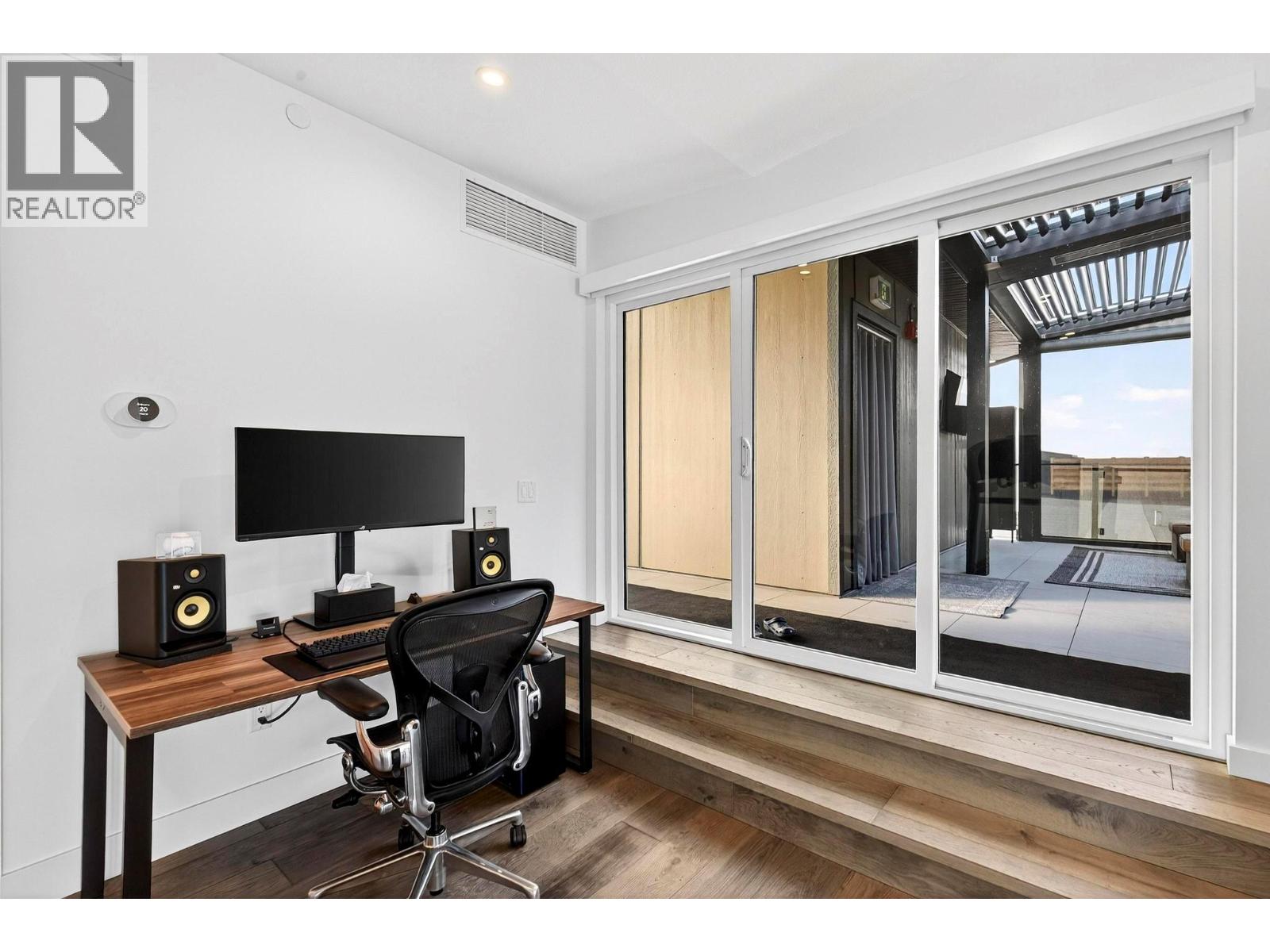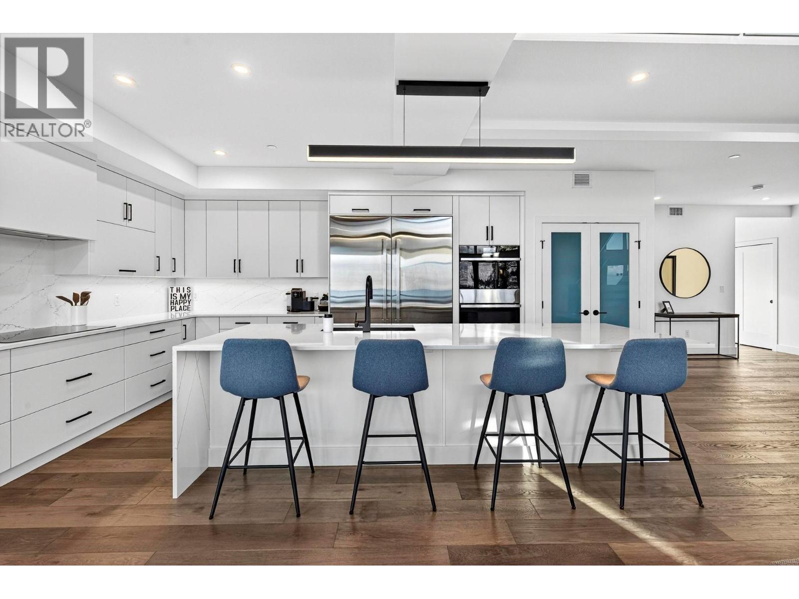 Experience luxury lakeside living in this brand-new modern penthouse in Granite III at McKinley Beach. Panoramic Okanagan Lake views set the tone the moment you walk in, framed by soaring vaulted ceilings and floor-to-ceiling windows that fill the open-concept space with natural light. The gourmet kitchen features an entertainment-sized island with wine fridge, high-gloss cabinetry, and professional-grade appliances. The great room flows onto a spacious lake-view terrace, perfect for outdoor dining, complete with built-in heaters for year-round comfort. This level also includes a generous bedroom with its own ensuite, all with heated tile floors. A dramatic two-storey tiled feature wall borders the floating glass staircase leading to the loft-style upper lounge, ideal as a reading nook, media room, or office. Voice-activated automatic blinds enhance comfort throughout. The primary suite is a private retreat, offering unobstructed lake views, a designer walk-in closet, and a stunning 5-piece marble ensuite with steam shower and heated tiles. The expansive rooftop terrace features an automated louvred roof with built-in fans, grilling area, hot-tub rough-in, and terrace heaters, creating an unmatched outdoor oasis. Steps from the sandy beach, marina, trails, parks, tennis courts, and outdoor gym, Granite residents also enjoy a sauna and outdoor pool. Three parking stalls sit conveniently next to the elevator. This penthouse delivers Okanagan luxury at its finest. (id:58842)