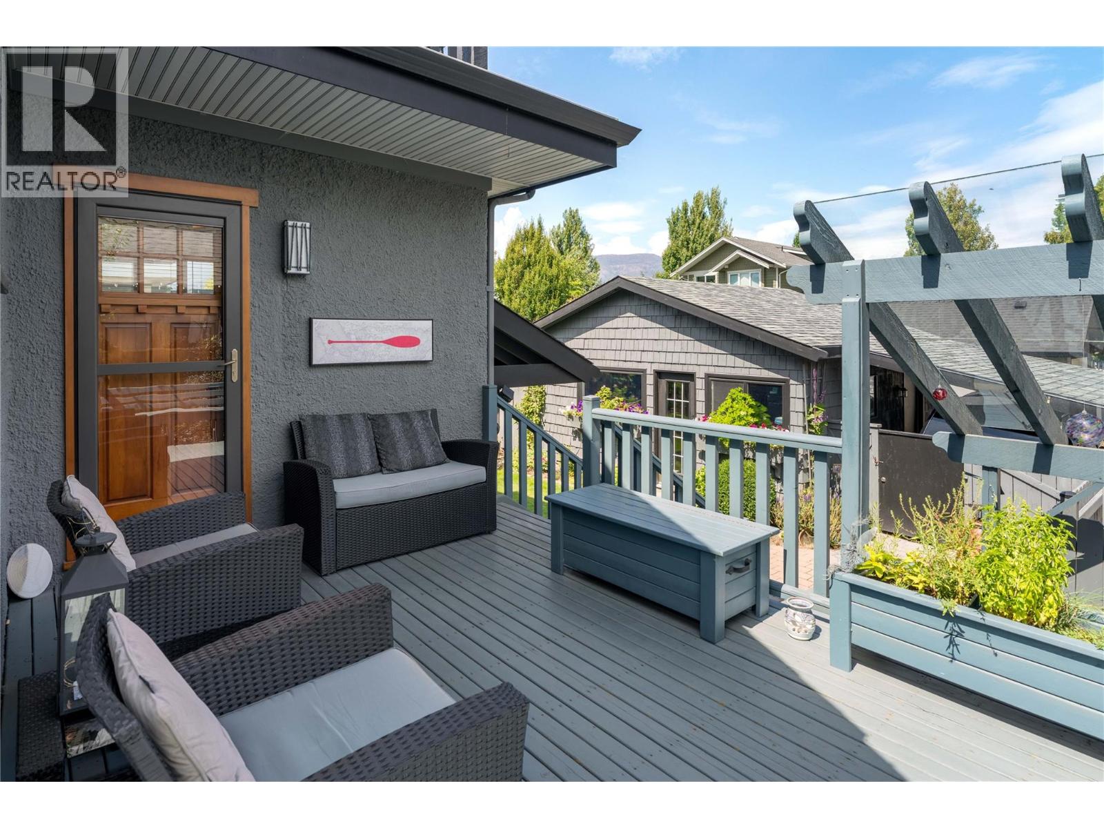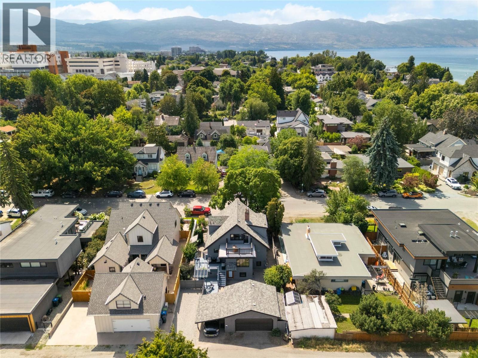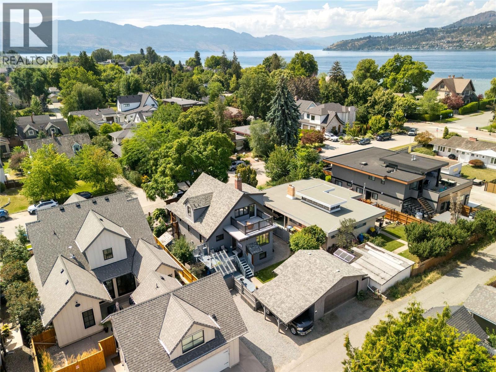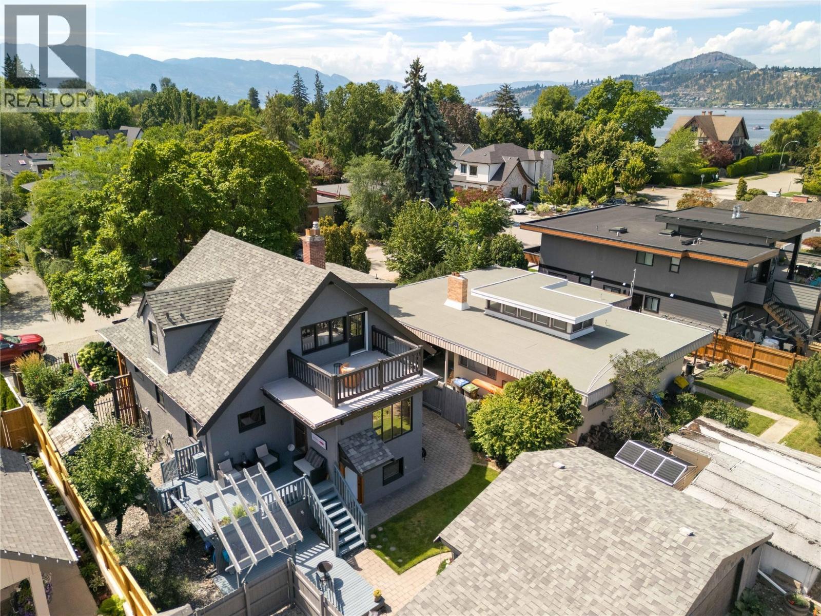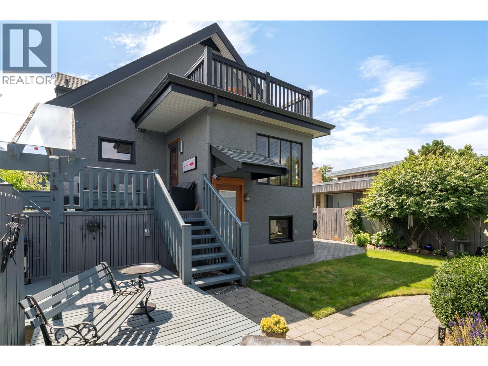 A rare offering just steps to the sand—where timeless design meets daily luxury in one of Kelowna’s most coveted neighbourhoods!! Privately nestled beneath a canopy of mature trees, this distinctive residence blends West Coast charm with elevated elegance. Thoughtfully & meticulously cared for, the home offers warmth, versatility & unmatched lifestyle just one block from the lake. Crafted for both beauty & function, the custom Glen Canyon kitchen is a true showpiece—featuring natural stone countertops, heated flooring, accent lighting, built-in display shelving, gas range & custom wood cabinetry. Refinished maple hardwood flows seamlessly through the main living spaces, framed by crown moulding, tray ceilings & rich wood accents. Large windows flood the home with natural light, creating a calm, airy feel throughout. Offering 4 bedrooms in total—including a main-level bedroom & two up—the home also includes a fully self-contained one-bedroom in-law suite with a private entrance. Outdoor living is at its finest with a covered front porch, sun-filled terrace & hot tub-ready private yard with wood burning stove—all surrounded by lush, low-maintenance landscaping. A detached double garage/studio with 220 power, alley access & zoning for a carriage home offers incredible long-term potential. Parking is abundant, with space for a boat or RV. This is a legacy property in a location that rarely becomes available—walk to the beach, schools, parks & Kelowna’s vibrant downtown core. (id:58842)