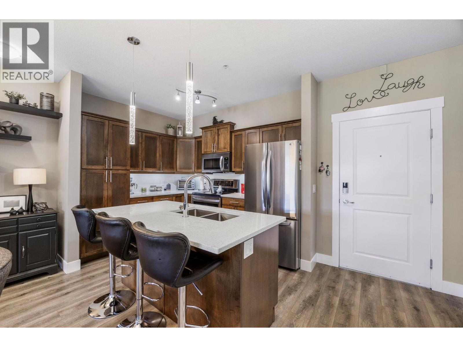Welcome to this beautifully maintained, 1,055 square feet, two bedroom, two bathroom ground-floor condo in the sought-after Aria complex, next to Two Eagles Golf Course and only minutes from some of Okanagan Valleys best wineries, beaches, and restaurants. This thoughtfully designed unit offers many upgrades, and a very functional floor plan, with bedrooms located on opposite sides of the spacious open-concept living area for added privacy. The stylish gourmet kitchen is complete with granite countertops, a large island, stainless steel appliances, maple cabinetry, and under-cabinet lighting—perfect for both everyday cooking and entertaining. The kitchen opens to a bright and spacious living room and dining area, that flows out to an expansive stamped concrete patio where you’ll enjoy relaxing views of the golf course, creating a serene outdoor retreat. The primary suite features double closets and ensuite with a soaker tub, and a separate shower. The second bedroom also includes double closets and a convenient walk through ensuite. Additional features include a spacious in-suite storage room with a stacking washer and dryer, a separate storage locker, and secure underground parking. The unit has both a lobby access and a private entrance, making it easily accessible. Public transit is conveniently located right outside the complex. LEASE HAS BEEN PAID OUT! No Property Transfer Tax! No Speculation tax. Please contact us today for your private viewing. (id:58842)