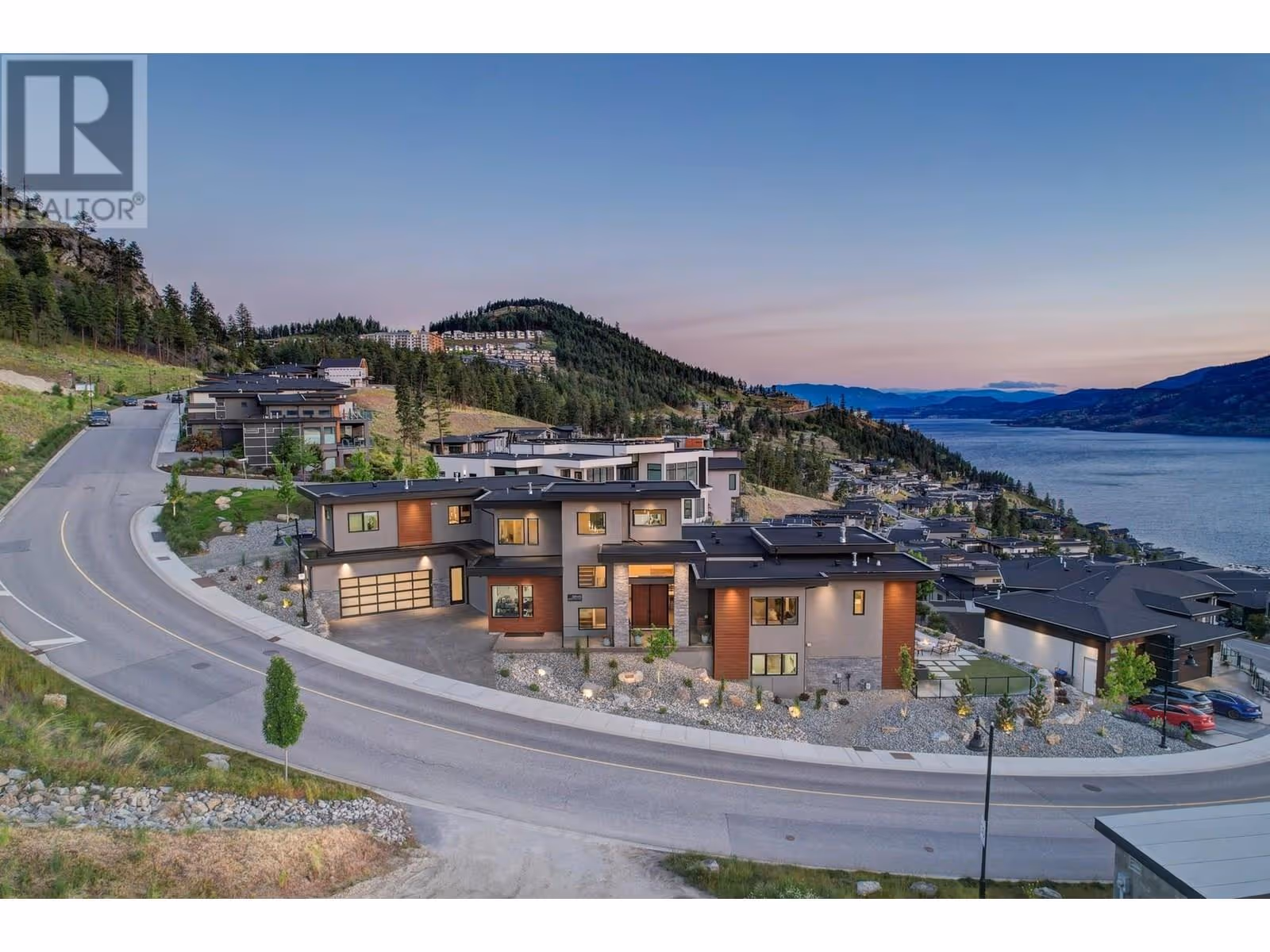 Gorgeous modern home in McKinley Beach where elevated Okanagan living meets thoughtful design & panoramic lake views. Situated on a rare 0.374-acre lot, this estate boasts a spacious family layout with resort-style amenities, expansive indoor-outdoor living, & a self-contained 2 bed/1 bath legal suite. The main level impresses with soaring ceilings, a chef’s kitchen featuring JennAir appliances, a massive island, & a seamless connection to the covered deck—perfect for al fresco dining. The luxurious primary suite enjoys sweeping lake &valley views, a spa-inspired ensuite, & a walk-through dressing room. A bright office, large pantry, powder room, & laundry complete this level. Downstairs, entertain in style with a rec room, wet bar with pass-through windows, wine cellar, & direct walkout access to the backyard oasis, featuring a heated saltwater pool, hot tub, & built-in firepit. Three additional beds & two baths offer flexibility. Upstairs, a versatile loft space is ideal for a home office or gym. The legal suite offers privacy & comfort with a separate deck, laundry, & private entrance. A highlight of this home is the 1300+ sq ft garage with cabinets, separate heat, & hard wired for network. Located minutes from the marina, airport, UBCO, wineries, & golf. Residents enjoy exclusive access to McKinley’s amenity centre with gym, pool, hot tub, pickleball, & more. This is a rare opportunity to own one of the most versatile & beautifully appointed homes in McKinley Beach. (id:58842)