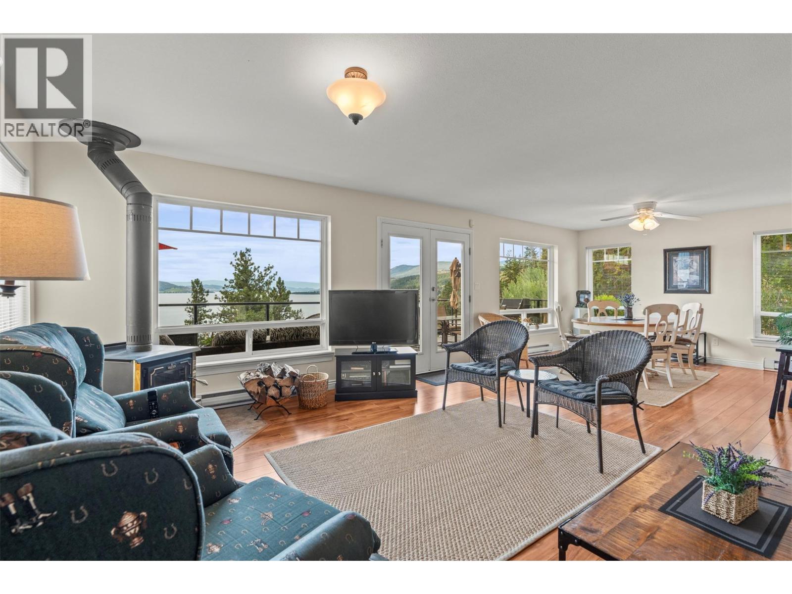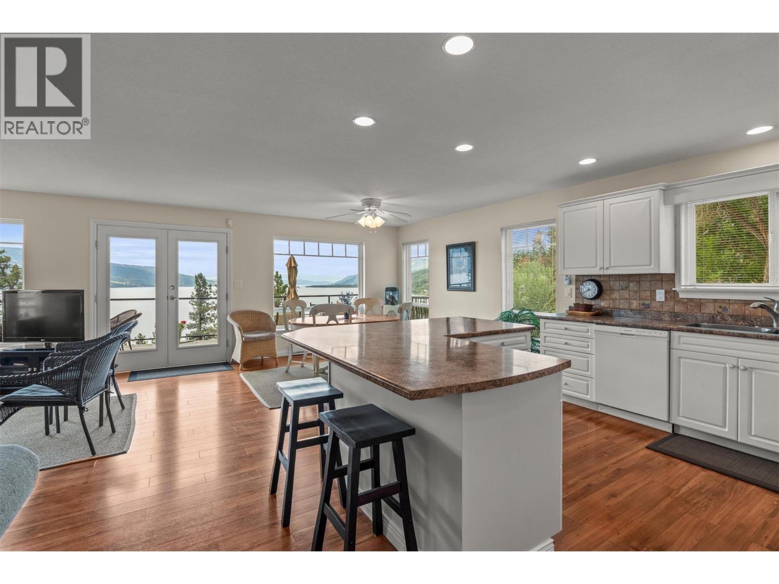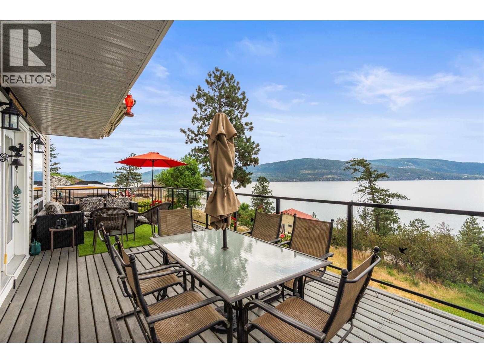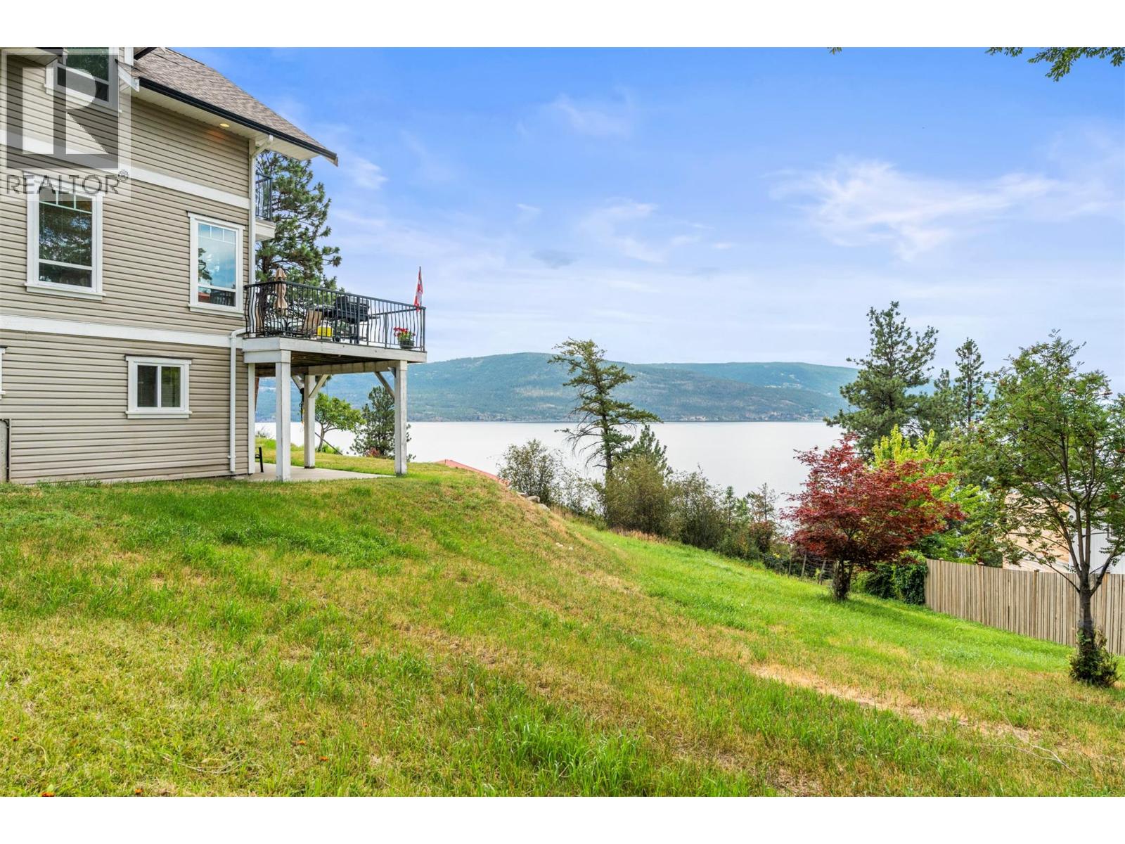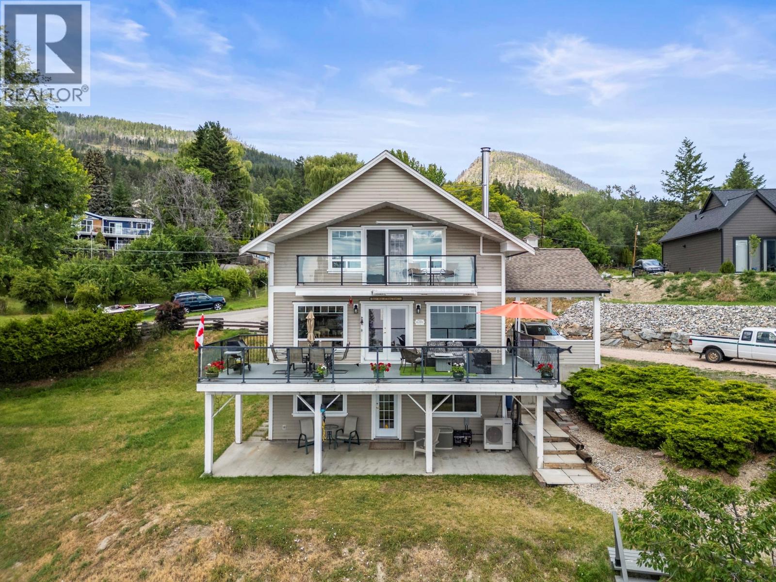Welcome to your dream lakeview retreat! This well-maintained family home is perfectly perched to capture breathtaking expansive views of the lake from all three levels, with large south-facing windows and multiple decks to soak in the scenery. Whether you're sipping coffee on the upper balcony or enjoying a sunset by the fire pit, the views are truly unmatched. Inside, the layout is both functional and flexible. The main floor features an open-concept kitchen and dining area, seamlessly flowing into a cozy living room with a wood fireplace and walkout to a spacious deck. A full 3-piece bathroom and bedroom complete the main level. Upstairs, the oversized primary suite offers a true retreat with a sitting area, skylit 4-piece ensuite with soaker tub, and private balcony. A second bedroom with 2-piece ensuite is located across the hall. The fully finished walk-out lower level includes two additional bedrooms, a full bath, kitchen and laundry—ideal for an in-law suite or mortgage helper.Outside, enjoy ample parking including RV/boat space, a carport, mature fruit trees, a shed for garden tools, and a welcoming neighbourhood vibe. You’re just 5 minutes to the public beach and boat launch and only 10 minutes to Fintry Park. This is lake life at its best, flexible, scenic, and full of possibility. (id:58842)