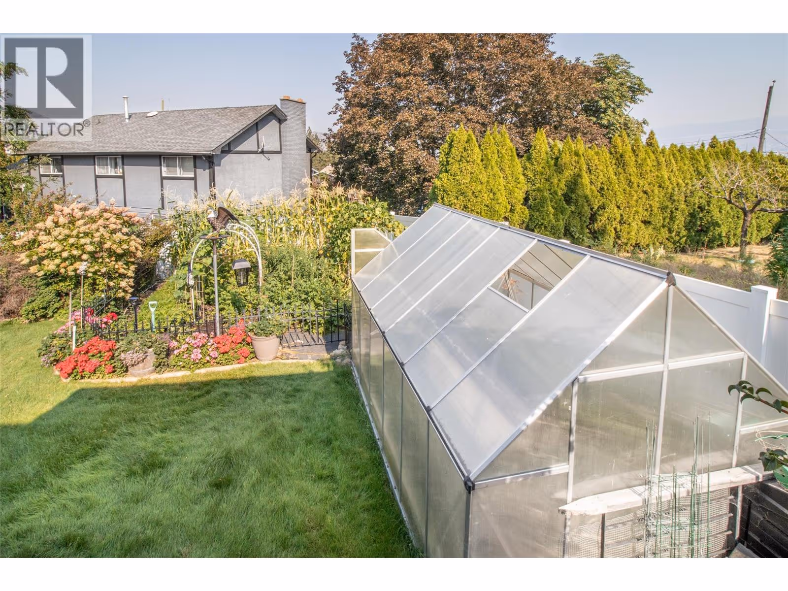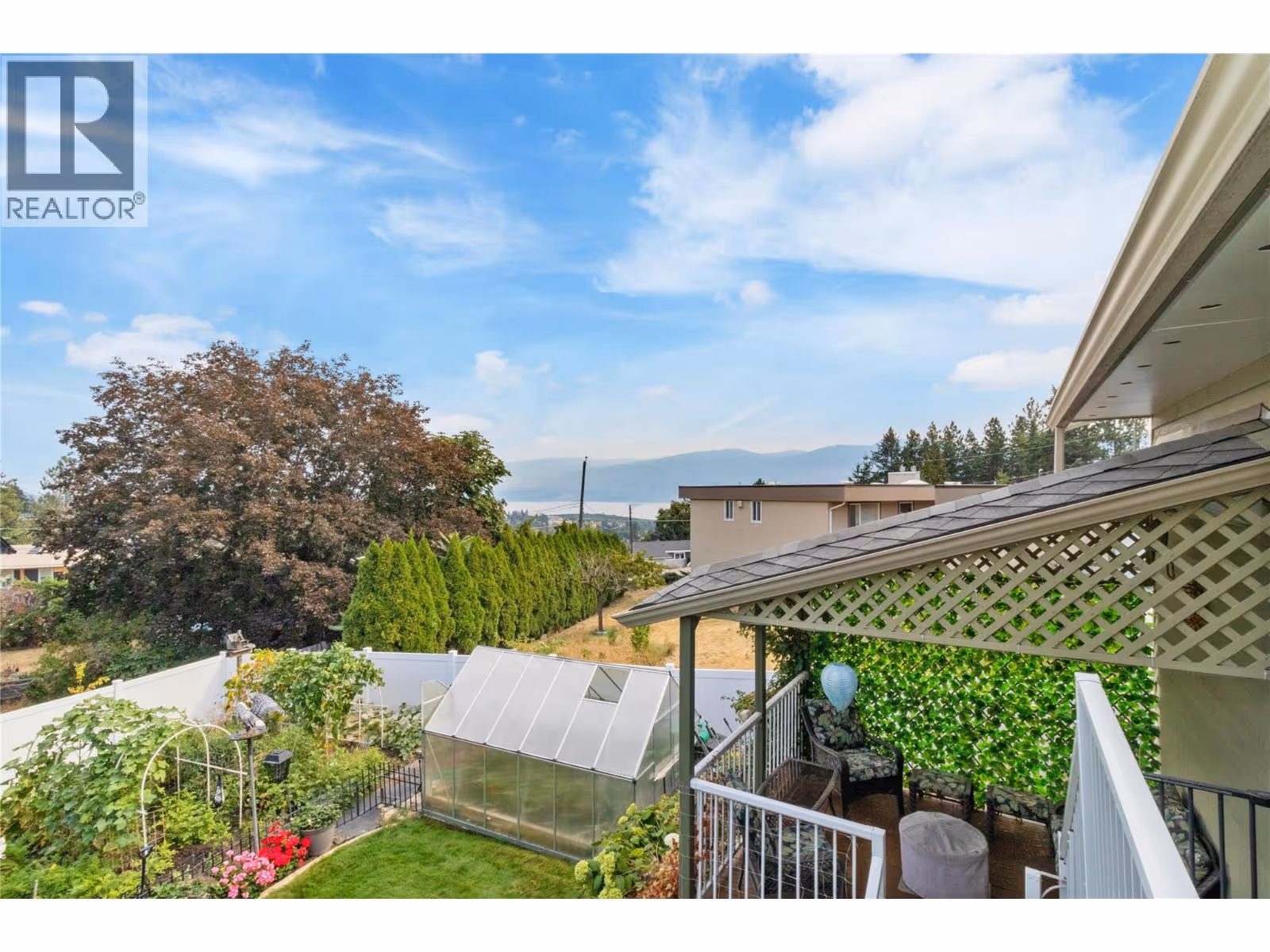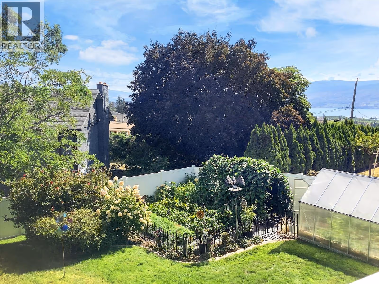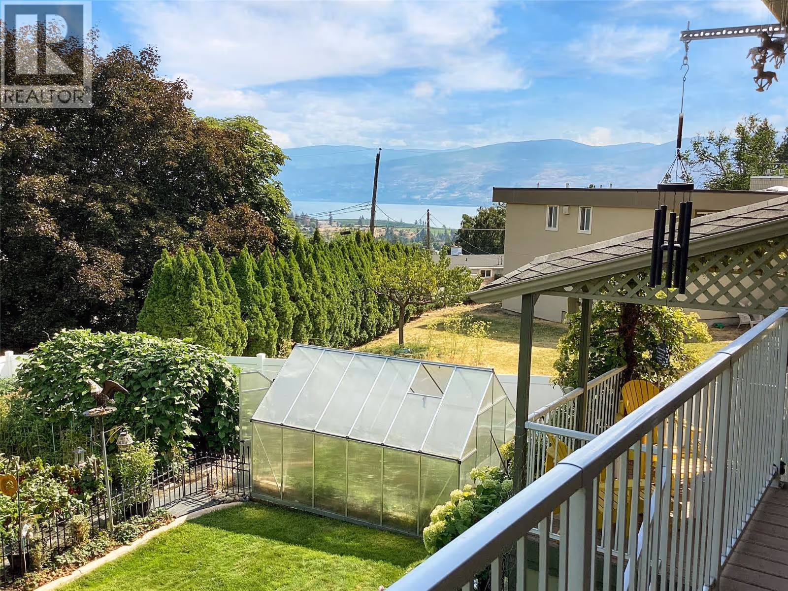Enjoy the lake views from this immaculately maintained walk-out rancher. 3 bedrooms plus den, 2.5 baths. Skylights in kitchen and main floor bathroom. High ceilings in living room with gas fireplace. Bedroom currently being used as an office/studio, contains built-in murphy bed. Large bright kitchen with quarts countertops. Main floor laundry. Large rec room with freestanding gas fireplace. Large storage room on basement level together with 8' x 6' vented cool room with plenty of shelving for all your food and wine storage needs. Large garden area with 8' x 12' greenhouse. Single car garage with work bench and separate tool room. RV parking and plenty of off street parking. U/G irrigation, Central A/C and vacuum, newer furnace and hot water tank. Water softener and water purifier in kitchen. New roof in 2022. Enjoy your morning coffee on the front veranda and your after dinner drink on the large entertainment deck off the dining room or around the firepit on the lower deck. Lower deck is wired and was originally built to contain a hot tub. Close to schools, shopping, and wineries. (id:58842)
