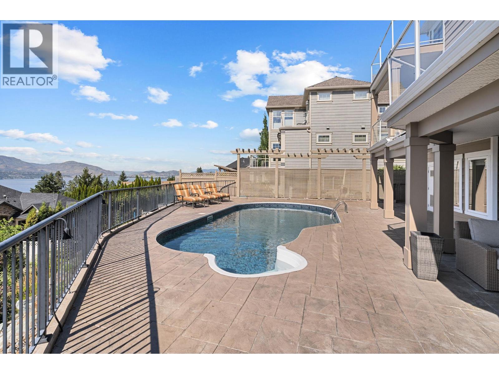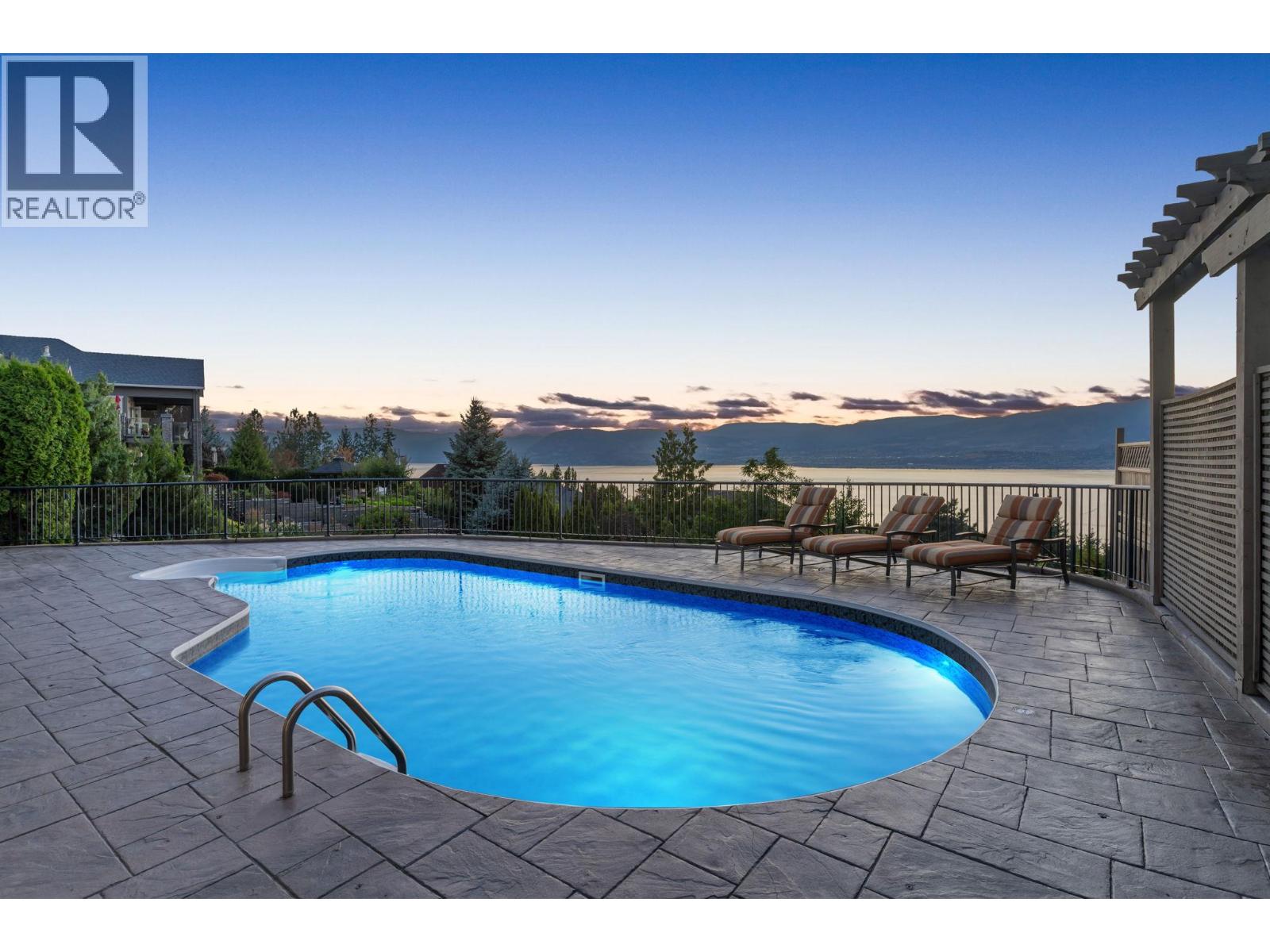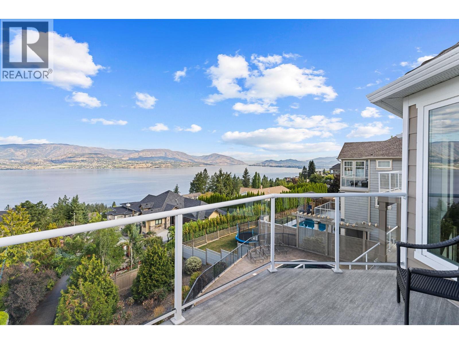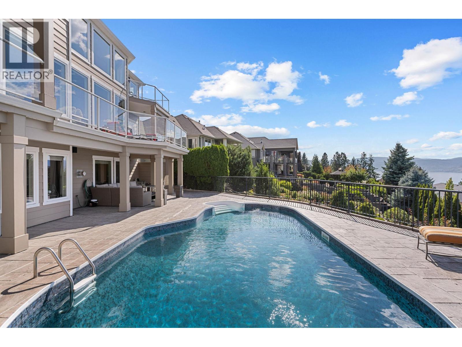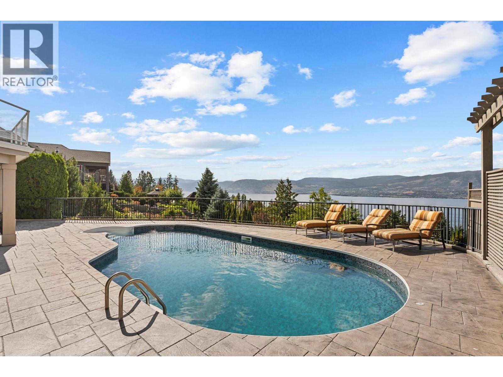 Welcome to this stunning, freshly painted, 5 bed, 4.5 bath home located on the ""Ledge"", distinguished homes on Quilchena Drive facing the Lake. Located in the heart of Kettle Valley. No hills, no worries, luxury, light, and lifestyle come together. Designed to impress, this residence features expansive open-concept living with panoramic lake views from every floor. Massive 20 foot ceilings flood the home with natural light, framing the Okanagan at its finest. There are three full bedrooms upstairs highlighted by a 625 square foot master suite. The chef-style kitchen flows seamlessly into the main living and dining areas perfect for entertaining or quiet evenings at home. Step outside to your private backyard oasis complete with a beautiful pool, sun-soaked patio, and views that truly make this the best lot on the street. The walk-out basement offers flexible space, including a dedicated gym room, media area, and guest suite potential. Every detail in this home is thoughtfully designed for upscale family living. All this on a flat street just steps from Kettle Valley Park, and 5 minute walking distance to grocery stores, schools, and amenities. Homes with this combination of design, location, and view rarely come to market. (id:58842)