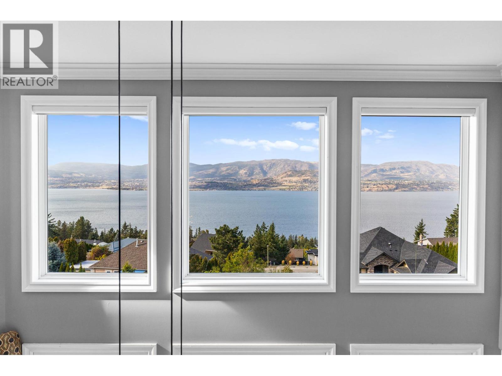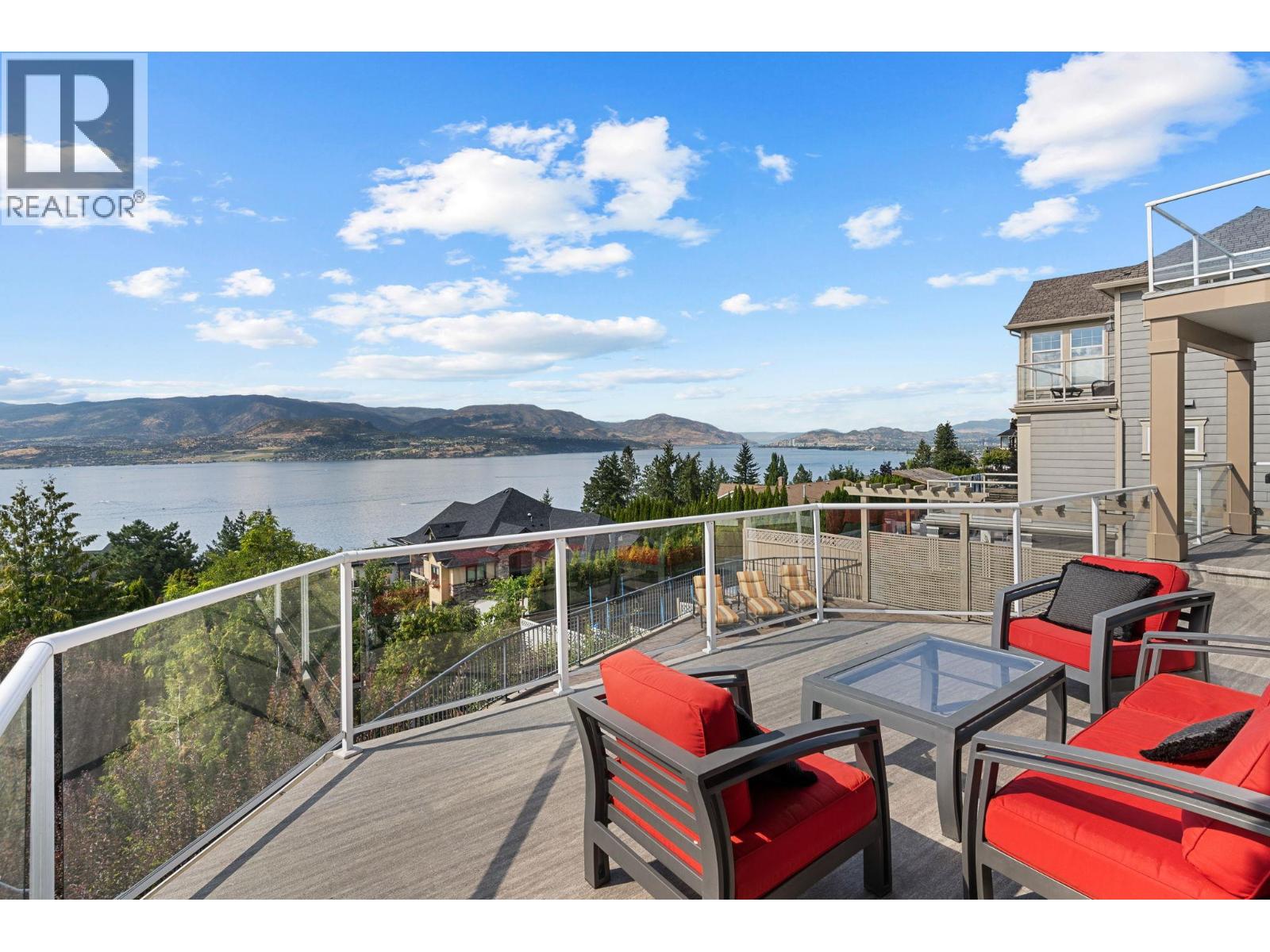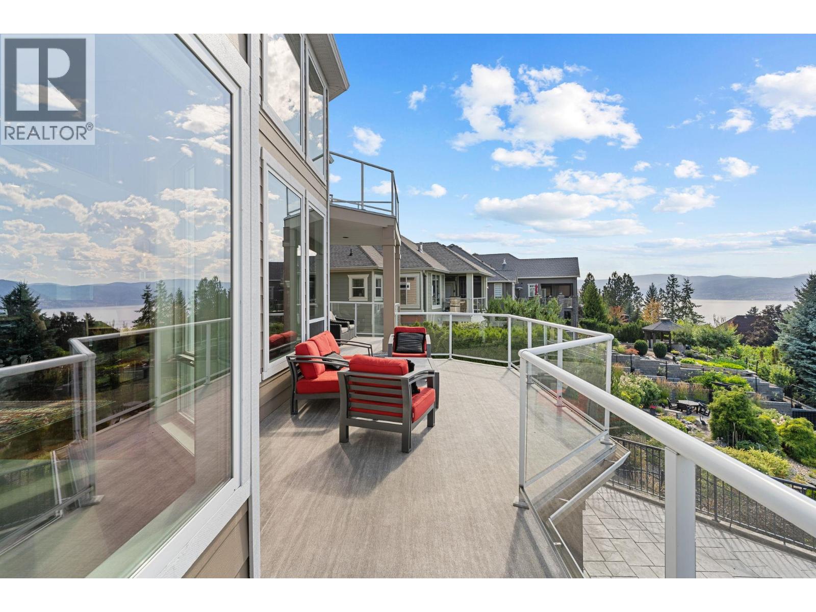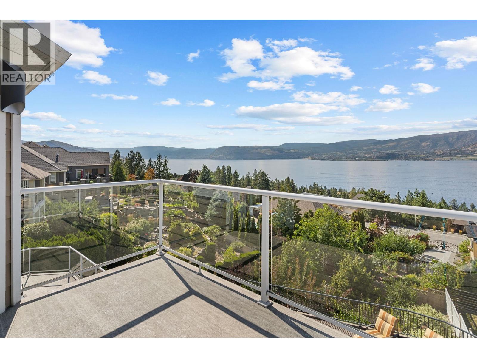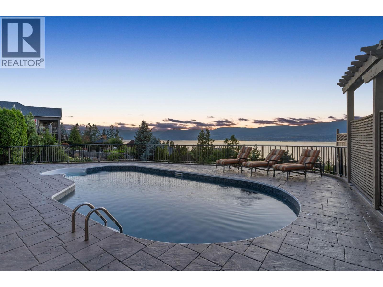 Welcome to this stunning, freshly painted, 5 bed, 4.5 bath home located on the ""Ledge"", distinguished homes on Quilchena Drive facing the Lake. Located in the heart of Kettle Valley. No hills, no worries, luxury, light, and lifestyle come together. Designed to impress, this residence features expansive open-concept living with panoramic lake views from every floor. Massive 20 foot ceilings flood the home with natural light, framing the Okanagan at its finest. There are three full bedrooms upstairs highlighted by a 625 square foot master suite. The chef-style kitchen flows seamlessly into the main living and dining areas perfect for entertaining or quiet evenings at home. Step outside to your private backyard oasis complete with a beautiful pool, sun-soaked patio, and views that truly make this the best lot on the street. The walk-out basement offers flexible space, including a dedicated gym room, media area, and guest suite potential. Every detail in this home is thoughtfully designed for upscale family living. All this on a flat street just steps from Kettle Valley Park, and 5 minute walking distance to grocery stores, schools, and amenities. Homes with this combination of design, location, and view rarely come to market. (id:58842)