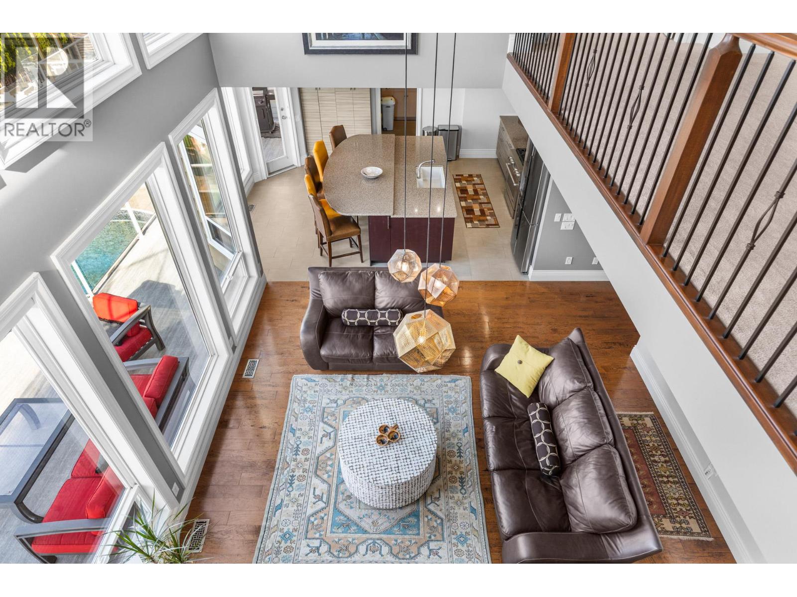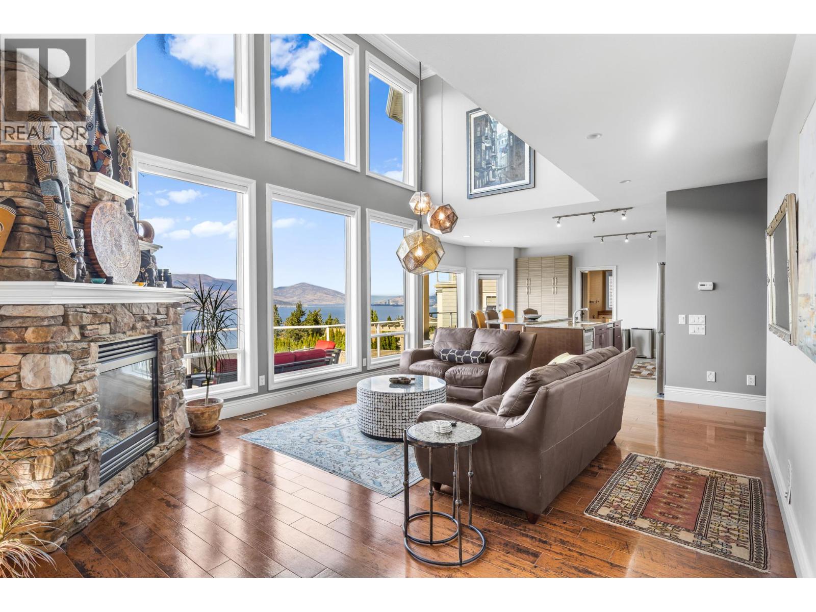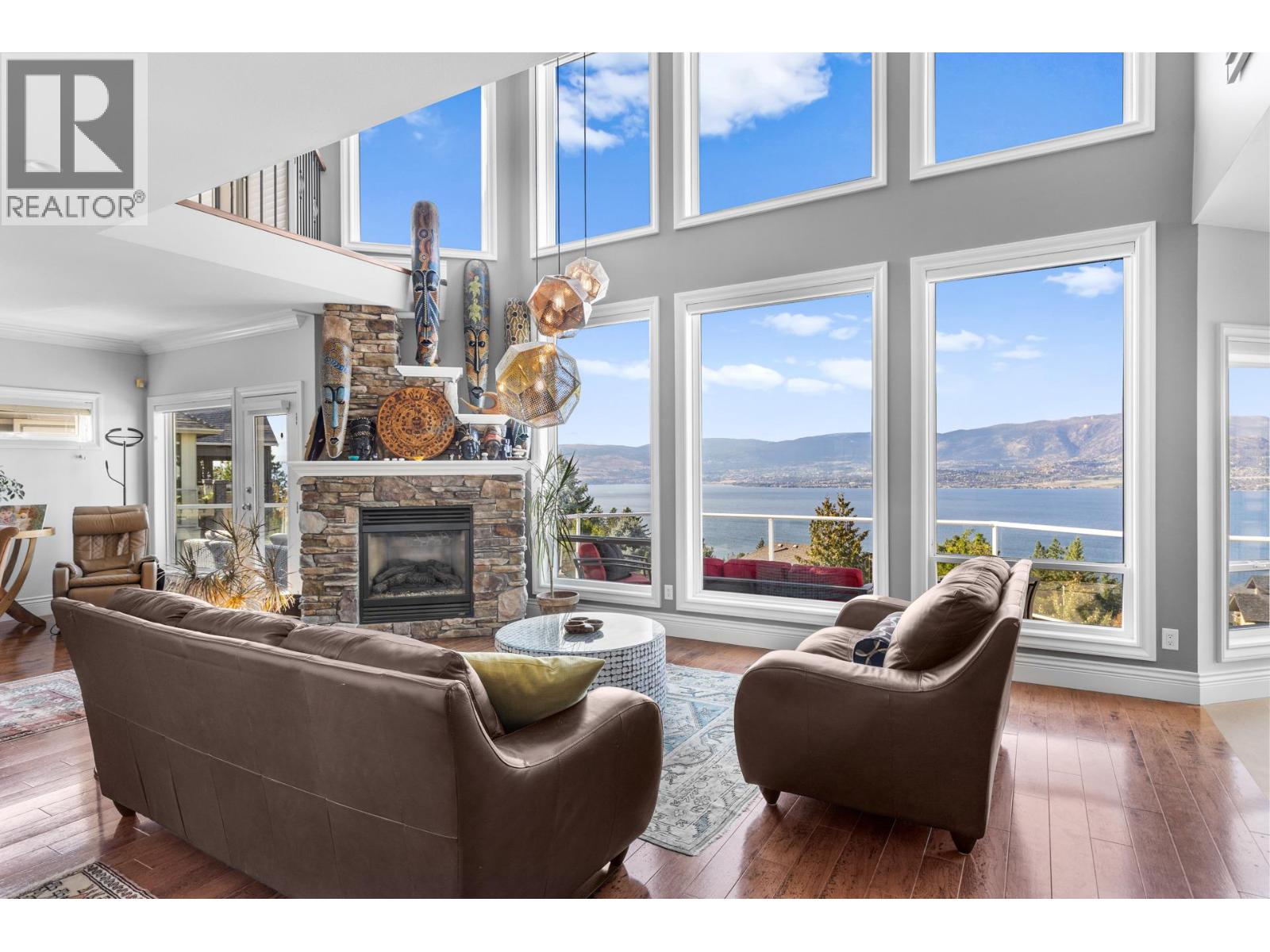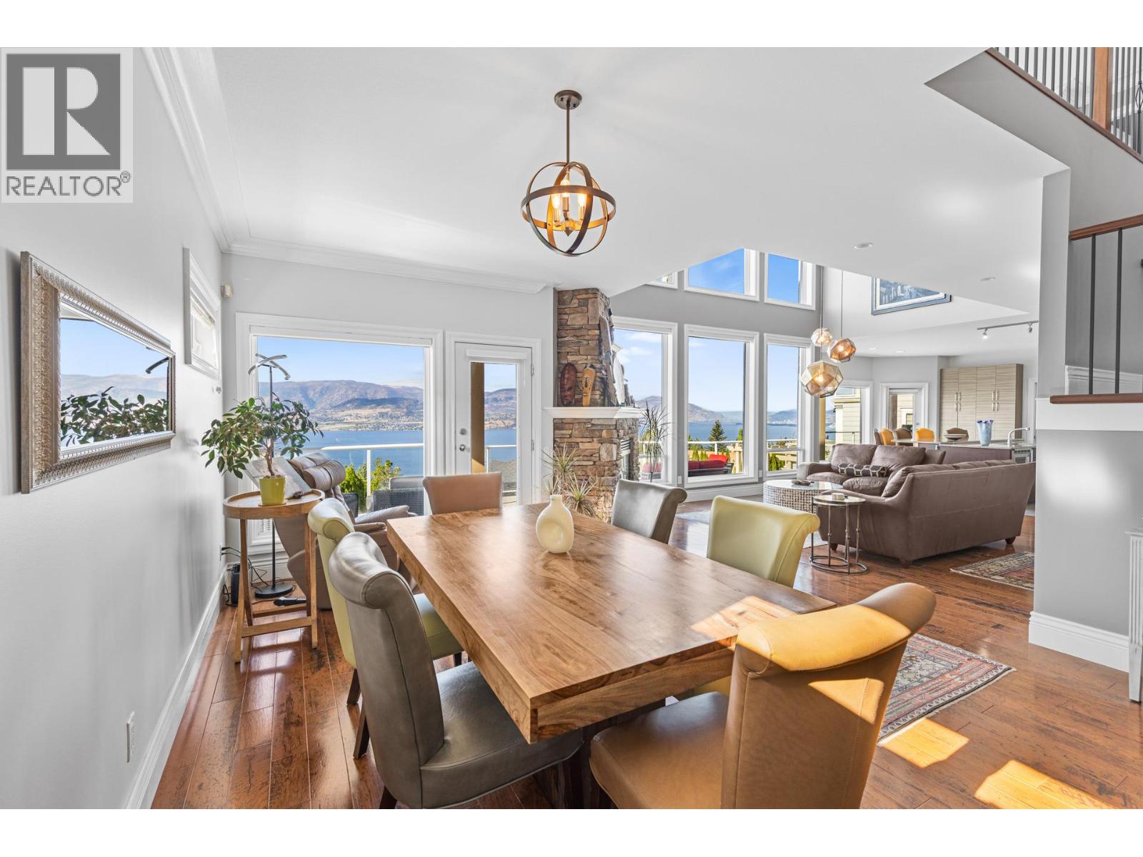 Welcome to this stunning, freshly painted, 5 bed, 4.5 bath home located on the ""Ledge"", distinguished homes on Quilchena Drive facing the Lake. Located in the heart of Kettle Valley. No hills, no worries, luxury, light, and lifestyle come together. Designed to impress, this residence features expansive open-concept living with panoramic lake views from every floor. Massive 20 foot ceilings flood the home with natural light, framing the Okanagan at its finest. There are three full bedrooms upstairs highlighted by a 625 square foot master suite. The chef-style kitchen flows seamlessly into the main living and dining areas perfect for entertaining or quiet evenings at home. Step outside to your private backyard oasis complete with a beautiful pool, sun-soaked patio, and views that truly make this the best lot on the street. The walk-out basement offers flexible space, including a dedicated gym room, media area, and guest suite potential. Every detail in this home is thoughtfully designed for upscale family living. All this on a flat street just steps from Kettle Valley Park, and 5 minute walking distance to grocery stores, schools, and amenities. Homes with this combination of design, location, and view rarely come to market. (id:58842)