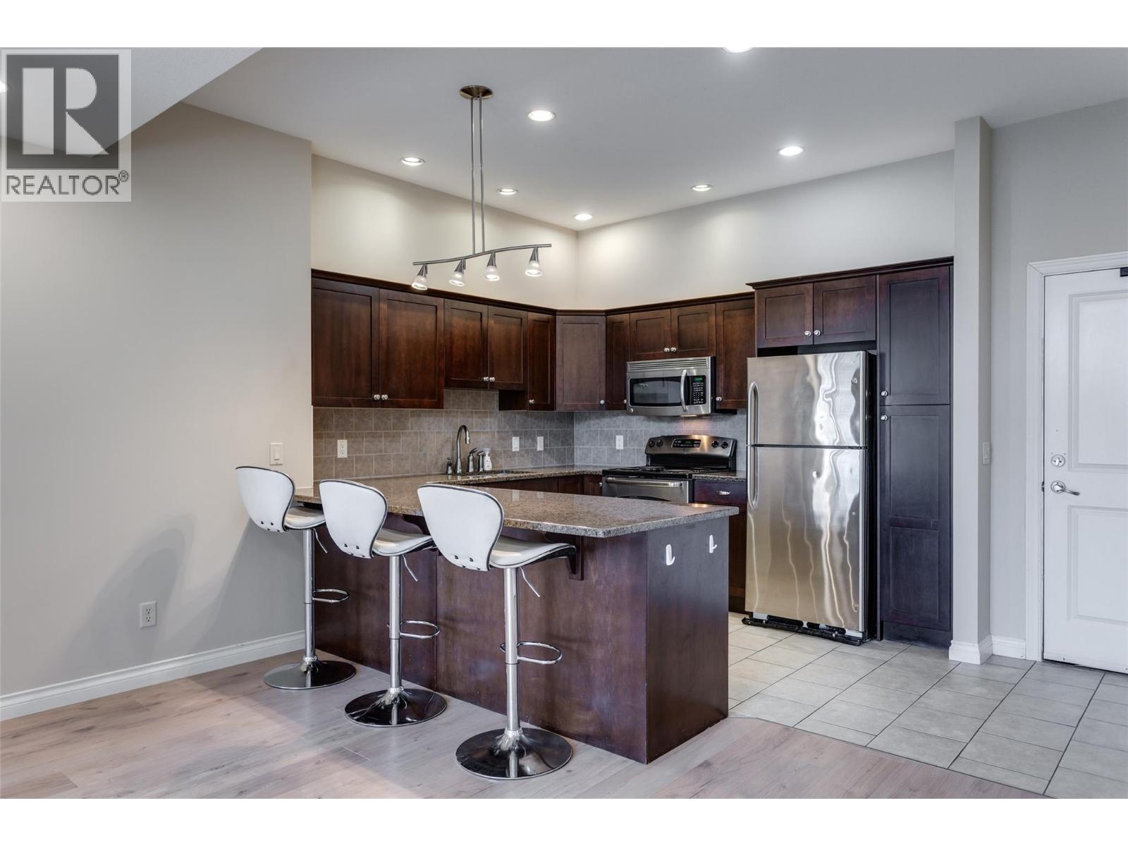 Wonderul Value. Welcome to this immaculate top-floor unit in the sought-after Mira Vista community. Featuring soaring 11-ft ceilings, brand new flooring, and fresh paint throughout, this west-facing 2 bed, 2 bath condo is full of natural light and style. The spacious primary bedroom boasts a walk-through closet leading to a well-appointed ensuite. The second bedroom is generously sized, perfect for guests or family. Use the den as a home office or additional storage.The kitchen is equipped with granite countertops, an eat-up island, and flows effortlessly into the open-concept living and dining area—ideal for entertaining. Step outside to your private deck to enjoy BBQs and evening sun. Bonus Features: Hot Water, Heating & cooling included in the strata fee. Secure underground parking & storage locker. Outdoor pool, hot tub, amenities building, guest suite, workshop, and rec room. Pet-friendly (1 dog or cat up to 18""). No age restrictions. Month-to-month rentals allowed. Quick possession is available. Mira Vista is just steps from Save-On-Foods, coffee shops, trails, and only a short drive to local wineries, golf courses, and the lake. This vacant home is truly turnkey—ready for you to move in and start enjoying the Okanagan lifestyle! Measurements taken from iGuide. (id:58842)