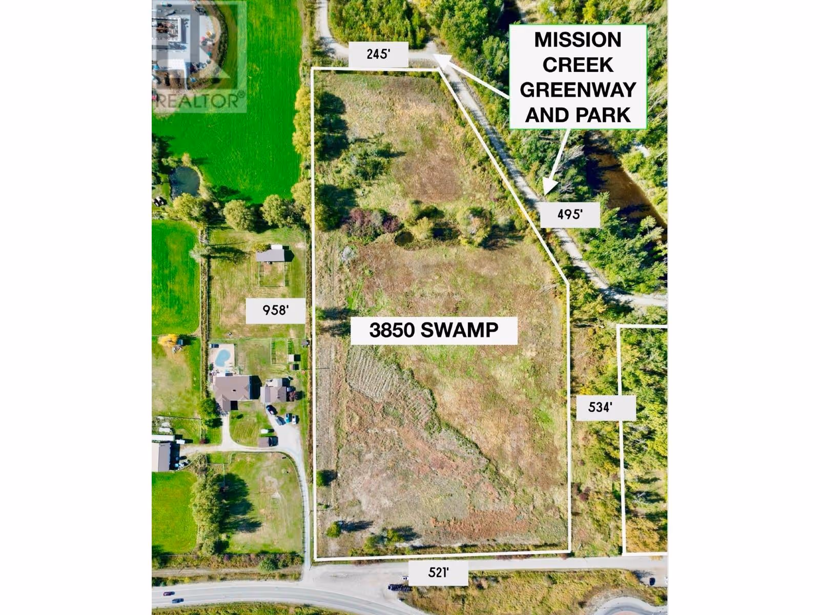 Rare Opportunity...10 ACRES of ALR Backing and Siding onto the Mission Creek Greenway, City Parkland and private land! Build your dream home and enjoy rural beauty and privacy yet only minutes drive to all amenties. Great potential for Equestrian use, and potential trail rides on the greenway. Historically back property was hay. Centrally located, minutes to H2O centre, recreation trails, golf, schools. Approx one third has approx 1 metre of fill (soil test on file). Two thirds more swamp grass and pasture some trees and pond. Water ditched around perimeter and through middle (Site plan on file), 6-8' wire fenced on N/W/E sides, partial cross on South. Property drains into the City of Kelowna ponds, small pond in middle near back. Easy access off Swamp Rd. Subject to ALR zoning, A1, flood zone requirements and guidelines. GST applicable. (id:58842)