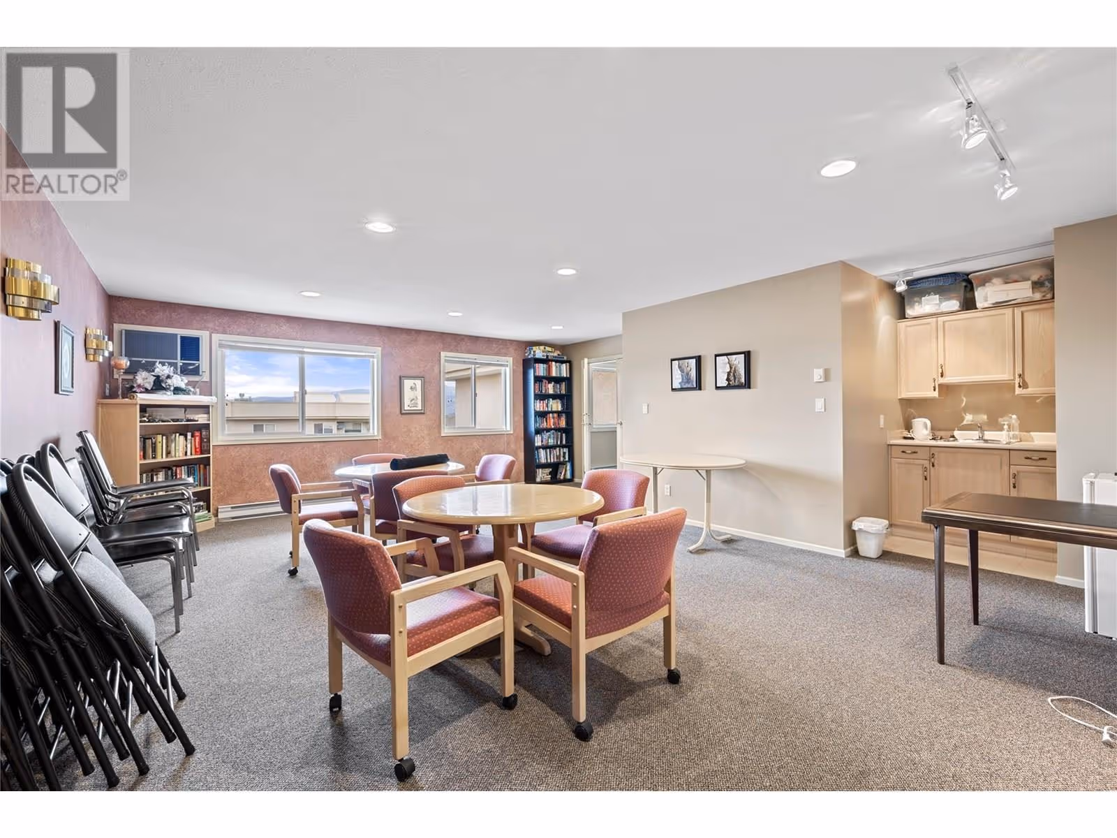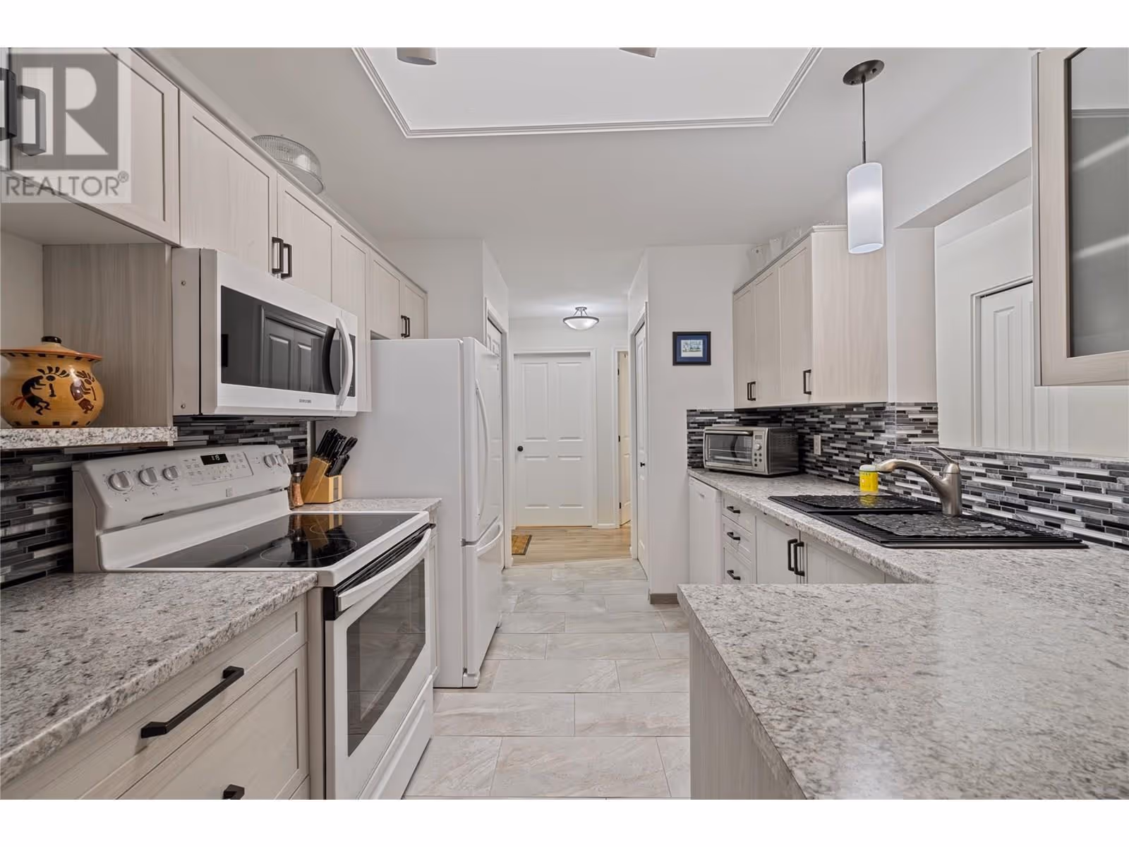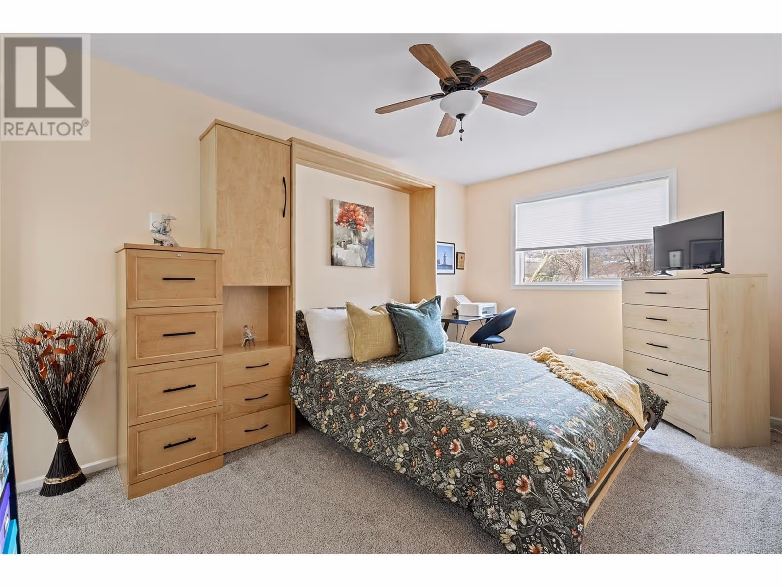 TOP FLOOR! Quiet / fully updated - charming 1030 sq ft 2 bed / 2 bath condo! Private unit, top of the build with private, open balcony. Move in ready - well appointed kitchen, timeless cabinets, counters and flooring. Lots of kitchen storage with the added bonus of super sized pantry! The kitchen opens to the dining room (ceiling fan) a light filled, spacious living room and newer A/C unit. Glass French doors offer a 2nd entrance to the guest bed - charming and optional as office! Quiet paint colours, laminate flooring and open floor plan excel. The primary bedroom has a charming bay window and is large enough for a king bed - custom blind package throughout. Both beds come with ceiling fans. The 2019 reno includes two new, full baths (tub / shower & custom shower enclosure) as well. A perfect 55+ lock and leave lifestyle, friendly neighbours and conveniently located to W Kelowna shopping and amenities. Please have your preferred realtor arrange your private showing. (id:58842)