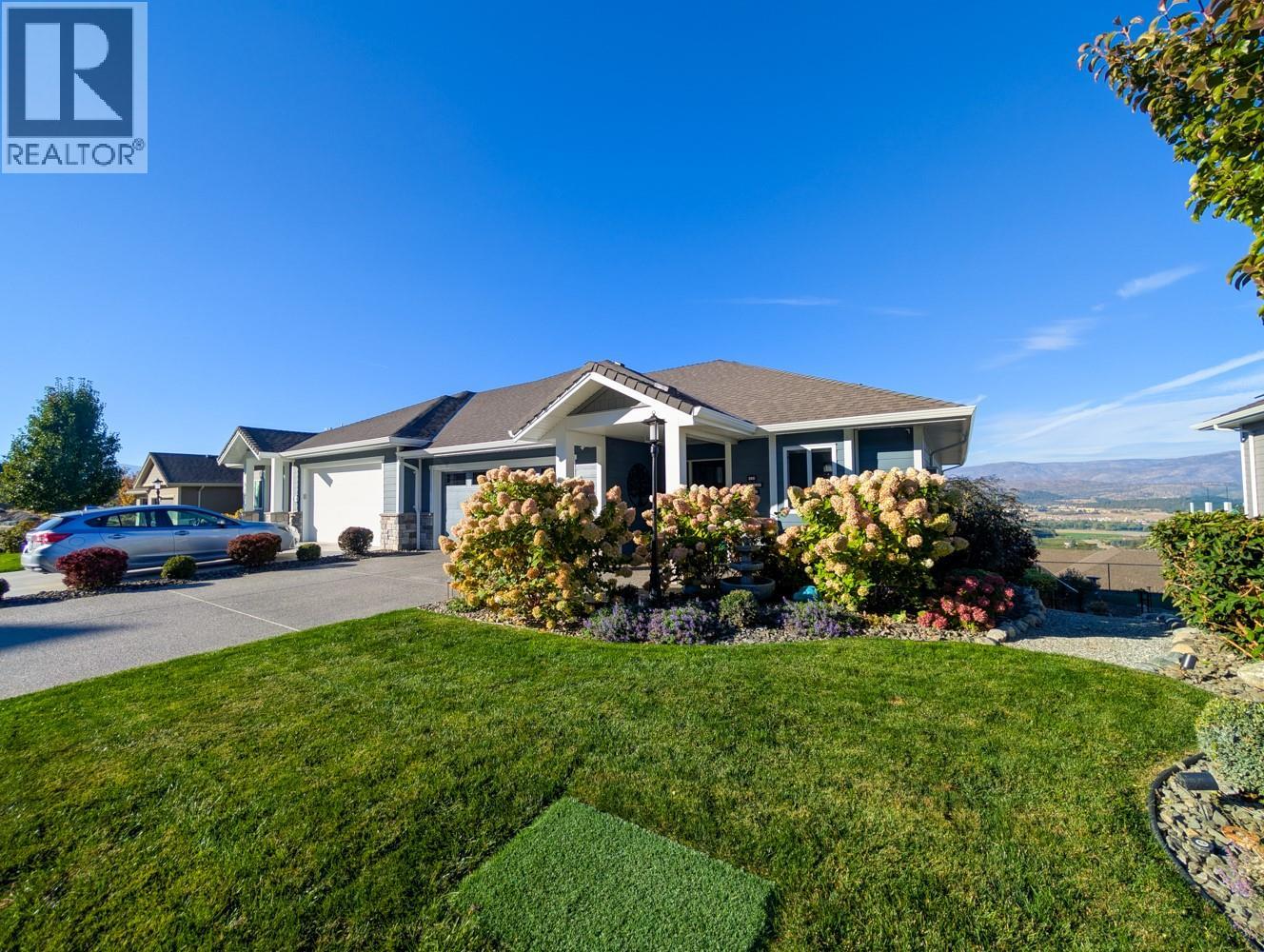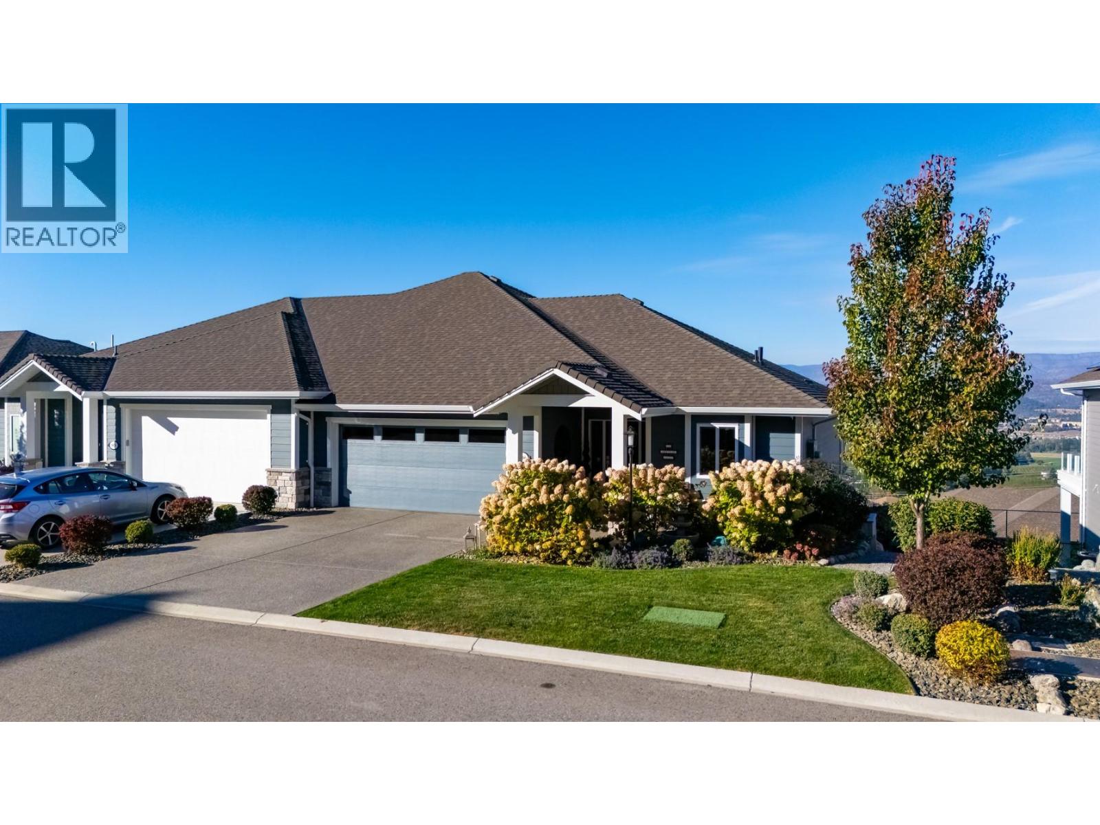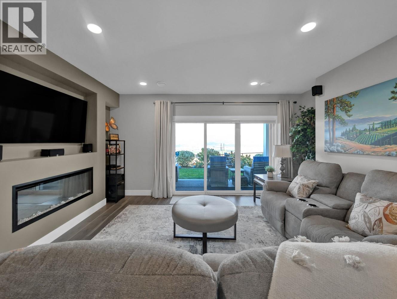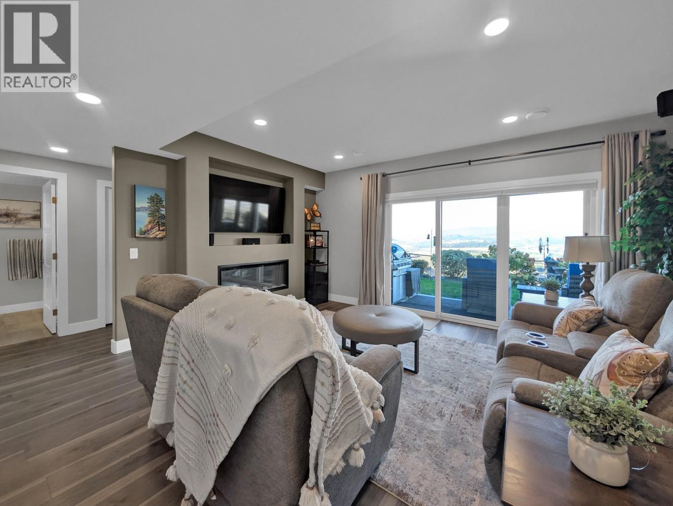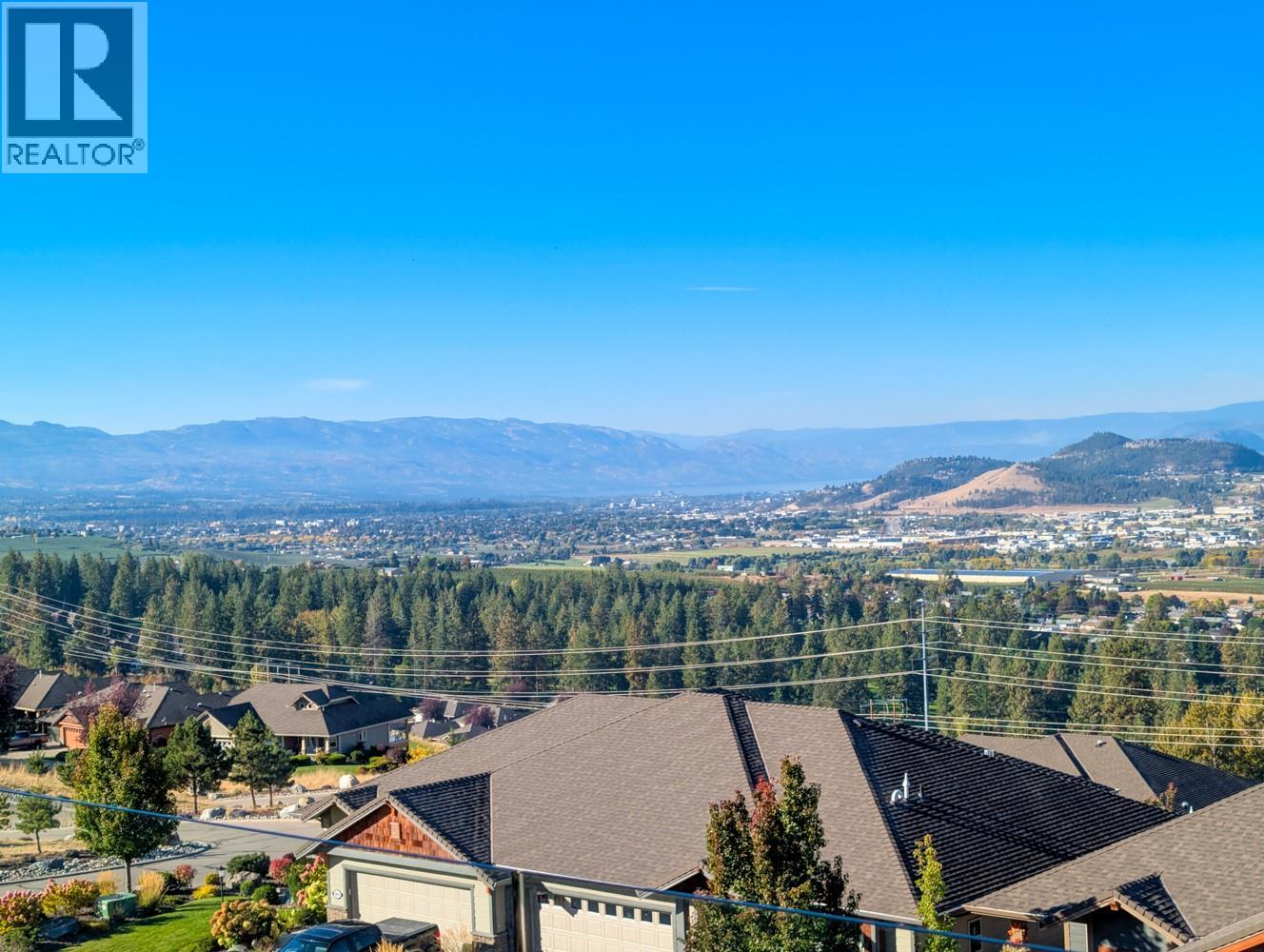 Impeccably maintained and upgraded to the max, this gorgeous 4 bedroom + den half duplex with big lake and mountain views is located in the desirable Sunset Ranch community. Designed with a timeless and neutral palette, the open-concept main level features a classic white shaker kitchen with a natural gas range, beverage fridge, and island seating - perfect for casual dining and entertaining. The spacious primary suite includes a walk-in closet and a spa inspired ensuite with a custom tile shower, dual vanity, and private water closet. A versatile den on the main floor provides the ideal home office or flex space. Downstairs, the bright walkout level boasts three generous bedrooms, a cozy rec room with a built-in electric fireplace, wine cellar, finished storage or secondary office, and a full bathroom for family or guests. Outside, enjoy the fully fenced, beautifully landscaped yard with a hot tub - a serene retreat for relaxation or gatherings. Set within the quiet, golf course-adjacent Sunset Ranch community, this home offers easy access to the airport and is just 20 minutes from central Kelowna. A true standout, showcasing quality upgrades and evident pride of ownership throughout. (id:58842)