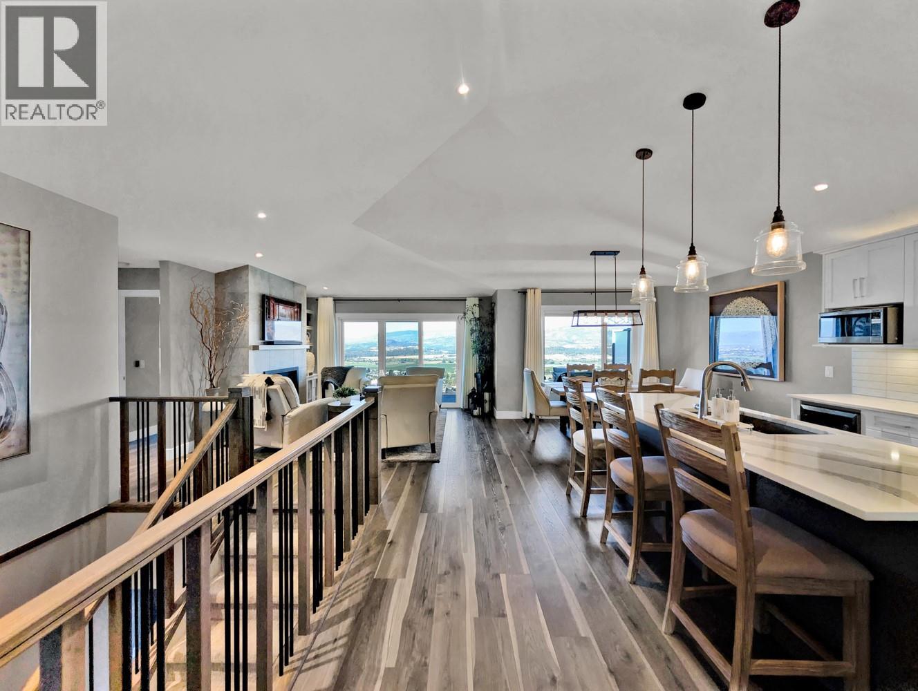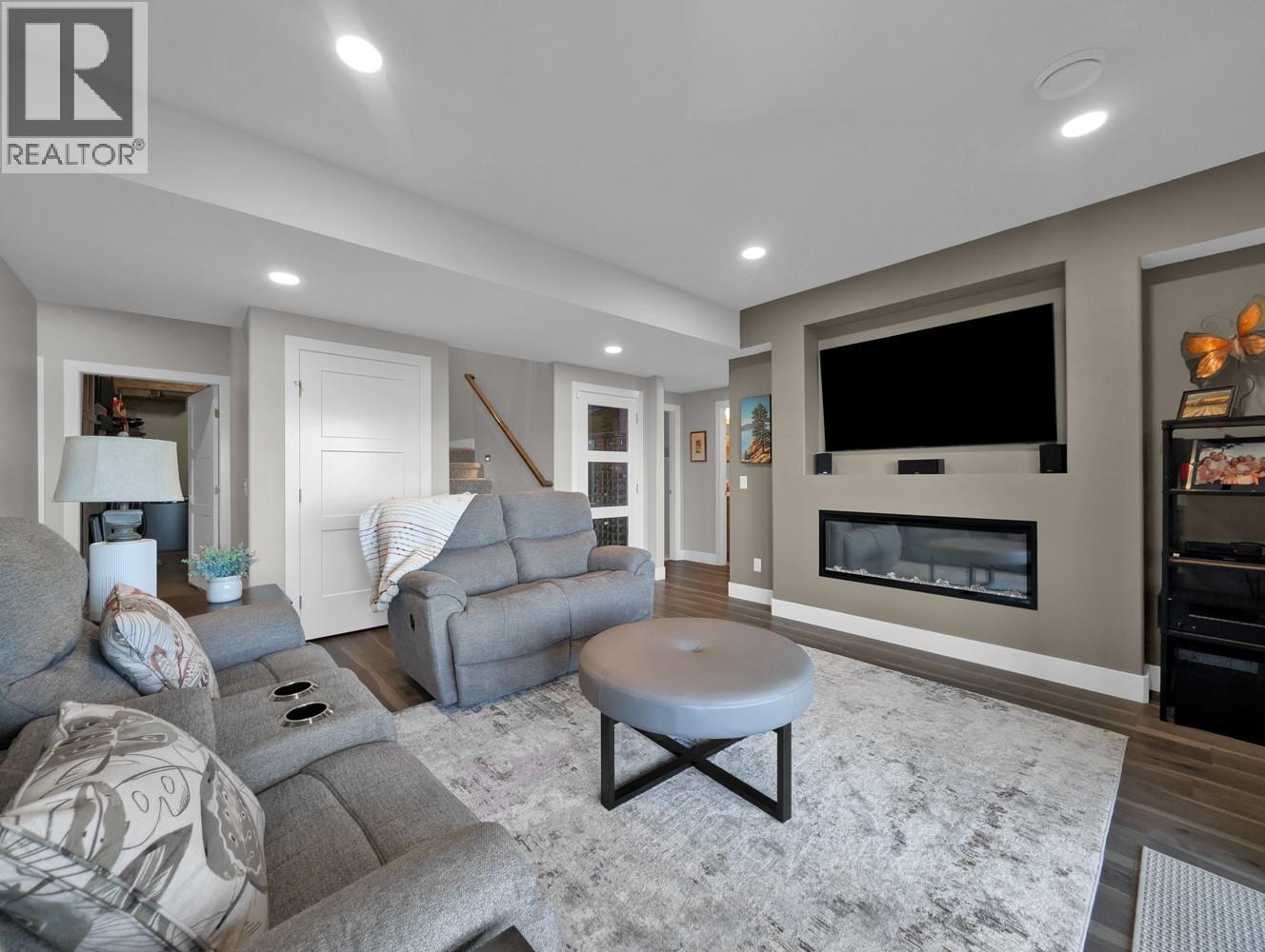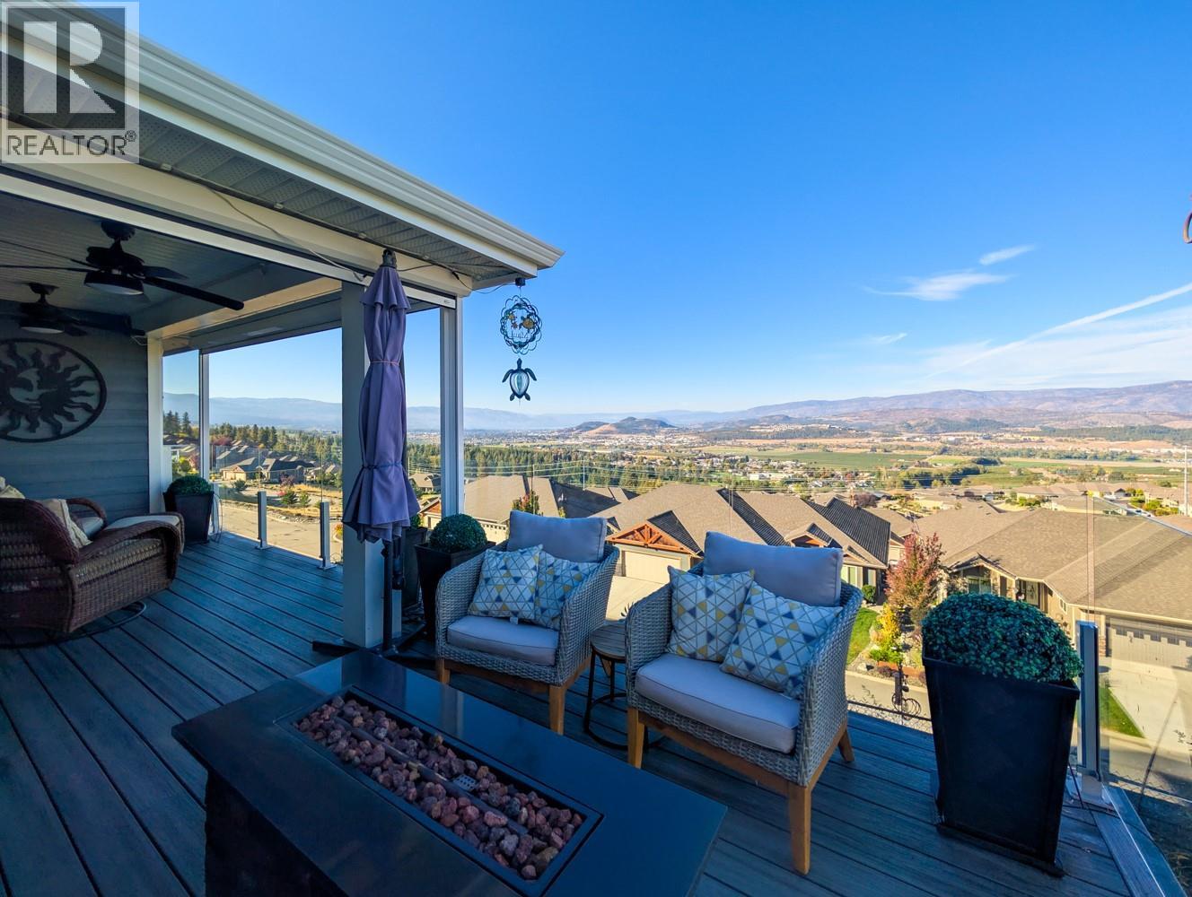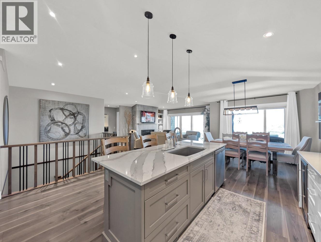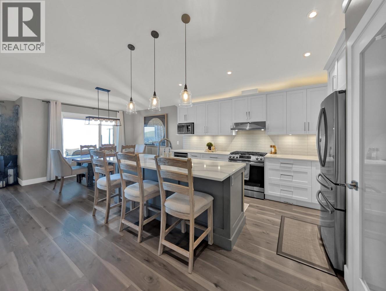 Impeccably maintained and upgraded to the max, this gorgeous 4 bedroom + den half duplex with big lake and mountain views is located in the desirable Sunset Ranch community. Designed with a timeless and neutral palette, the open-concept main level features a classic white shaker kitchen with a natural gas range, beverage fridge, and island seating - perfect for casual dining and entertaining. The spacious primary suite includes a walk-in closet and a spa inspired ensuite with a custom tile shower, dual vanity, and private water closet. A versatile den on the main floor provides the ideal home office or flex space. Downstairs, the bright walkout level boasts three generous bedrooms, a cozy rec room with a built-in electric fireplace, wine cellar, finished storage or secondary office, and a full bathroom for family or guests. Outside, enjoy the fully fenced, beautifully landscaped yard with a hot tub - a serene retreat for relaxation or gatherings. Set within the quiet, golf course-adjacent Sunset Ranch community, this home offers easy access to the airport and is just 20 minutes from central Kelowna. A true standout, showcasing quality upgrades and evident pride of ownership throughout. (id:58842)