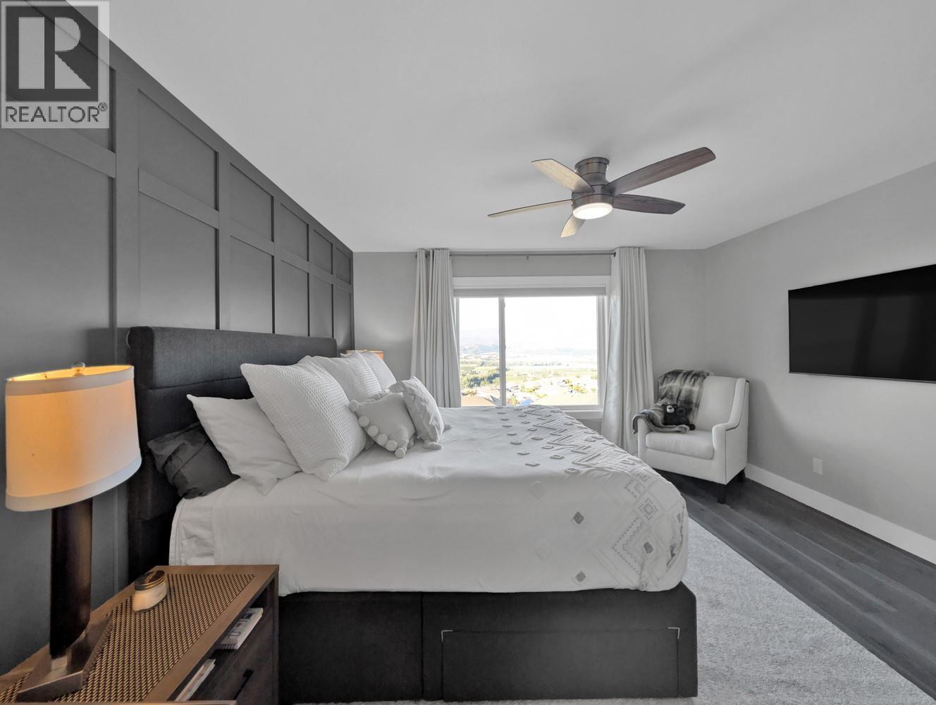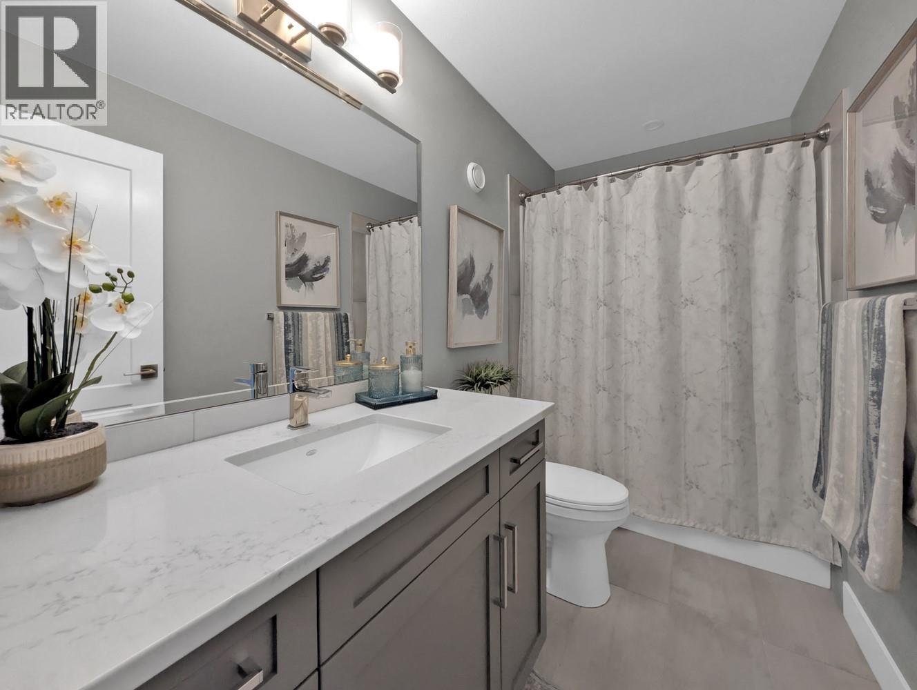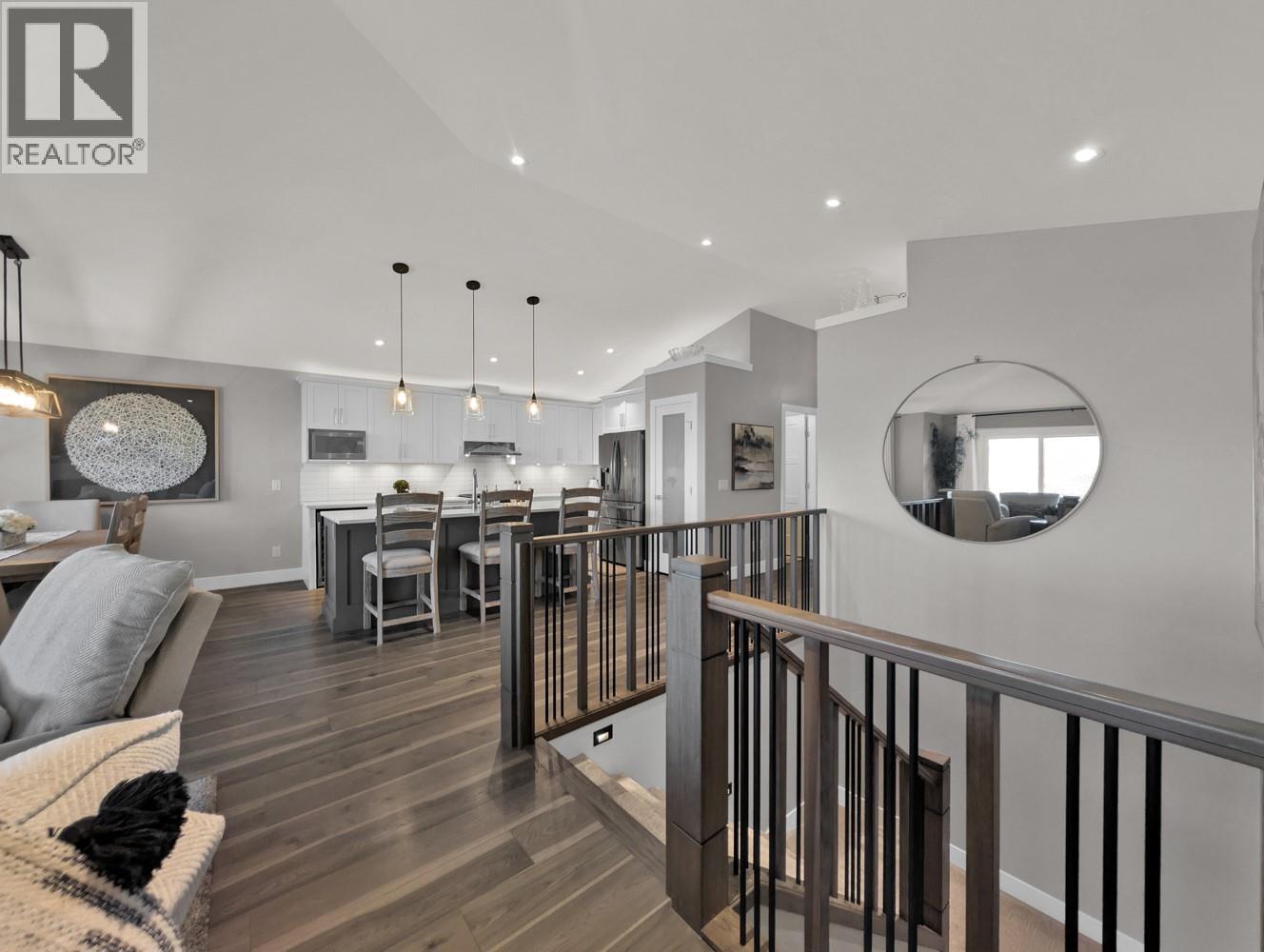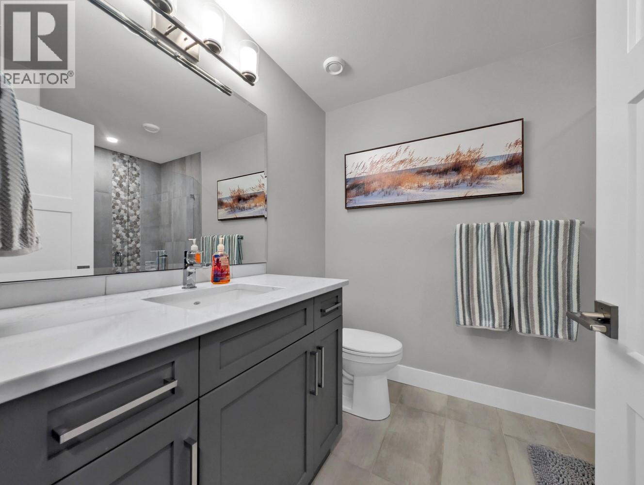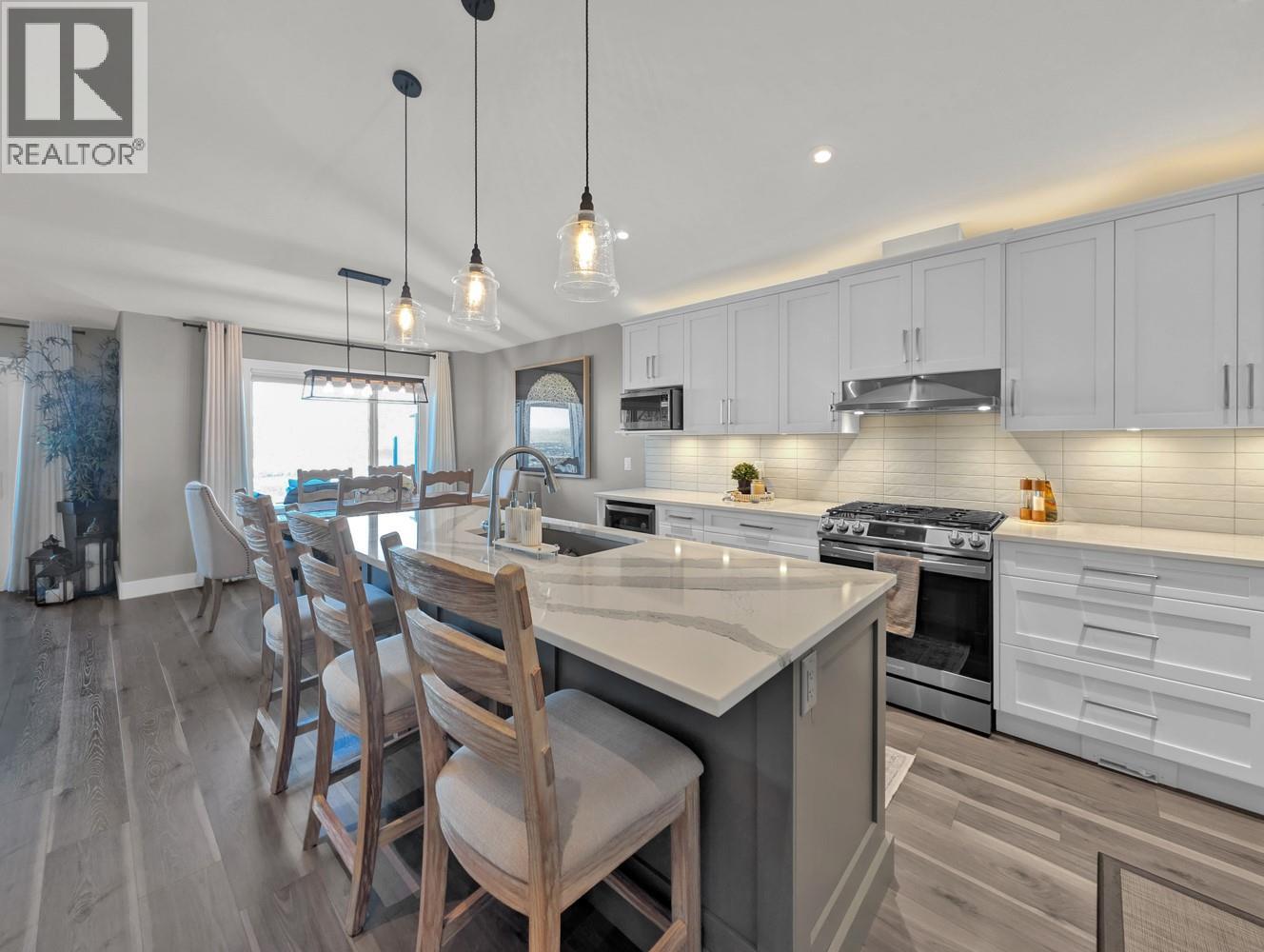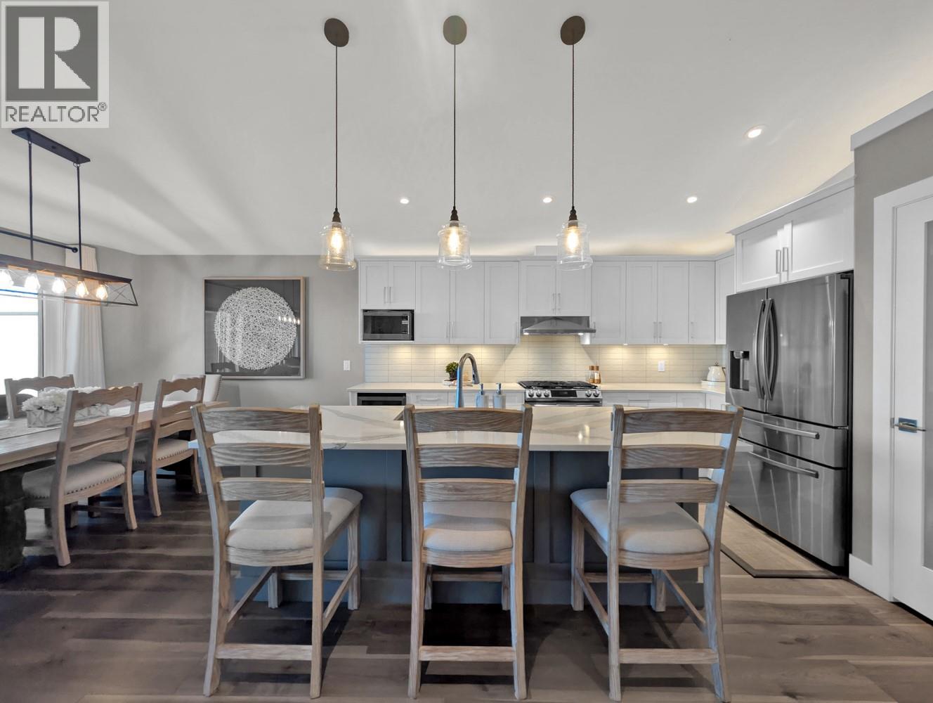 Impeccably maintained and upgraded to the max, this gorgeous 4 bedroom + den half duplex with big lake and mountain views is located in the desirable Sunset Ranch community. Designed with a timeless and neutral palette, the open-concept main level features a classic white shaker kitchen with a natural gas range, beverage fridge, and island seating - perfect for casual dining and entertaining. The spacious primary suite includes a walk-in closet and a spa inspired ensuite with a custom tile shower, dual vanity, and private water closet. A versatile den on the main floor provides the ideal home office or flex space. Downstairs, the bright walkout level boasts three generous bedrooms, a cozy rec room with a built-in electric fireplace, wine cellar, finished storage or secondary office, and a full bathroom for family or guests. Outside, enjoy the fully fenced, beautifully landscaped yard with a hot tub - a serene retreat for relaxation or gatherings. Set within the quiet, golf course-adjacent Sunset Ranch community, this home offers easy access to the airport and is just 20 minutes from central Kelowna. A true standout, showcasing quality upgrades and evident pride of ownership throughout. (id:58842)