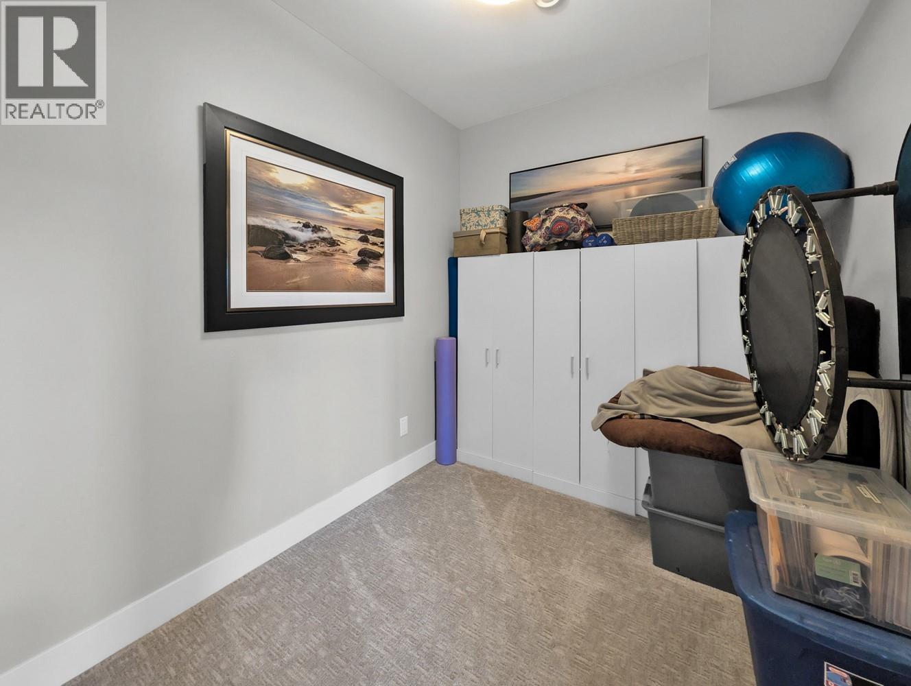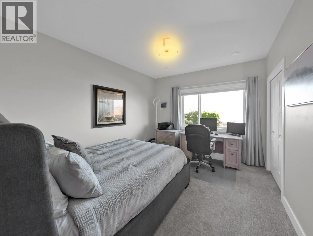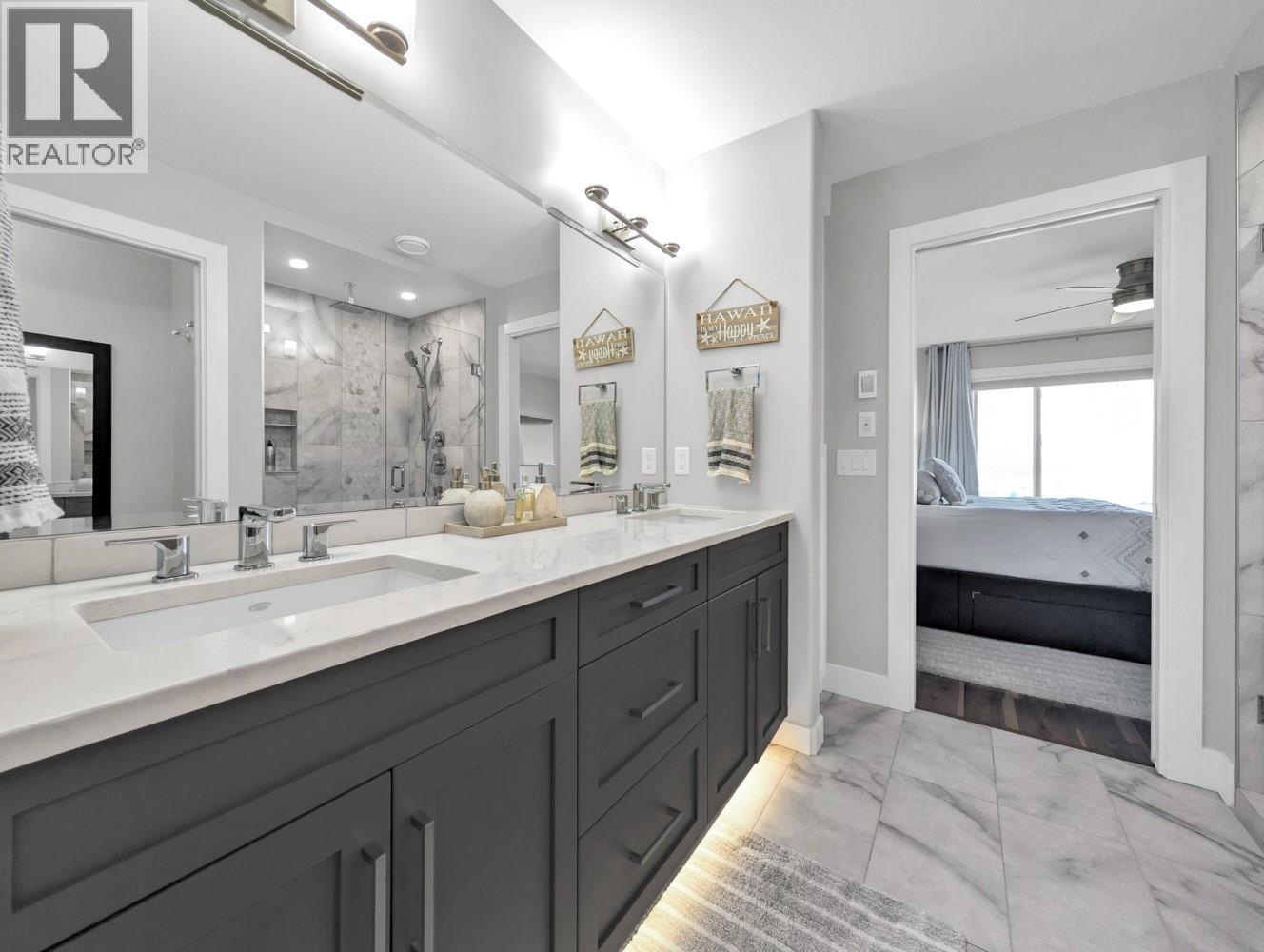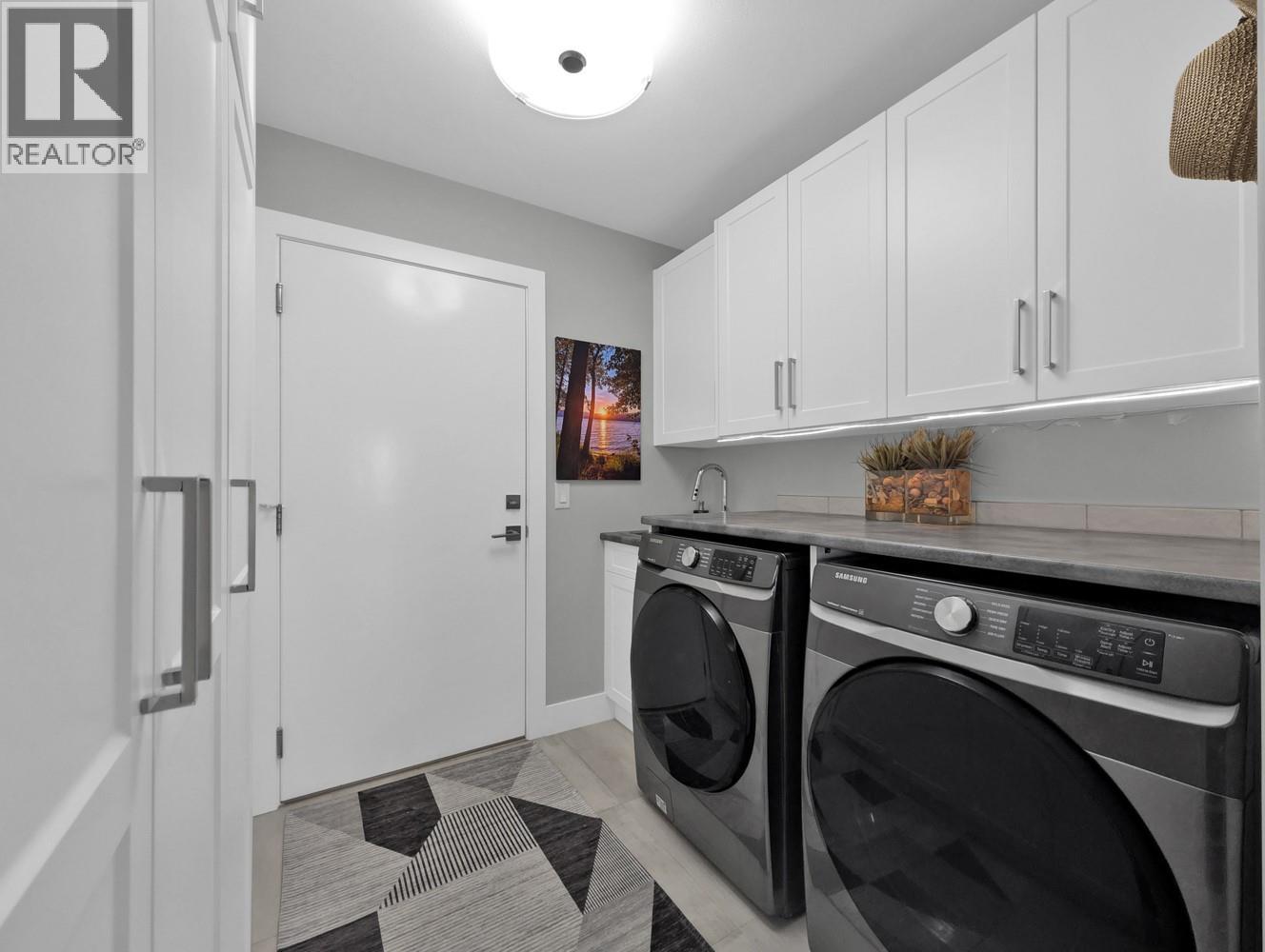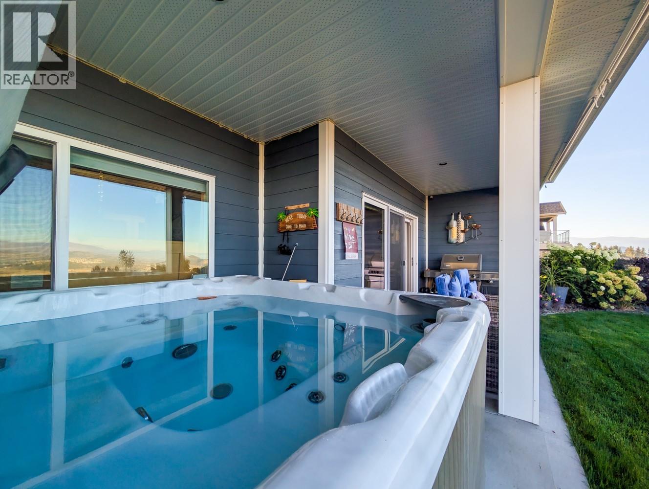 Impeccably maintained and upgraded to the max, this gorgeous 4 bedroom + den half duplex with big lake and mountain views is located in the desirable Sunset Ranch community. Designed with a timeless and neutral palette, the open-concept main level features a classic white shaker kitchen with a natural gas range, beverage fridge, and island seating - perfect for casual dining and entertaining. The spacious primary suite includes a walk-in closet and a spa inspired ensuite with a custom tile shower, dual vanity, and private water closet. A versatile den on the main floor provides the ideal home office or flex space. Downstairs, the bright walkout level boasts three generous bedrooms, a cozy rec room with a built-in electric fireplace, wine cellar, finished storage or secondary office, and a full bathroom for family or guests. Outside, enjoy the fully fenced, beautifully landscaped yard with a hot tub - a serene retreat for relaxation or gatherings. Set within the quiet, golf course-adjacent Sunset Ranch community, this home offers easy access to the airport and is just 20 minutes from central Kelowna. A true standout, showcasing quality upgrades and evident pride of ownership throughout. (id:58842)