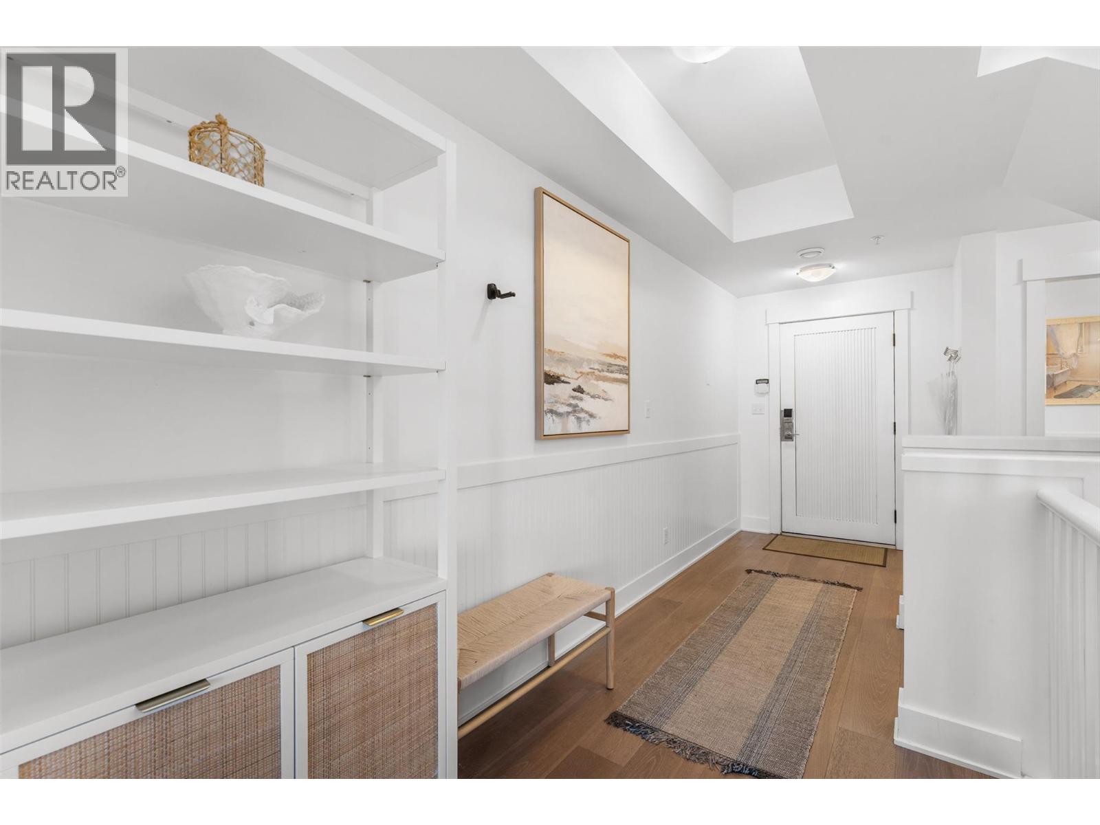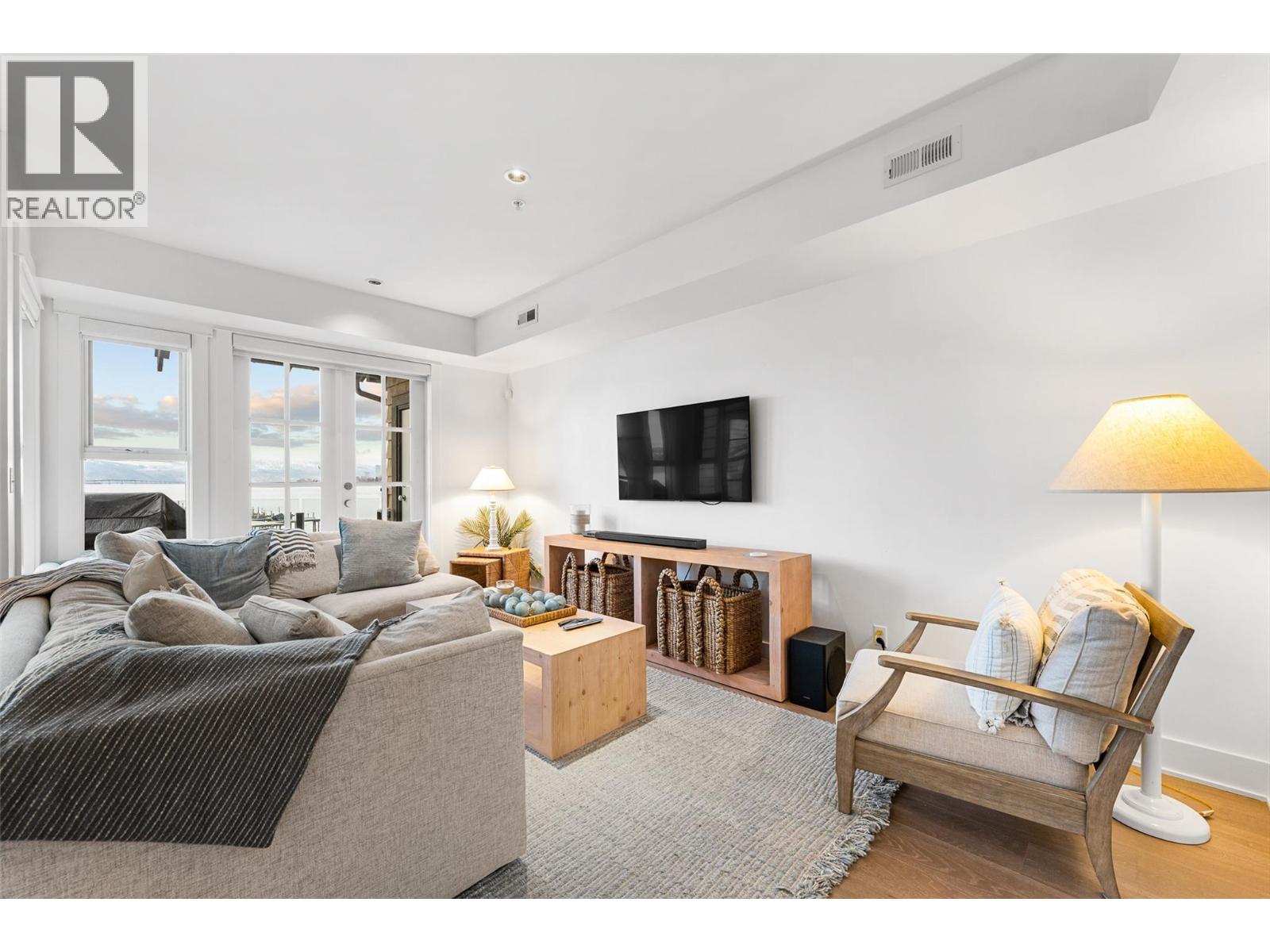 Experience true waterfront living at Mission Shores in this light-filled 3-bedroom, 4-bath townhome set along one of Kelowna’s most sought-after stretches of Lake Okanagan. Blending a refined beach-house feel with front-row views, this spacious residence offers bright, open-concept living and seamless indoor–outdoor flow. The main level features wide-plank hardwood floors, high ceilings, and a kitchen with a large quartz peninsula island, shaker cabinetry, and premium appliances. The dining and living areas open through French doors to a generous lakeview deck with gas BBQ hookup perfect for sunset gatherings. A private main-floor bedroom with ensuite is ideal for guests. Upstairs, the lakeview primary retreat impresses with vaulted ceilings, walk-in closet, 5-piece ensuite, and access to a private deck overlooking the shoreline. A second upper-level bedroom offers vaulted ceilings, walk-in closet, and its own 3-piece ensuite. A bright landing with a large skylight fills the home with natural light. Additional features include two parking spots, two private entrances, one directly from the garage, ample storage, gated courtyard entry, and in-unit laundry. A dedicated 8,000 lb. boat slip (#26) completes this exceptional offering. Residents of Mission Shores enjoy a lakeside pool and hot tub, fitness centre, meeting room, and beautifully landscaped paths just steps to the beach, restaurants, and all Lower Mission amenities. (id:58842)