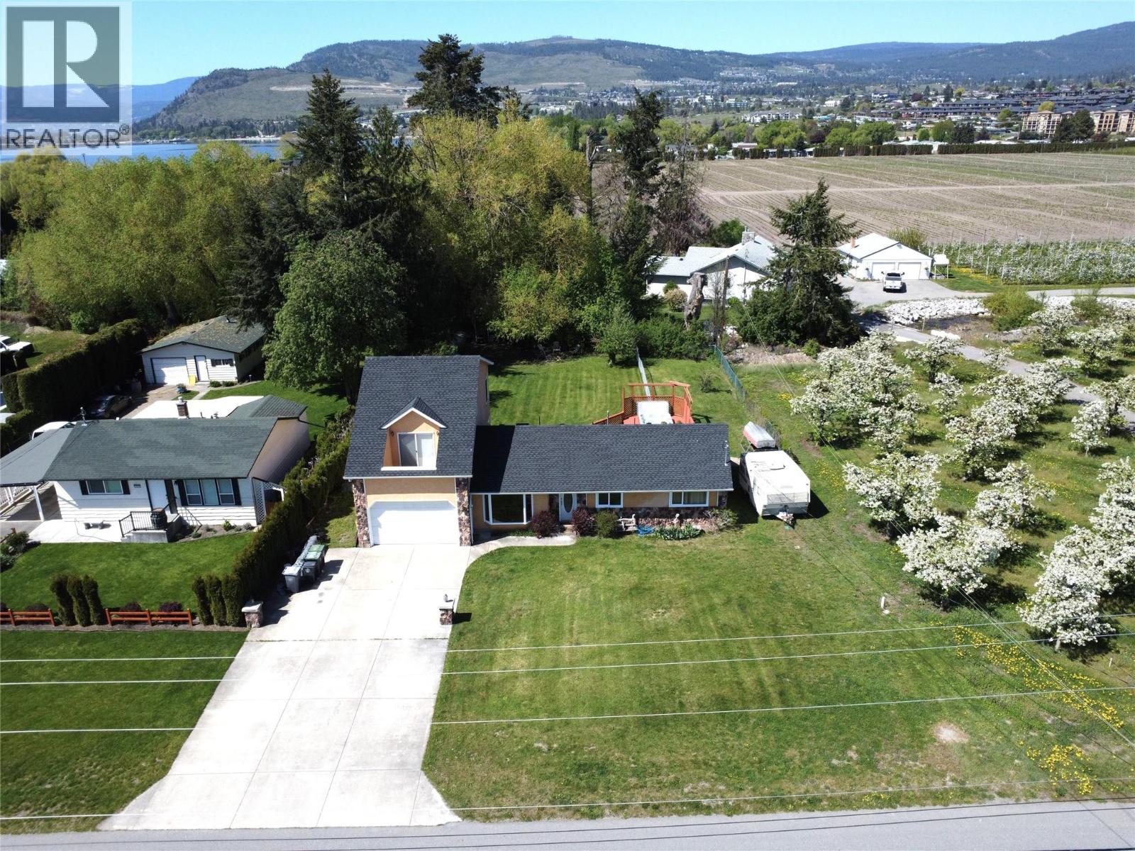 Country Living Just Steps from the Lake Tucked into a one of the area's most coveted streets, 3982 Hitchner Road offers the rare blend of space, privacy, and walkable lake access. This 0.3-acre property backs onto a peaceful creek and is surrounded by orchards, yet it's just one block from two sandy beaches and minutes from town. The 2,026 sq ft home features 3 bedrooms plus a den, 2 full bathrooms, and a flexible layout with potential to add a fourth bedroom. The spacious primary suite includes two private balconies overlooking separate orchards. The main level offers a warm, country-style kitchen with hickory cabinets, a bright living area with views of mature trees, and a cozy den that opens to the backyard. Upgrades include a new roof, high-efficiency furnace and A/C, water softener, private and shared water licenses, and city sewer connection. Downstairs offers 386 sq ft of bonus space with a separate entrance, ideal for a home office, studio, or suite. Outside, enjoy a large deck, hot tub under the trees, and an oversized garage with parking for five or more vehicles, including space for RV and boat. Hitchner Road is known for its rural charm, large lots, and close-knit community. Homes here are tightly held and rarely available, this is a well-maintained property with space to grow and make it your own. (id:58842)
