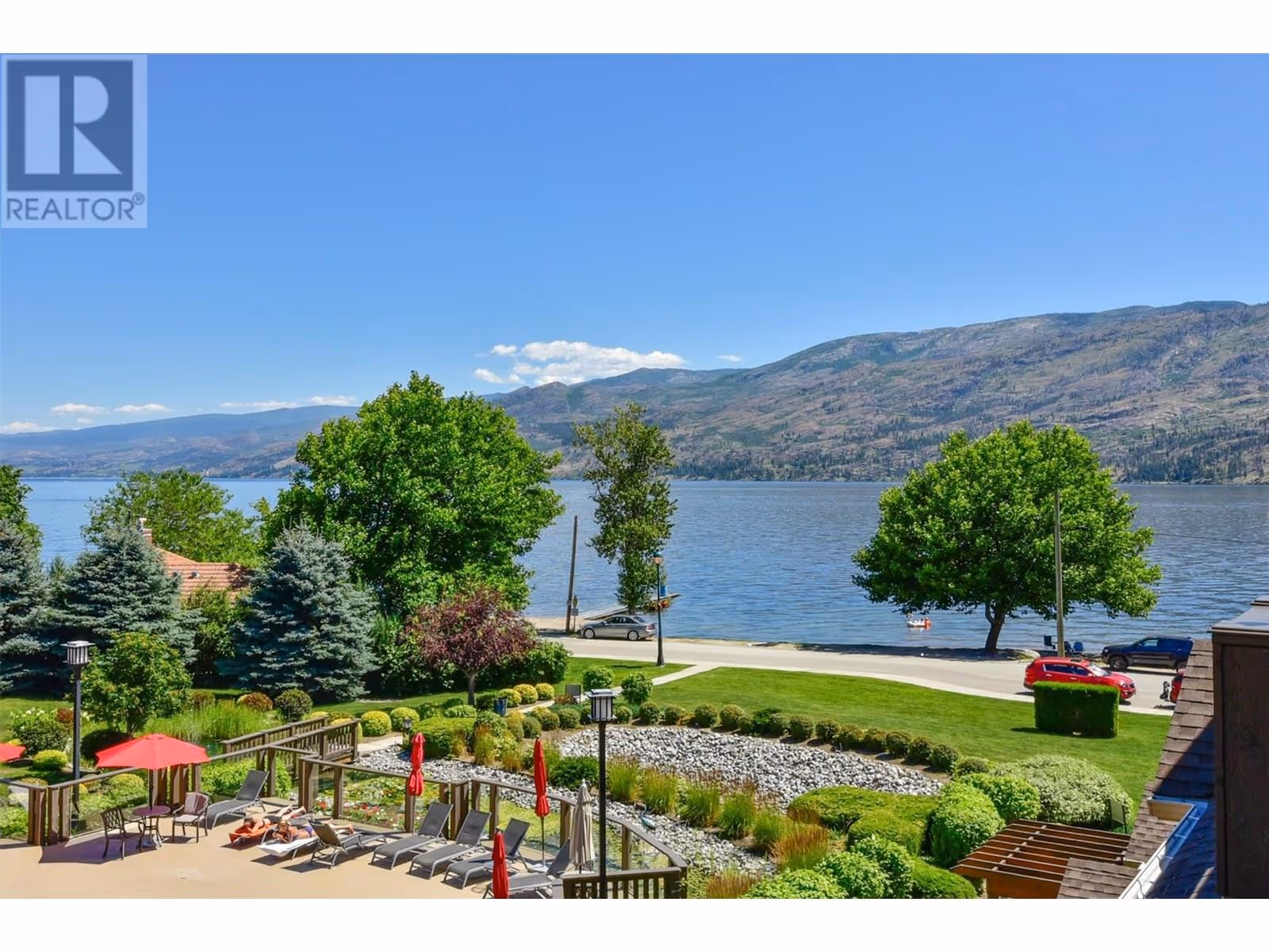 Experience the pinnacle of lakeside luxury in this fully renovated top-floor penthouse at Lakeshore Gardens. Spanning 1,748 square feet, this 3-bedroom, 2-bath retreat offers sweeping views of the lake, pool, and gardens from an oversized double-deck balcony. Inside, vaulted ceilings and high-end finishes create an ambiance of elegance and comfort. The gourmet kitchen is a chef’s dream, outfitted with granite countertops, custom soft-close cabinetry, pull-out drawers, and a premium gas range. In the living room, a striking floor-to-ceiling gas fireplace serves as the centrepiece, while stylish vinyl-coated laminate flooring, luxe tile in the bathrooms, and plush carpeting in the bedrooms add warmth throughout. The primary suite is a private haven with a walk-in closet and spa-like ensuite featuring quartz countertops, a deep soaker tub, and a rainfall shower. A brand-new heat pump, installed in December 2024, ensures optimal climate control year-round. Residents enjoy resort-style amenities including a heated pool, year-round hot tub, full-service gym, secure kayak and bike storage, boat launch, social hall, private storage unit, and two guest suites. Just steps from the shores of Okanagan Lake, this move-in-ready penthouse blends tranquil views with upscale living—an opportunity not to be missed. Schedule your private viewing today and step into your new lakeside lifestyle. (id:58842)