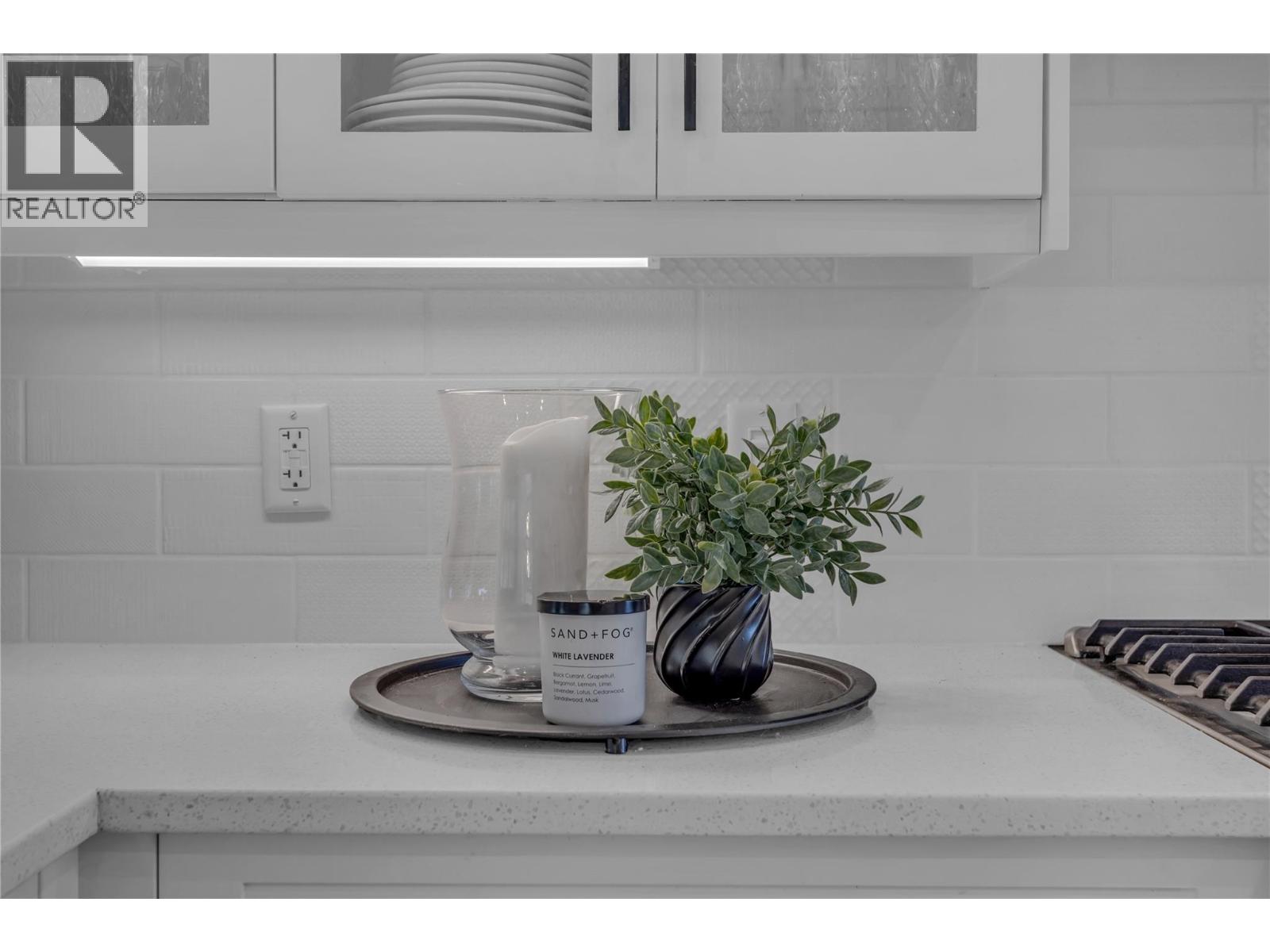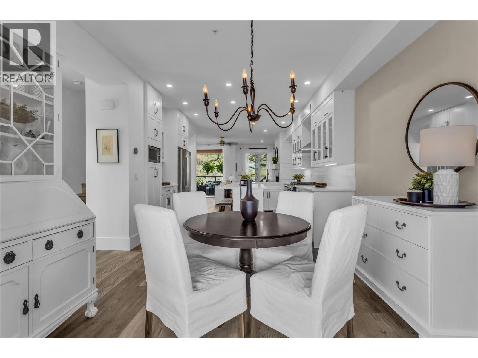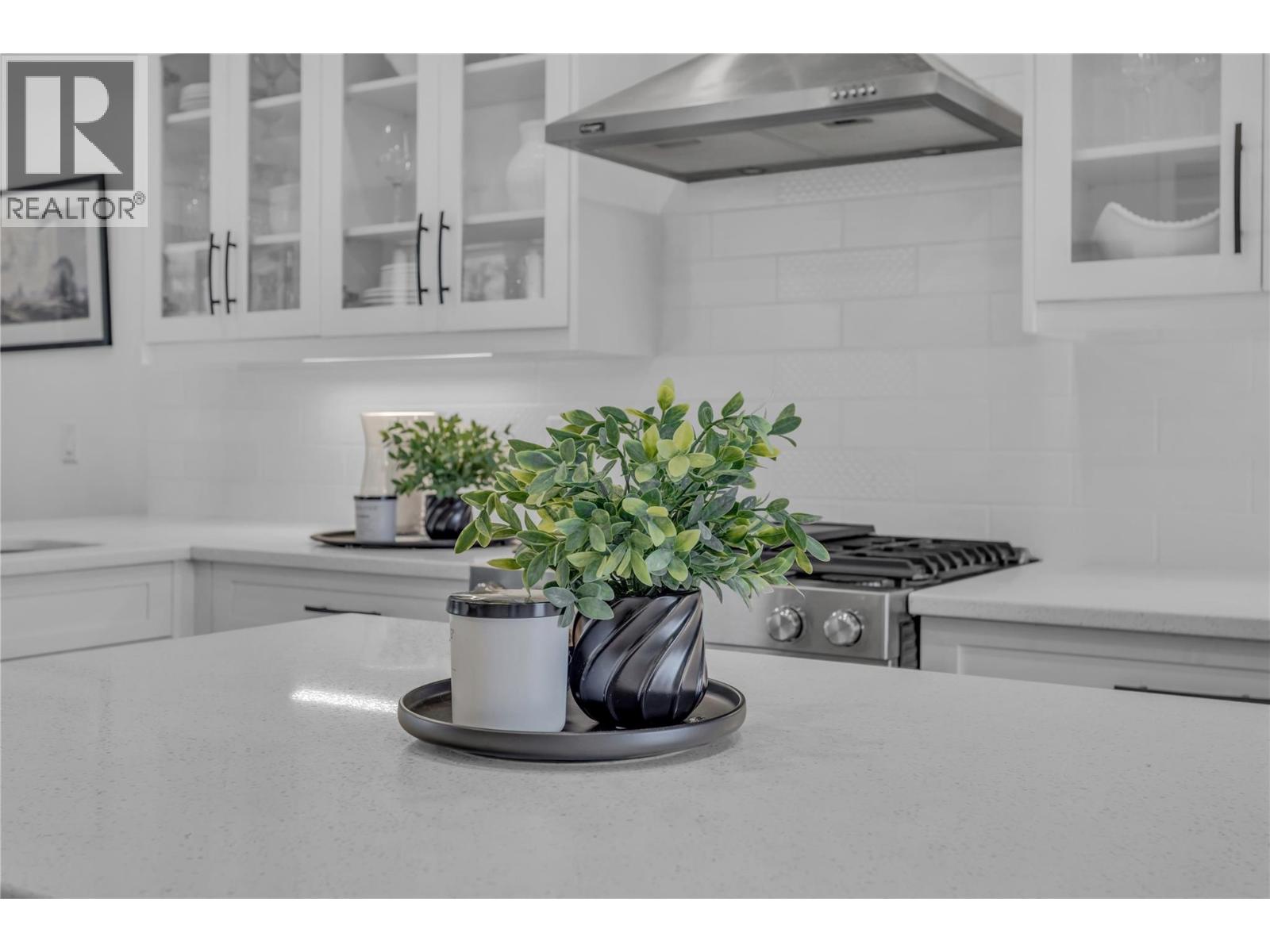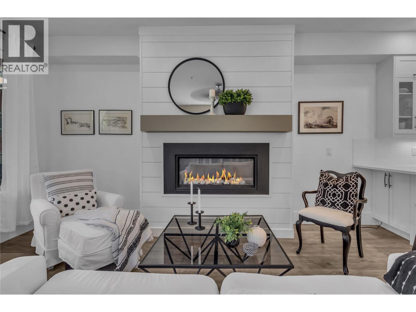 Welcome to The Trails! Backing onto Pincushion Mountain and steps from Hardy Falls and endless scenic trails, this location couples nature with convenience. An executive 9-hole golf course is approved next door, while Beach Avenue’s shops, restaurants, parks, marinas, wineries, and microbreweries are just minutes down the hill. This exceptional end unit presents like a show home. The craftsman exterior with Hardie board siding, rich wood and slate accents, and a stamped concrete entry sets the tone for the quality throughout. Inside, soaring ceilings and expansive windows flood the home with natural light, creating an open, airy atmosphere. The main living level is designed for entertaining, featuring a stunning white kitchen with upgraded cabinetry, quartz countertops, custom backsplash, premium appliances, and refined hardware. The living room is anchored by a cozy natural gas fireplace with a solid wood mantle and elegant shiplap detail. Two inviting covered decks on this level offer private views from both sides of the home. Upstairs offers 3 generous bedrooms and 2 full bathrooms, including a serene primary retreat with vaulted ceilings and transom windows. On the entry level, a large rec room with a 2nd fireplace opens directly to the patio — ideal for guests or seamless indoor-outdoor living. Phantom screens throughout, an oversized tandem garage with abundant storage for all your lifestyle gear, and the peace of mind of a FireSmart community. (id:58842)