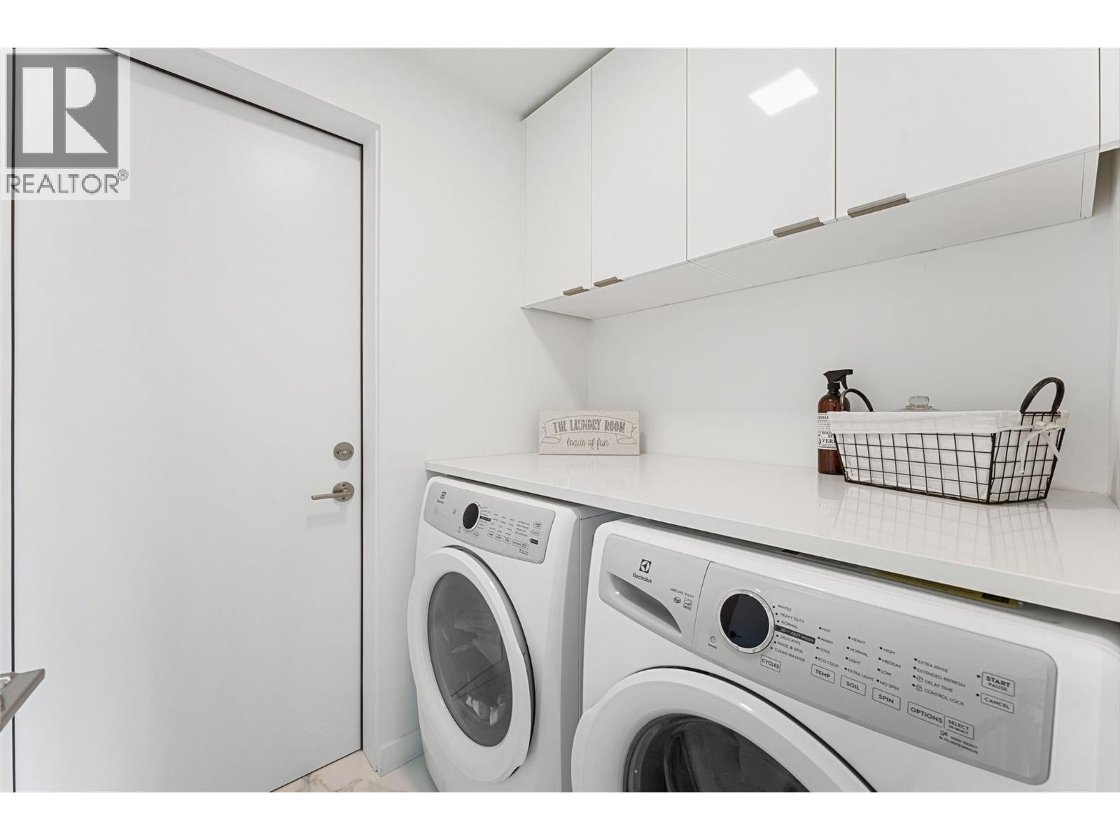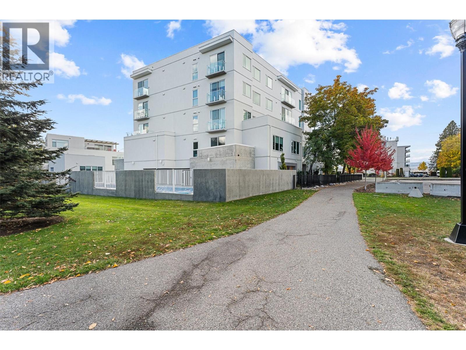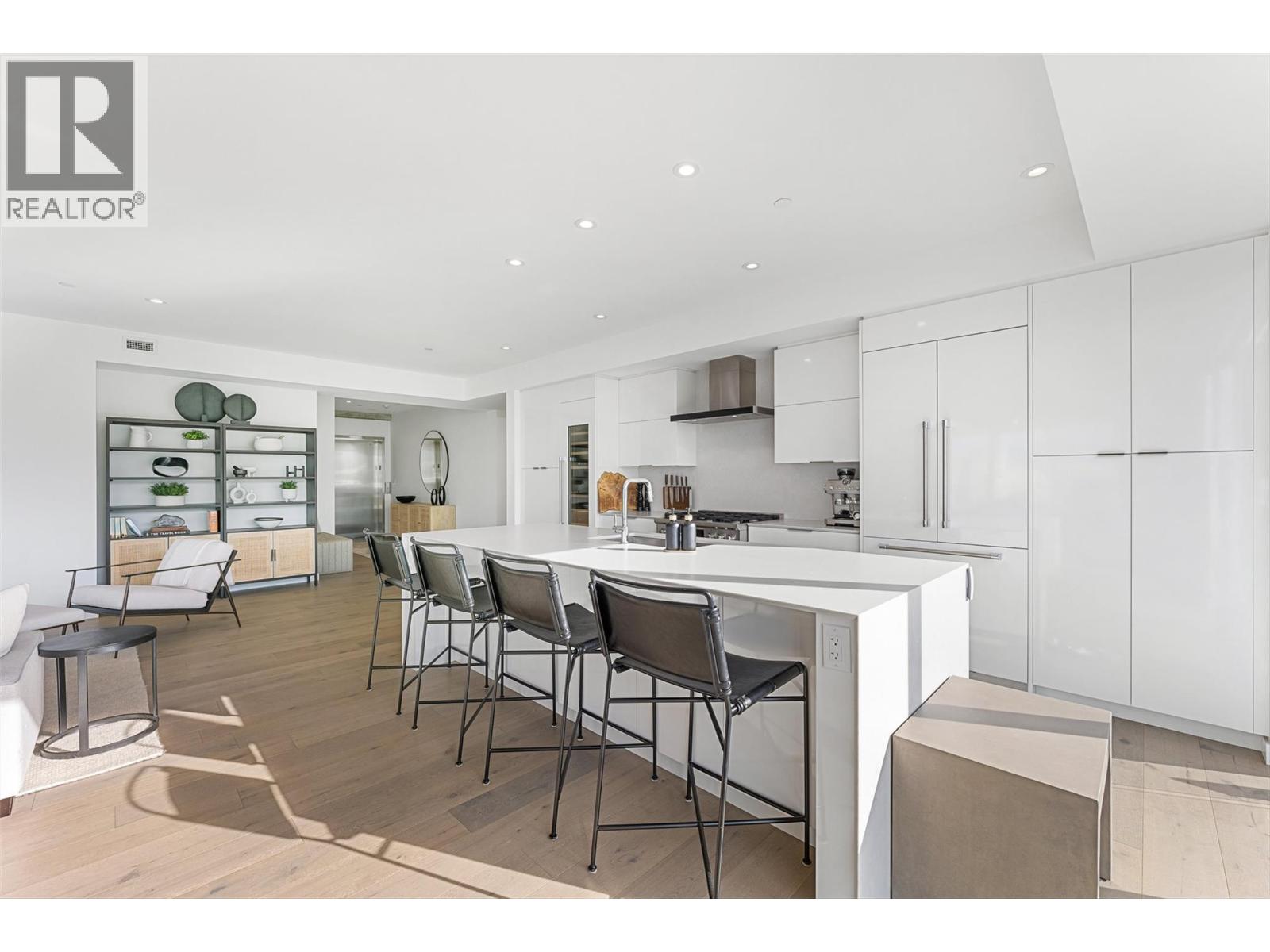Experience elevated living in this contemporary residence with expansive, breathtaking views of Okanagan Lake and the surrounding mountains. Walls of glass frame the scenery throughout the open-concept main living area, where 10 ft. ceilings, wide-plank hardwood, and aseamless flow creating a bright and inviting space. The kitchen features sleek white soft-close cabinetry, a waterfall edge island, and premium Fisher & Paykel appliances including a six-burner gas range, paneled fridge/freezer, and wine fridge. The living and dining areas open to a covered lakeview patio with glass railings, a gas line for BBQ, and power sunshades—perfect for entertaining or quiet mornings overlooking the sparkling blue waters of Okanagan Lake. The primary retreat features a walk-in closet with custom built-ins, a Juliet balcony, and a spa-inspired ensuite with heated floors, a freestanding tub, and a fully tiled glass shower. Two additional bedrooms, each with their own ensuite, provide comfort and privacy for family or guests. Every detail has been thoughtfully designed, from the power blinds in every room to the direct elevator access and heated double garage with EV charging. Located in a boutique building backing onto a park, and just steps to the shores of Okanagan Lake, this home captures the best of Kelowna’s modern lakeside lifestyle—effortless, refined, and surrounded by nature. (id:58842)