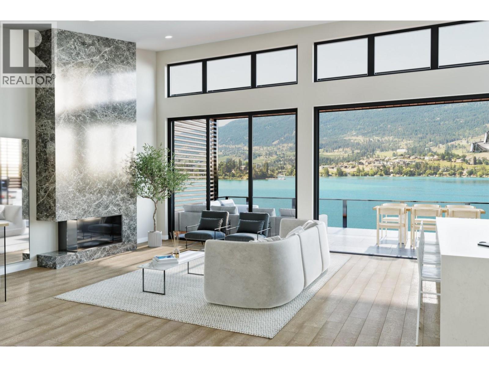Welcome to Owl’s Nest an exclusive collection of 28 Net Zero luxury homes situated on the shores of Kalamalka Lake – one of the most beautiful and exclusive lakes in the Okanagan Valley. The community features panoramic lake views with direct access to the Okanagan Rail Trail and beach, municipally approved 20-slip private marina and resort-style amenities: multi-purpose sport courts and community fire pits to provide endless opportunities to relax and enjoy paradise. The Water's Edge III features convenient main floor living. This home offers unobstructed lake views from every floor, with a primary suite on the main living floor (upper level). The open-concept kitchen/living area features 14+ ft vaulted ceilings, floor-to-ceiling windows, and sliding folding doors that open onto a covered balcony with an optional outdoor kitchen for seamless indoor/outdoor entertaining. The gourmet kitchen is equipped with chef-inspired appliances. Select from 3 finishing collections or customize to your personal taste. An impressive wine wall with cabinet-coordinated wood surround, simple horizontal bottle display, and LED lighting highlights your collection. Additional features include an oversized two-car garage with extra storage for aquatic gear, and a three-story walk-out with a private landscaped terrace. All this is located just a two-minute walk to the beach. (id:58842)