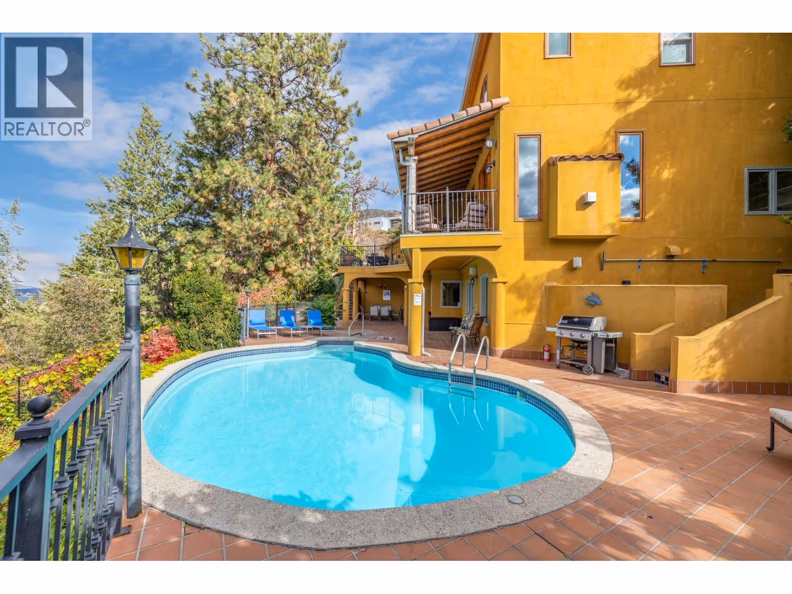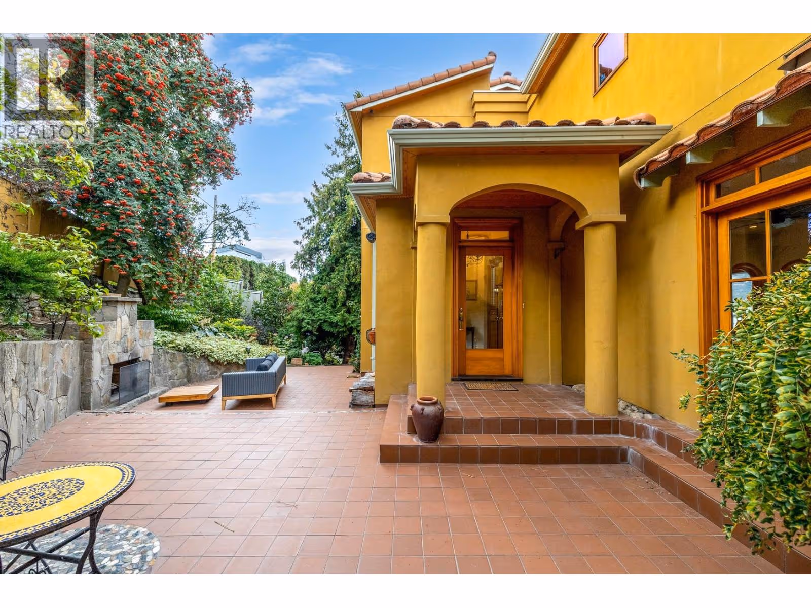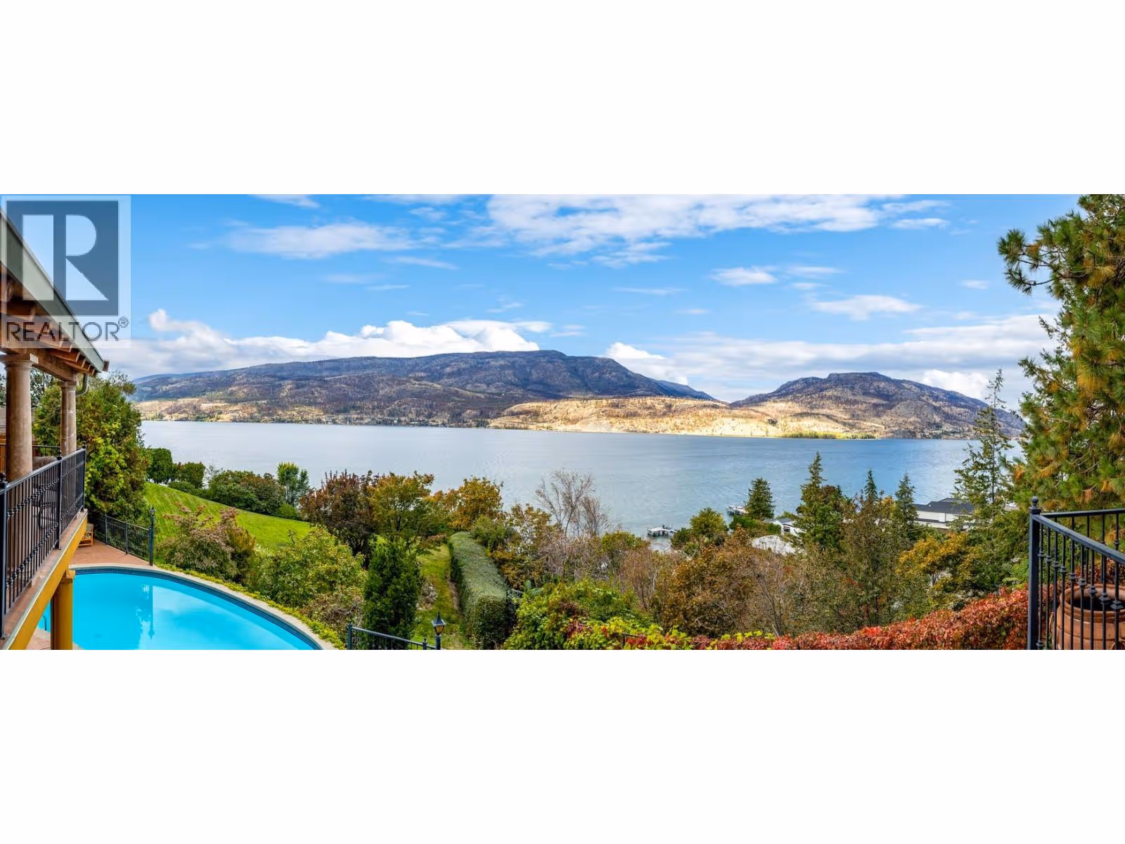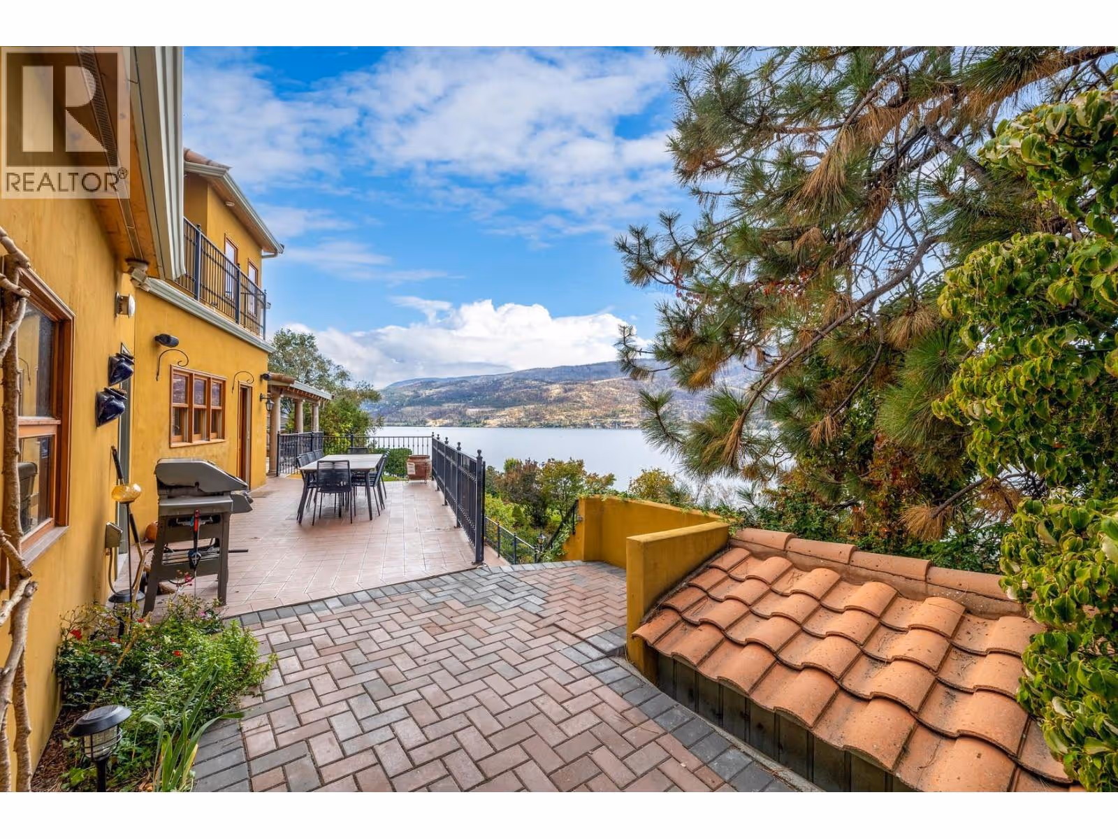 Welcome to this Mediterranean-inspired home in Poplar Point, the best uninterrupted views of Okanagan Lake and surrounding mountains. With 4 bedrooms and 4 baths across three levels, this property combines timeless design, and privacy in a highly desirable location just minutes to downtown Kelowna. The main level impresses with high ceilings, maple hardwood floors, and expansive wood-casement windows framing Okanagan Lake. The chef’s kitchen features stone countertops, Viking gas cooktop, Gaggenau wall oven, Sub-Zero fridge, and a central island perfect for entertaining. A formal dining room with a brick-surround fireplace and direct courtyard access complements the living room, where double French doors open to a lakeview deck. Upstairs, the primary retreat offers a private balcony, walk-in closet, and spa-style ensuite with an oversized tub and dual-head shower. A guest room with Murphy bed, 3-piece bath, and laundry complete the level. The walk-out lower floor offers a self-contained 1-bedroom + den suite with private kitchen, living area, and direct pool access—perfect for extended family or guests. Outdoors, multiple patios, lush landscaping, and a kidney-shaped pool set the stage for summer gatherings. Nestled on a quiet cul-de-sac, just steps from Knox Mountain’s hiking and biking trails and minutes to the lake, this property offers an ideal setting to enjoy Okanagan living at its finest. (id:58842)