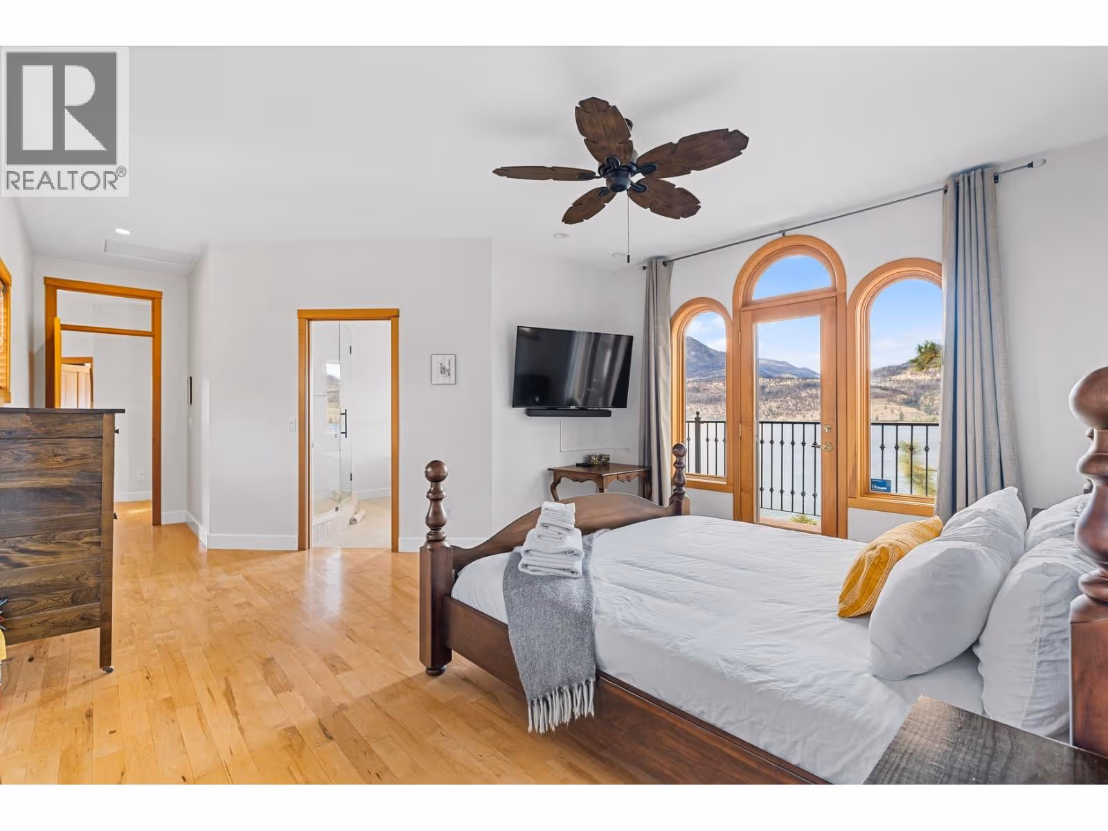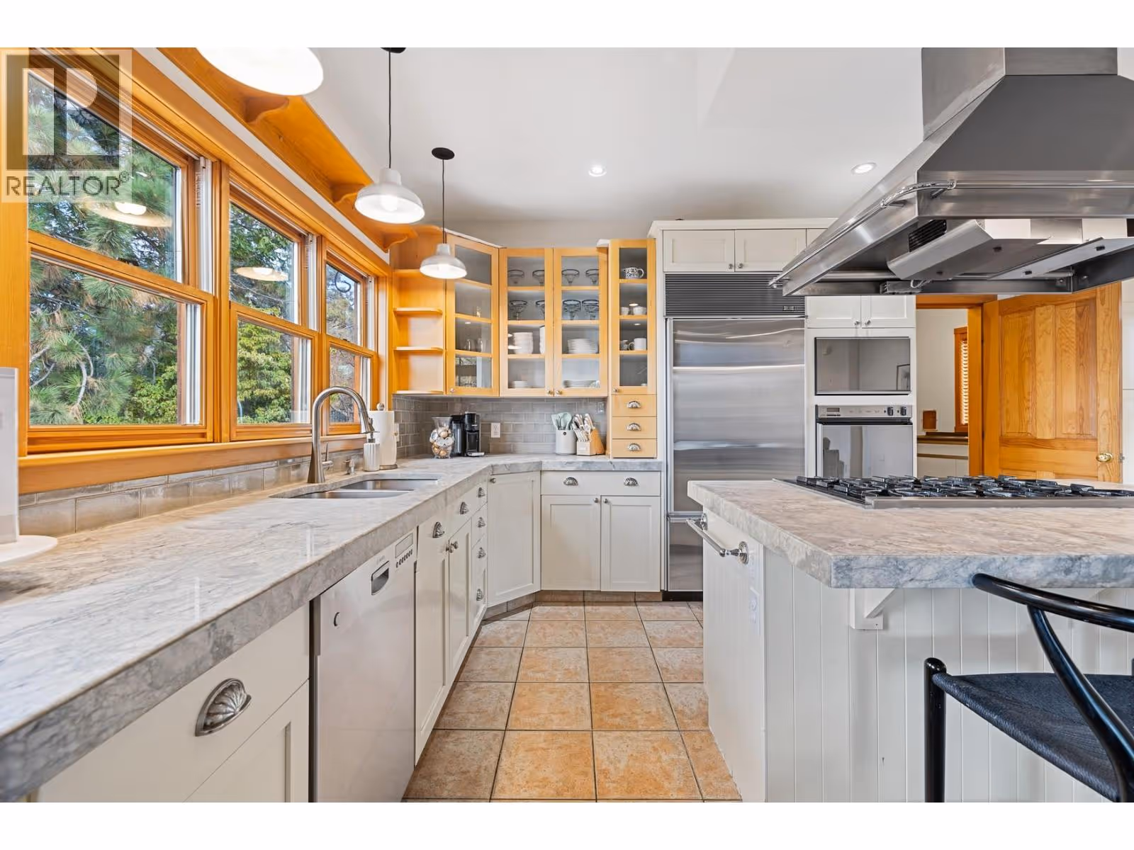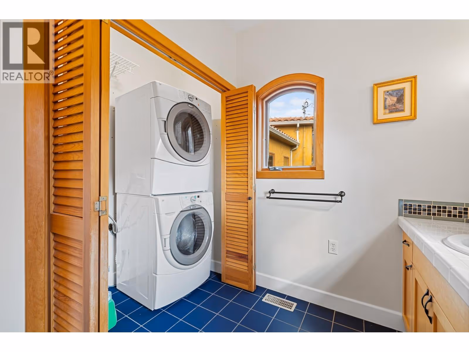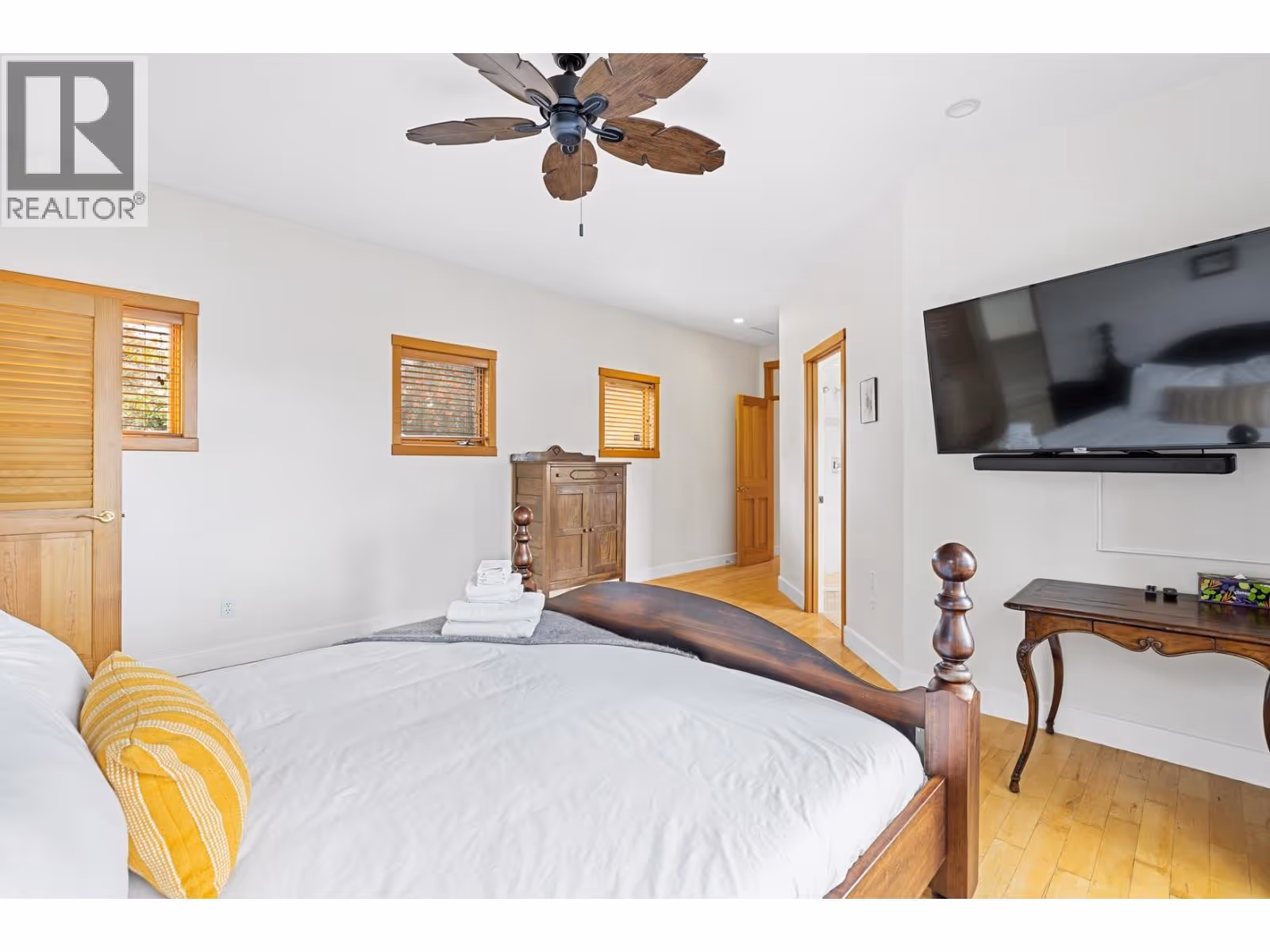 Welcome to this Mediterranean-inspired home in Poplar Point, the best uninterrupted views of Okanagan Lake and surrounding mountains. With 4 bedrooms and 4 baths across three levels, this property combines timeless design, and privacy in a highly desirable location just minutes to downtown Kelowna. The main level impresses with high ceilings, maple hardwood floors, and expansive wood-casement windows framing Okanagan Lake. The chef’s kitchen features stone countertops, Viking gas cooktop, Gaggenau wall oven, Sub-Zero fridge, and a central island perfect for entertaining. A formal dining room with a brick-surround fireplace and direct courtyard access complements the living room, where double French doors open to a lakeview deck. Upstairs, the primary retreat offers a private balcony, walk-in closet, and spa-style ensuite with an oversized tub and dual-head shower. A guest room with Murphy bed, 3-piece bath, and laundry complete the level. The walk-out lower floor offers a self-contained 1-bedroom + den suite with private kitchen, living area, and direct pool access—perfect for extended family or guests. Outdoors, multiple patios, lush landscaping, and a kidney-shaped pool set the stage for summer gatherings. Nestled on a quiet cul-de-sac, just steps from Knox Mountain’s hiking and biking trails and minutes to the lake, this property offers an ideal setting to enjoy Okanagan living at its finest. (id:58842)