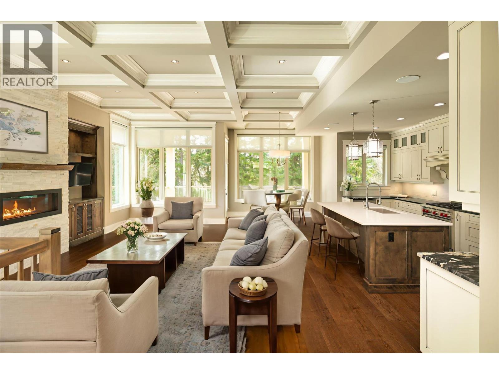 Set within the sought-after community of Gallaghers Canyon, this beautifully finished home offers timeless design, thoughtful upgrades, and a private setting surrounded by mature greenery. Striking curb appeal with stone and Hardie siding, a covered entry, and a charming front patio welcomes you in. Inside, tall ceilings and coffered detailing create a refined feel throughout. The kitchen blends style and function with classic white cabinetry, large island, Wolf range, and walk-in pantry. The living room centres around a floor-to-ceiling stone fireplace with custom built-ins, while a main floor office/den with custom ceiling detail adds versatility. The primary suite is a true retreat with crown moulding accents, designer wallpaper, and a well-appointed ensuite featuring dual sinks, a soaker tub, and walk-in shower. Cohesive cabinetry and finishes carry throughout the home. The lower level is designed for entertaining, offering a spacious recreation area, family room with built-ins, and a stunning wet bar with storage. Walk out to a covered patio overlooking private, lush greenspace. Two additional bedrooms and a full bathroom complete the space. Low-maintenance landscaping, water feature in the front, built-in speakers, and electric blinds add to the home’s comfort and convenience. Enjoy the Gallaghers lifestyle with access to golf, fitness centre, indoor pool, tennis courts, clubhouse, and scenic walking trails—just minutes from everyday amenities. (id:58842)