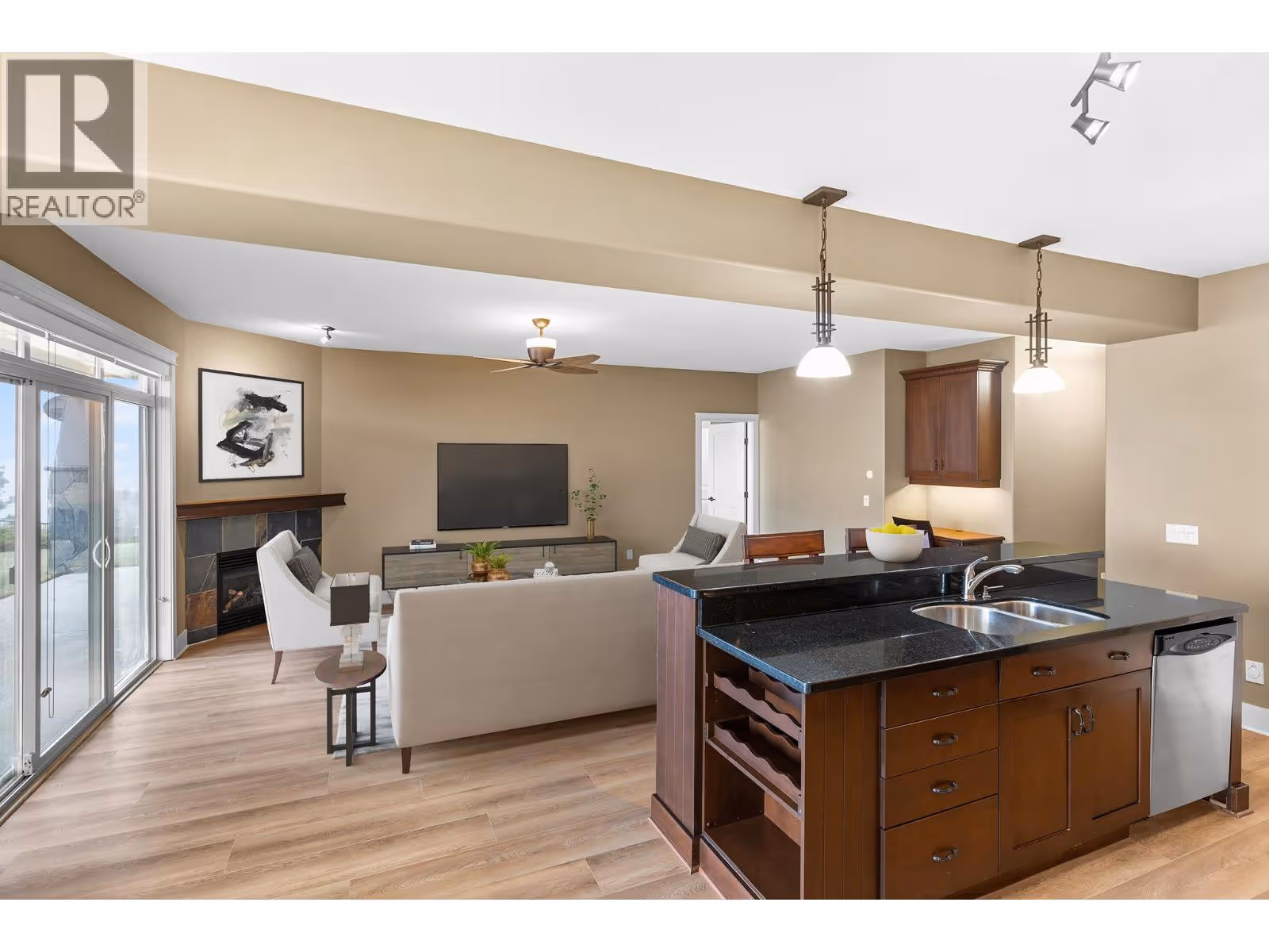 Discover 1588 sq. ft. of luxurious one-level living in this beautiful 2-bedroom, 2-bathroom end-unit townhome, offering breathtaking lake views and an expansive 290 sq. ft. patio. Perfectly designed for both everyday living and a serene summer retreat. Step inside to find an open-concept great room with stunning lake views. The gourmet kitchen is a chef's dream, featuring sleek granite countertops, a large island, stainless steel appliances, and a spacious pantry for all your storage needs. The adjoining dining and living areas boast brand-new wide plank laminate flooring, while in-floor heating and central air units ensure year-round comfort. The cozy gas fireplace adds a touch of elegance to the space. The spacious master suite offers a true retreat, with a luxurious 5-piece ensuite and a generous walk-in closet. A second bedroom, which can also be used as a den, provides versatile living options. This unit offers plenty of storage space, including a conveniently attached single-car garage, one of the few attached garages in the complex! This home is ready for you to move in and enjoy. Don’t miss out on this remarkable opportunity to own a piece of paradise at Eagles View! Eagles View is an exceptional gated community with a vibrant community, clubhouse, gym, RV parking, and ample visitor parking available. (id:58842)